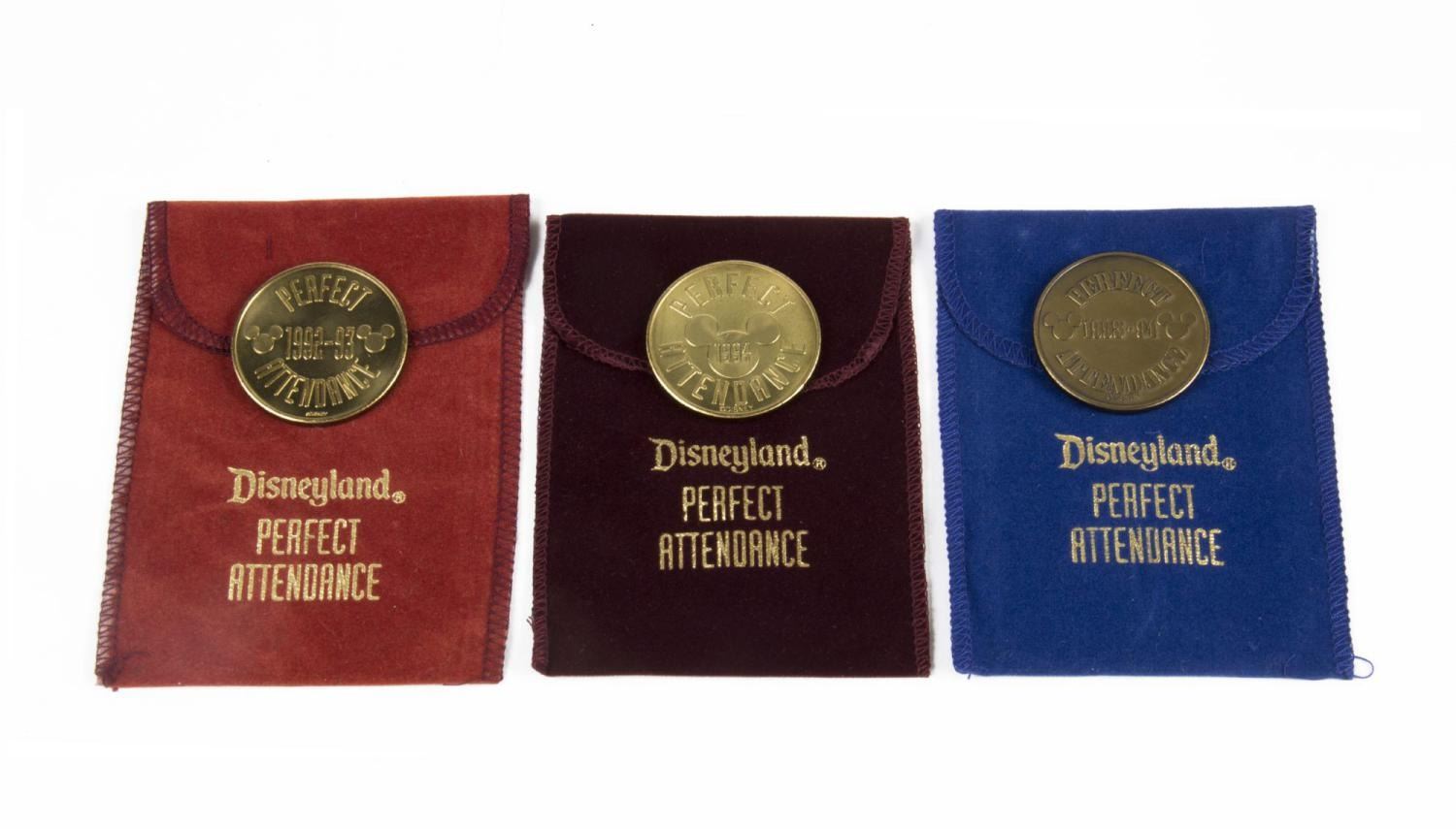 (Disneyland, 1992-94) Three Cast Member "Perfect Attendance" award coins in their original, velvet pouches. The coins for years 1992, ‘93, and ‘94 each feature a different image of the White Rabbit from "Alice in Wonderland" on one side, and the words "Perfect Attendance" with the specific year on the other. The brass coins measure 1.5" in diameter and are in very good to fine condition with very faint tarnish, and light areas of text loss to the velvet pouches.