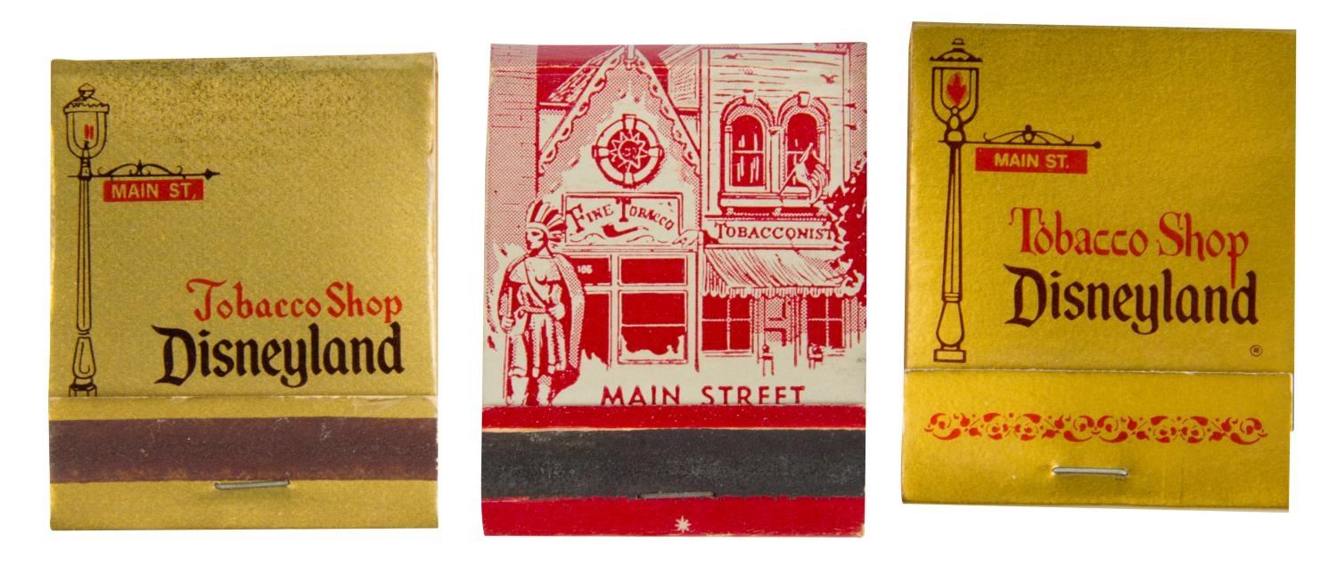 (Disneyland, 1950s-70s) A pair of unused Disneyland Tobacco Shop matchbooks and a Tobacconist matchbook from the Fine Tobacco store on Main Street, U.S.A. Measuring 1.5" x 2" each, the matchbooks are in good to very good condition with light creases, scratches, discoloration from age, and wear.
