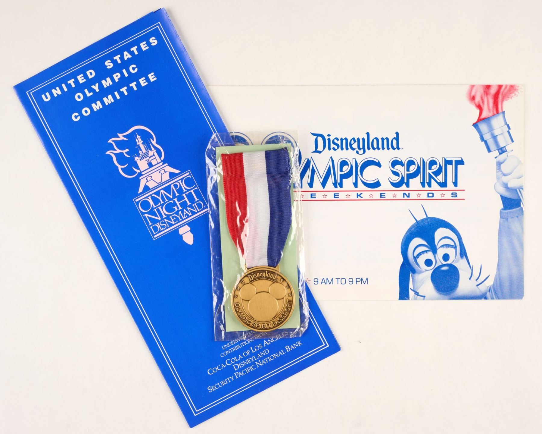 (Disney, 1983-84) Three souvenirs from Olympic Night at Disneyland, an event held by USOC before the 1984 Olympics. Included are an event flyer with an entertainment schedule and a list of athletes attending, an Olympic Spirit Passport medal, and a program for Olympic Spirit Weekends. Ranging in size from the 4.25” x 1.5” medal to the 9” x 4” flyer, the items are in very good condition with minimal edge and corner wear to the program and flyer with light discoloration from age. The medal is in fine as-new condition in the original packaging.