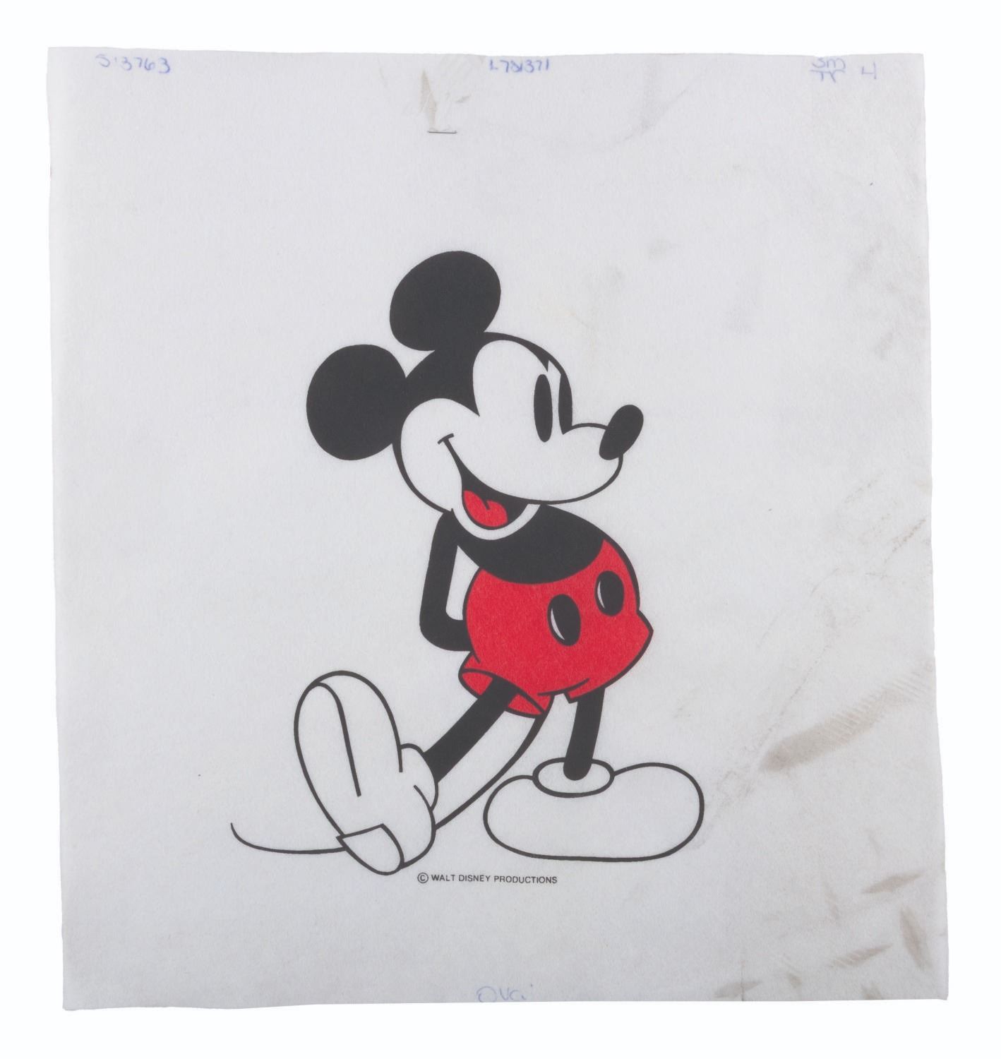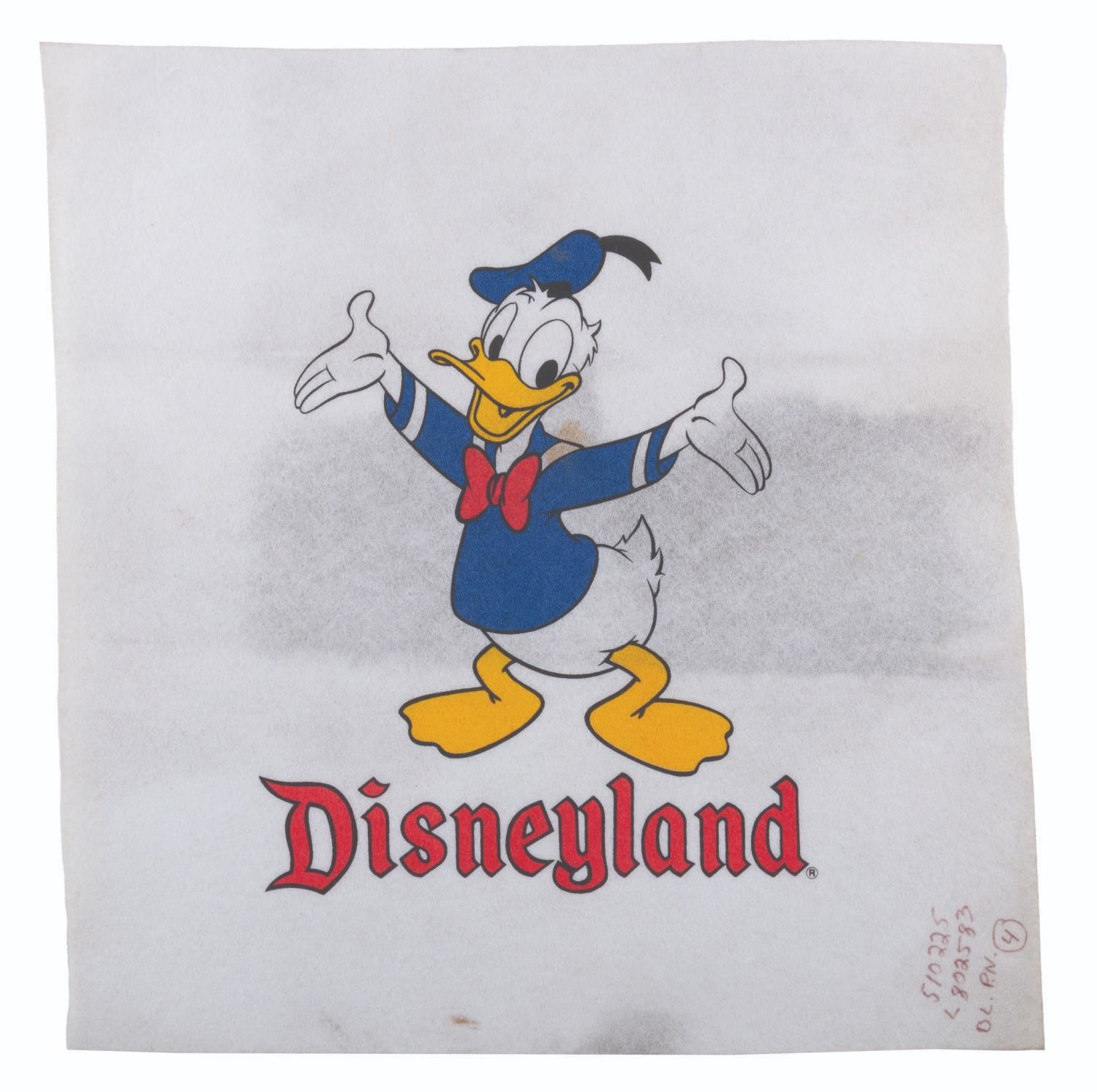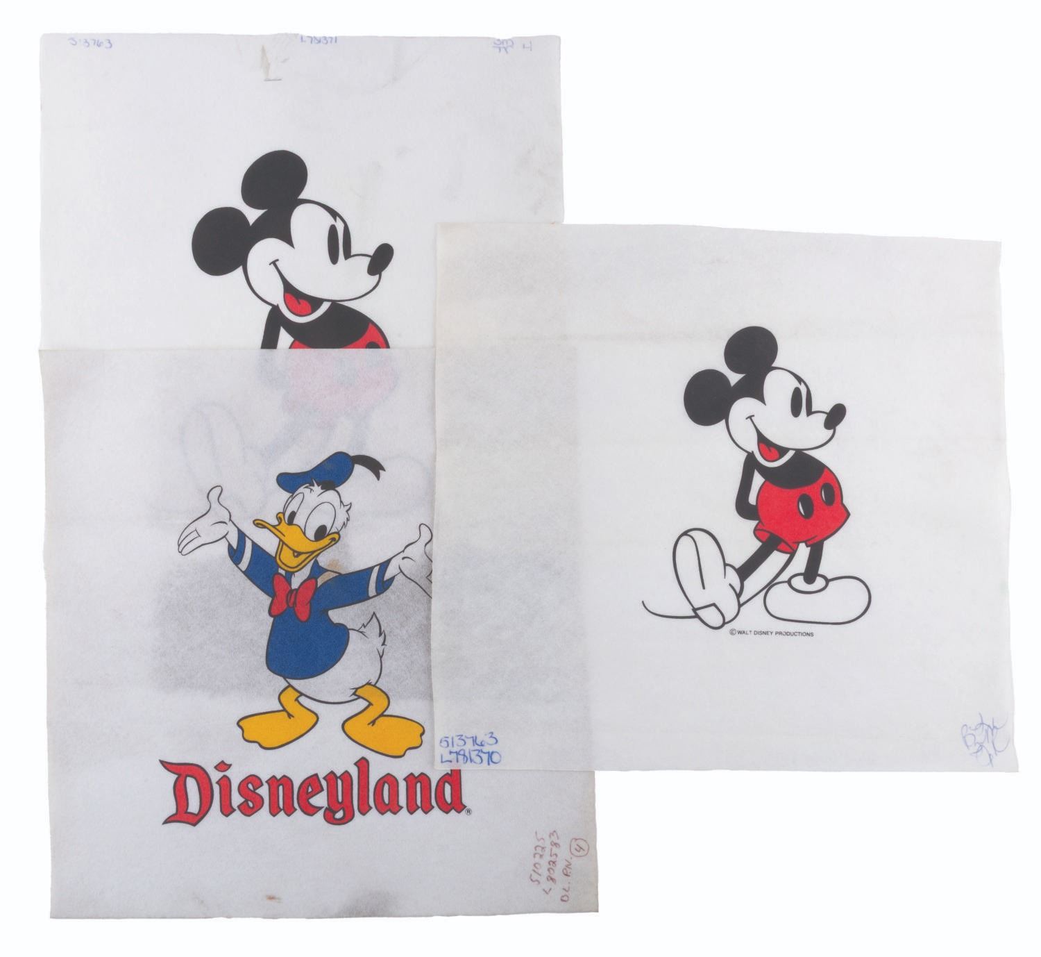 (Disneyland, 1970s-80s) Three production used designs for Disneyland souvenir t-shirts featuring Mickey Mouse and Donald Duck. Measuring 14.75" x 16" and 15" x 15.75", the felt designs display in good to very good condition with stains and notations to the corners in ink.