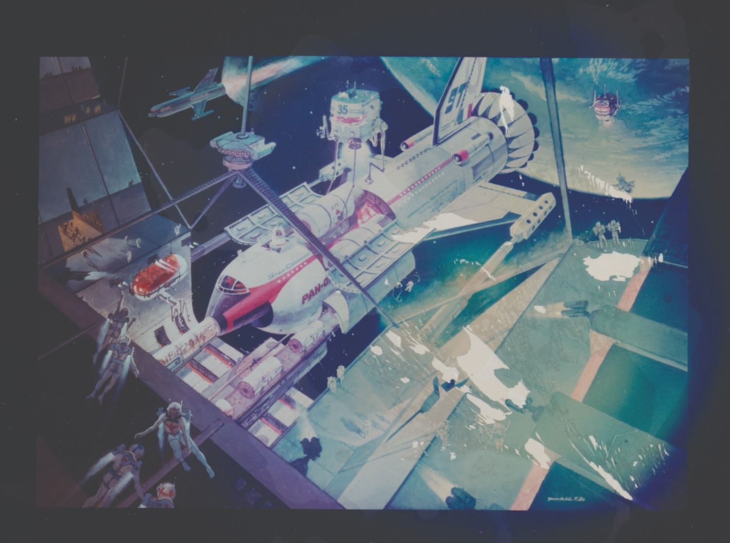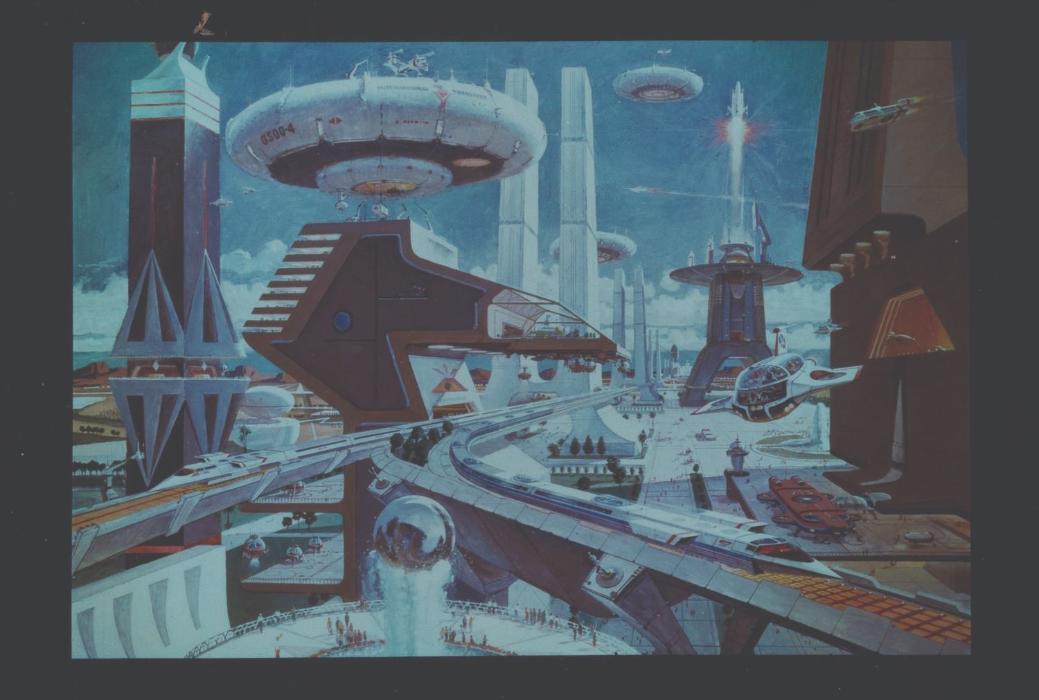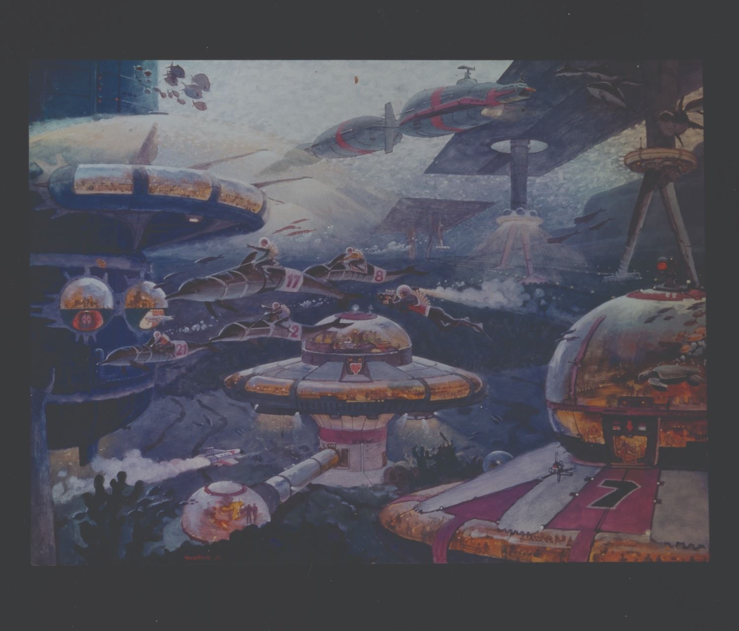(EPCOT, 1980s-90s) Three transparencies of artwork seen in the Horizons queue at EPCOT Center. These images were projected onto the viewport screen to show Mesa Verde, Sea Castle Underwater City, and Brava Centauri, in artwork by Robert McCall. Measuring 8" x 10", the transparencies are in fair to good condition with moderate wear from long-term projection, including melted emulsion, warping, scuffs, and scratches.