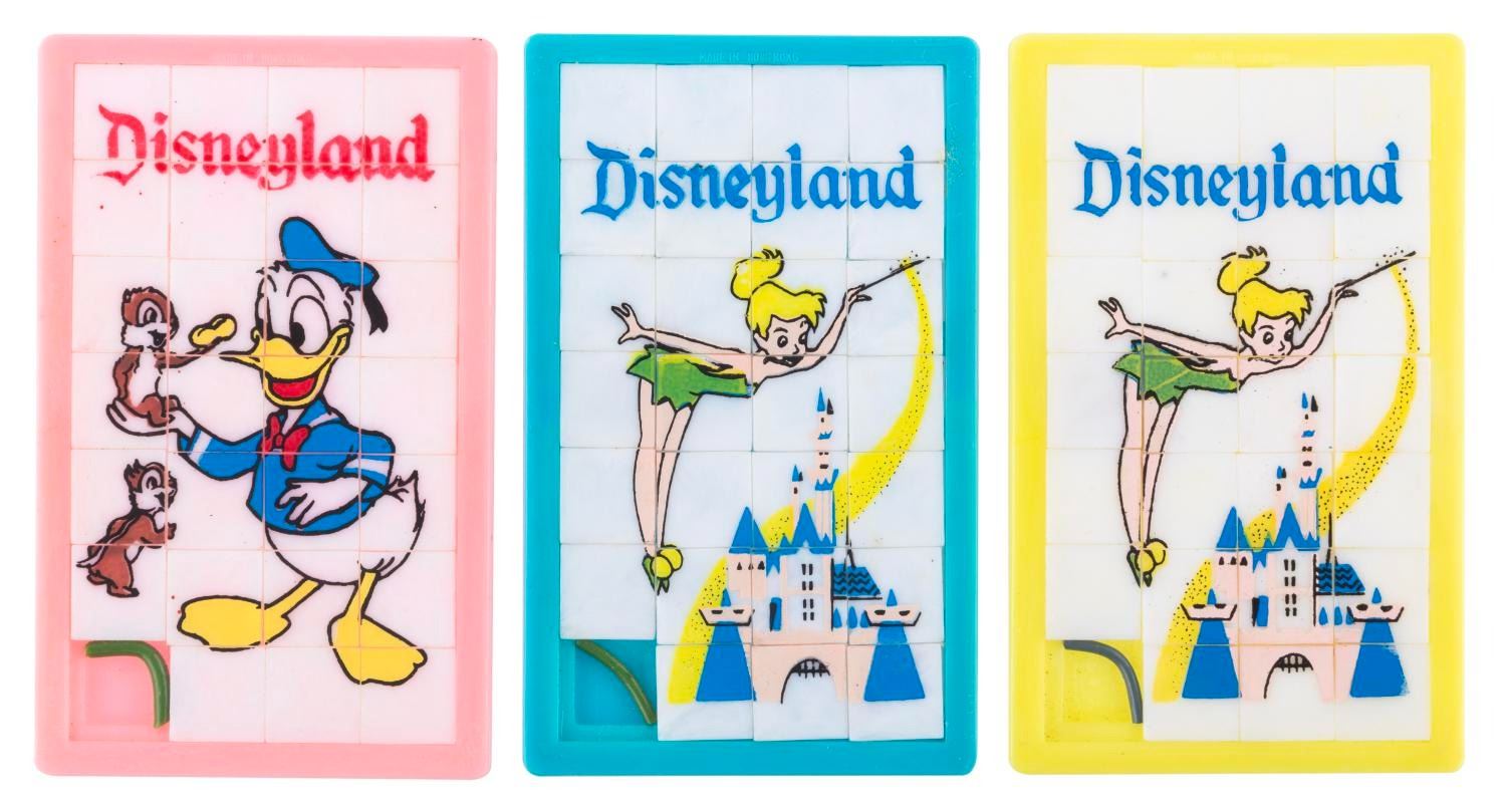 (Disneyland, 1960s-70s) Three Disneyland slide puzzles, one featuring Donald Duck with Chip ‘n Dale and two with Tinker Bell and Sleeping Beauty Castle. Measuring 2.5” x 4” x 0.25” each, the puzzles are in very good unused condition with light scratches and the original plastic tab holding the pieces in place.