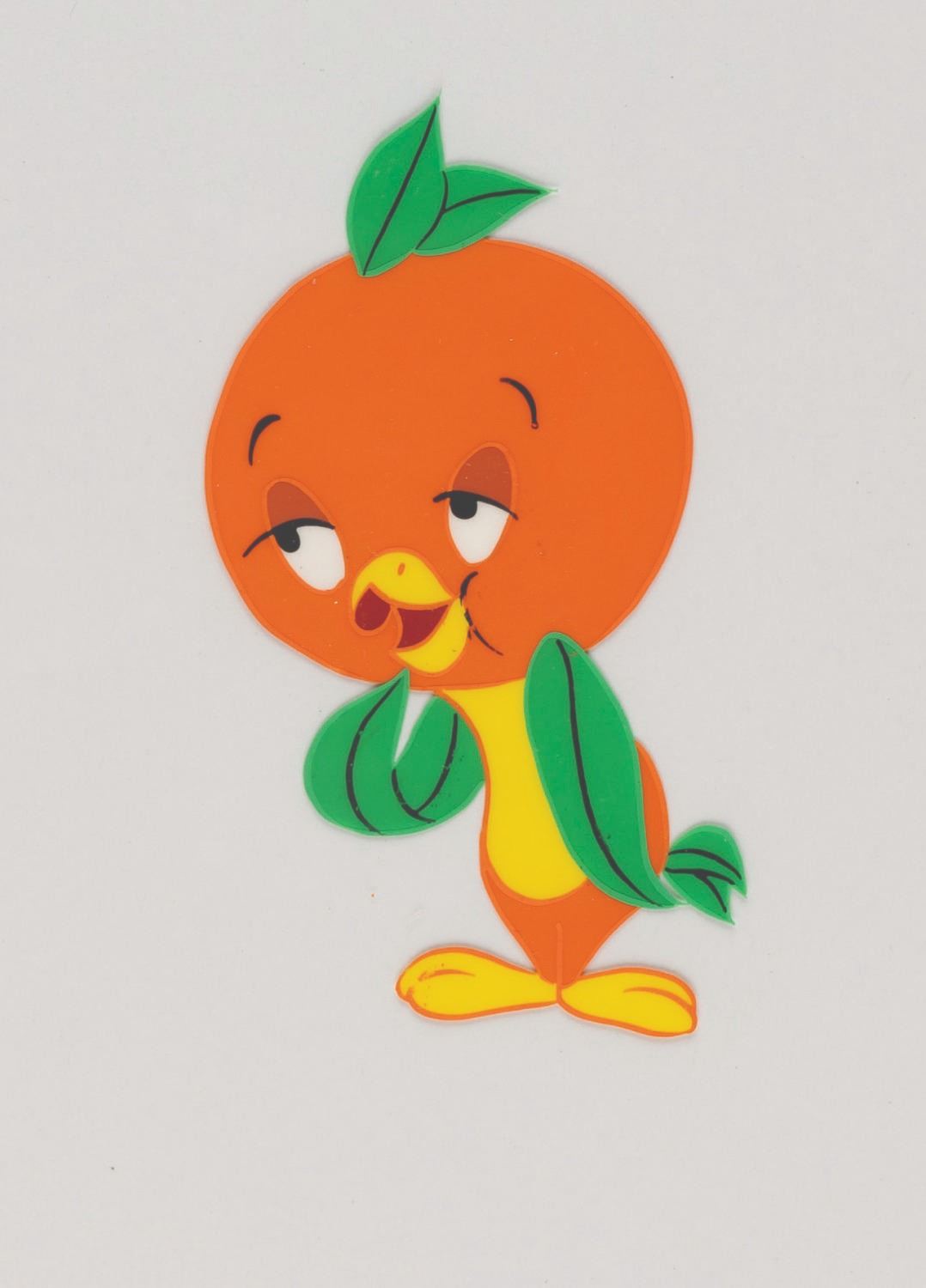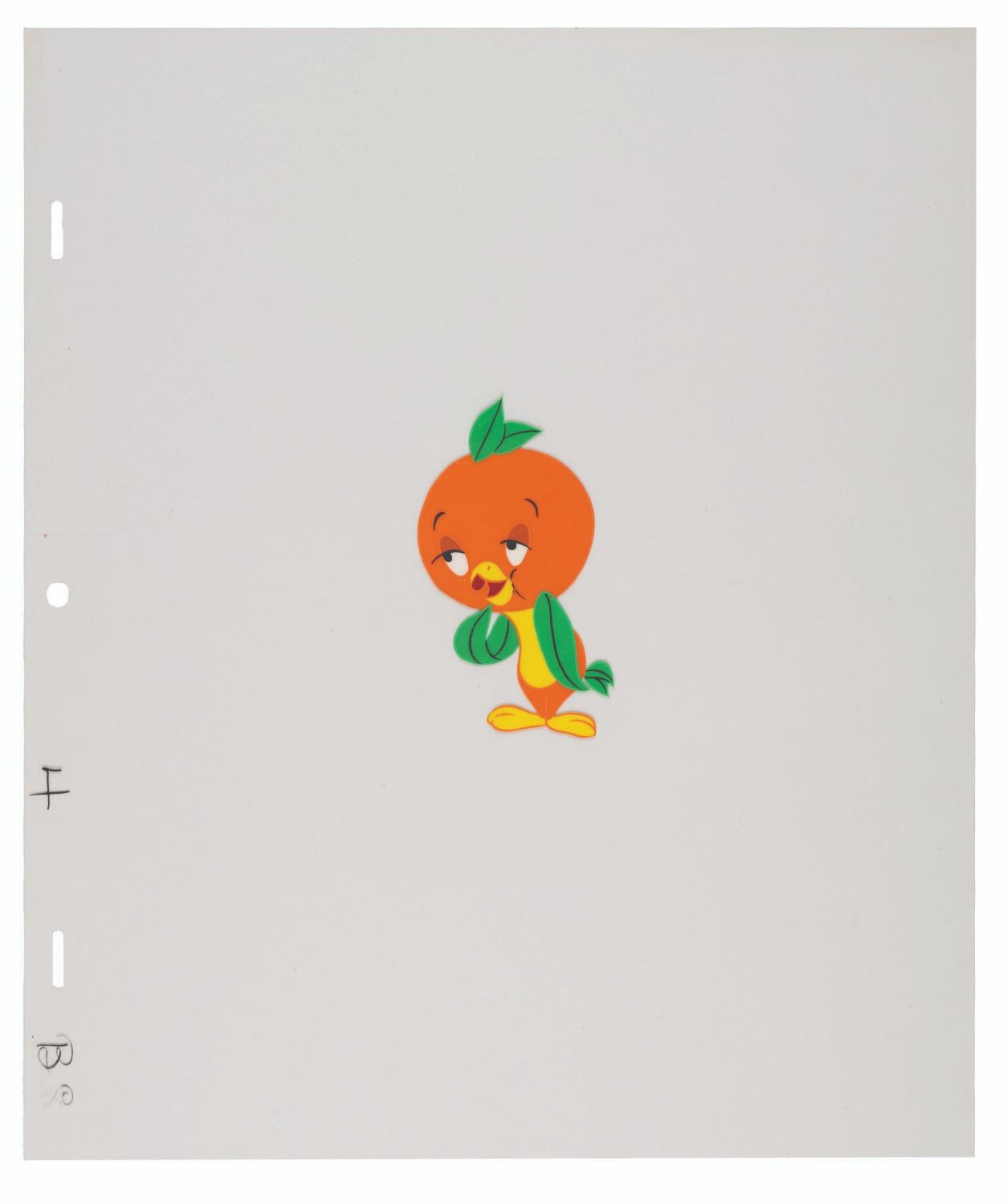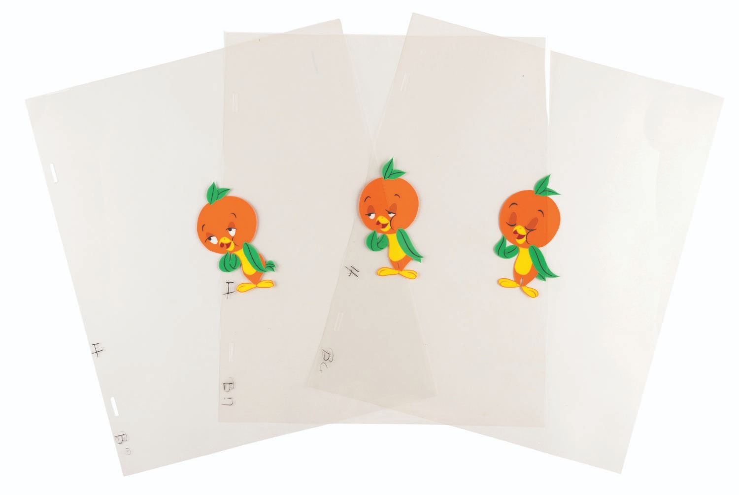 (Walt Disney World, 1970s) Three hand-painted animation cels of the Disney-created mascot of Florida Citrus, the Orange Bird. The untrimmed cels measuring 10” x 12” with a character image size of 4” x 2.5” are in very good condition with light wear.