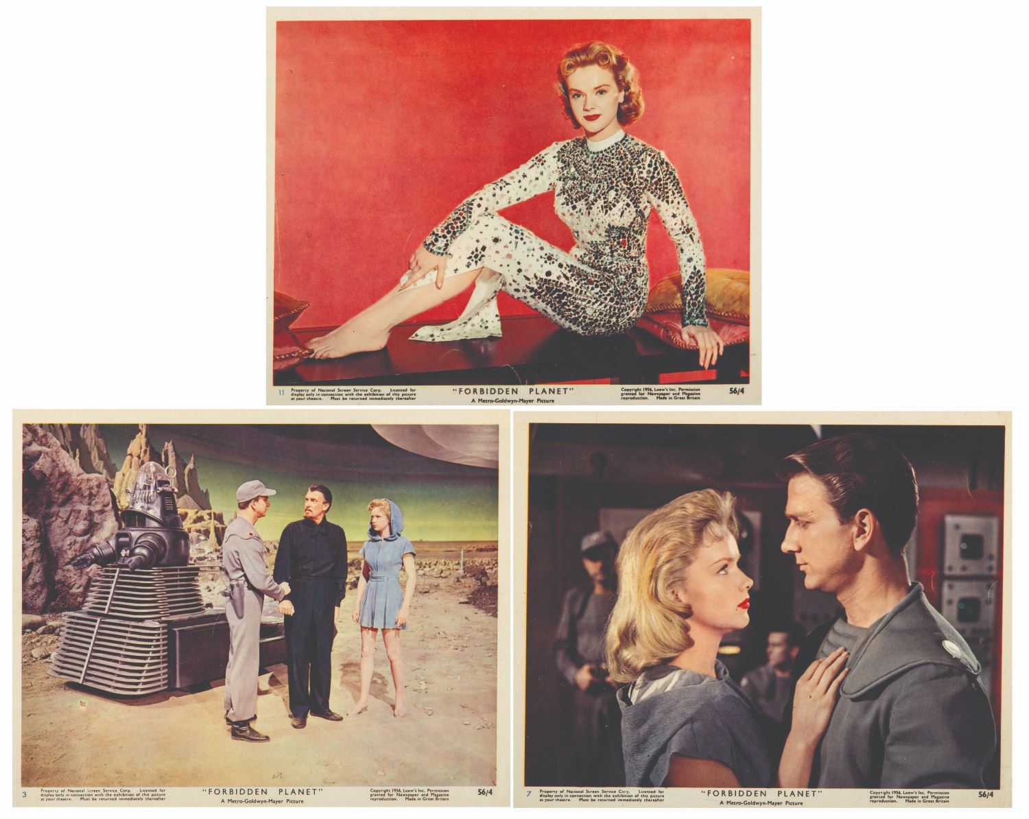 (MGM, 1956) Three publicity photos for “Forbidden Planet” featuring Commander John J. Adams (Leslie Nielsen), Alta (Anne Francis), Doctor Edward Morbius (Walter Pigeon), and Robby the Robot. Measuring 8" x 10", the photos are in good to very good condition with light edge wear and creasing.
