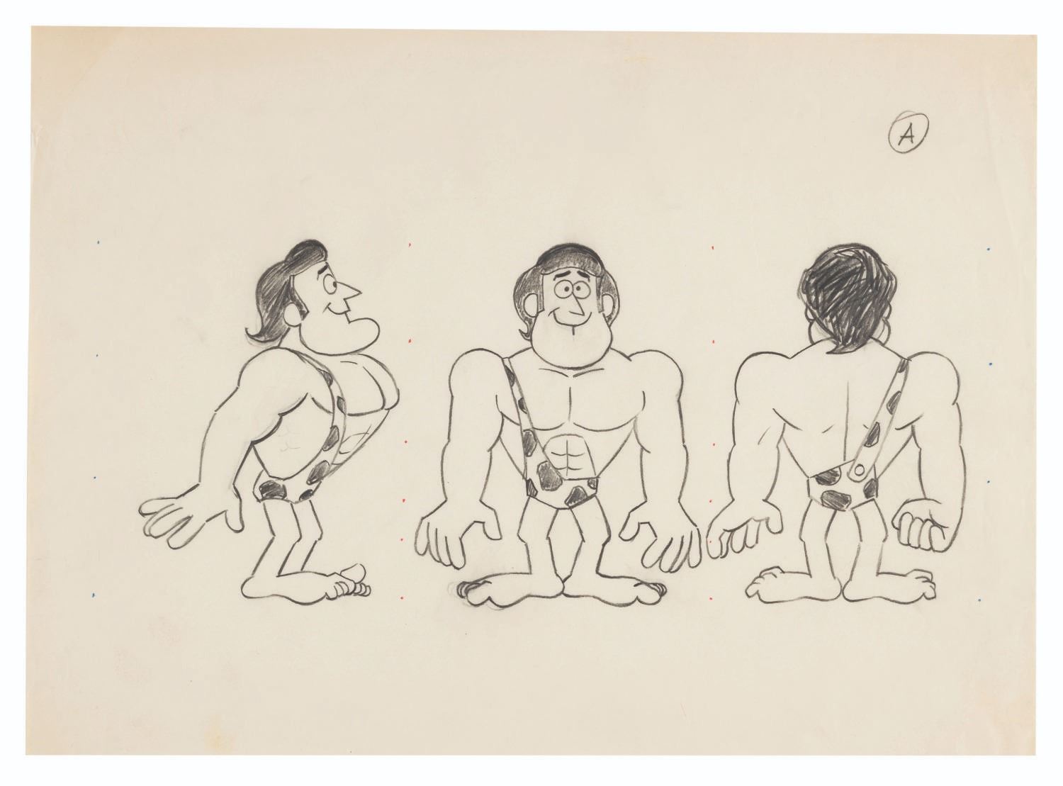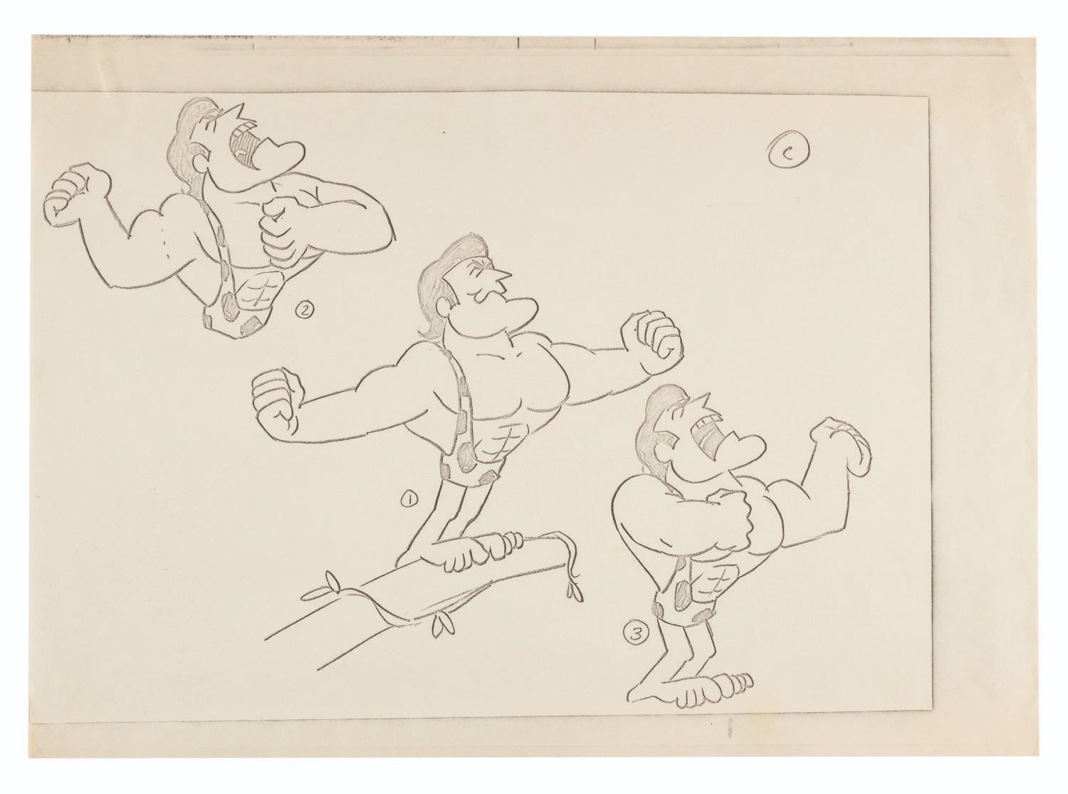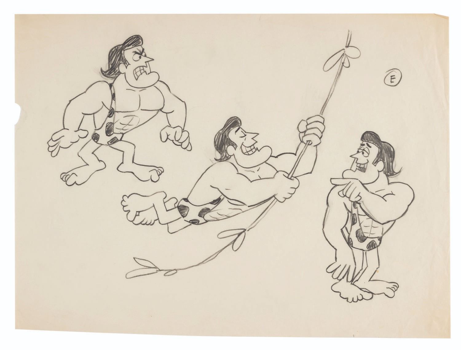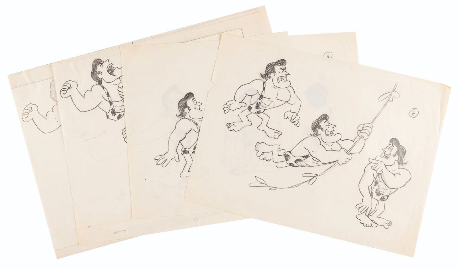 (Ward, 1967) Three pages of original model drawings from “George of the Jungle” labeled “A,” “C,” and “E,” showing George in action poses. Included in the lot is a photocopy of the page labeled “C.” With image sizes ranging from 5” x 10” to 8.75” x 11.5” on 9.5” x 12.5” animation paper, the graphite drawings are in good condition with creases, folds, stains, and wear from production use, while the 10” x 14” photocopy is in very good condition with light creases.