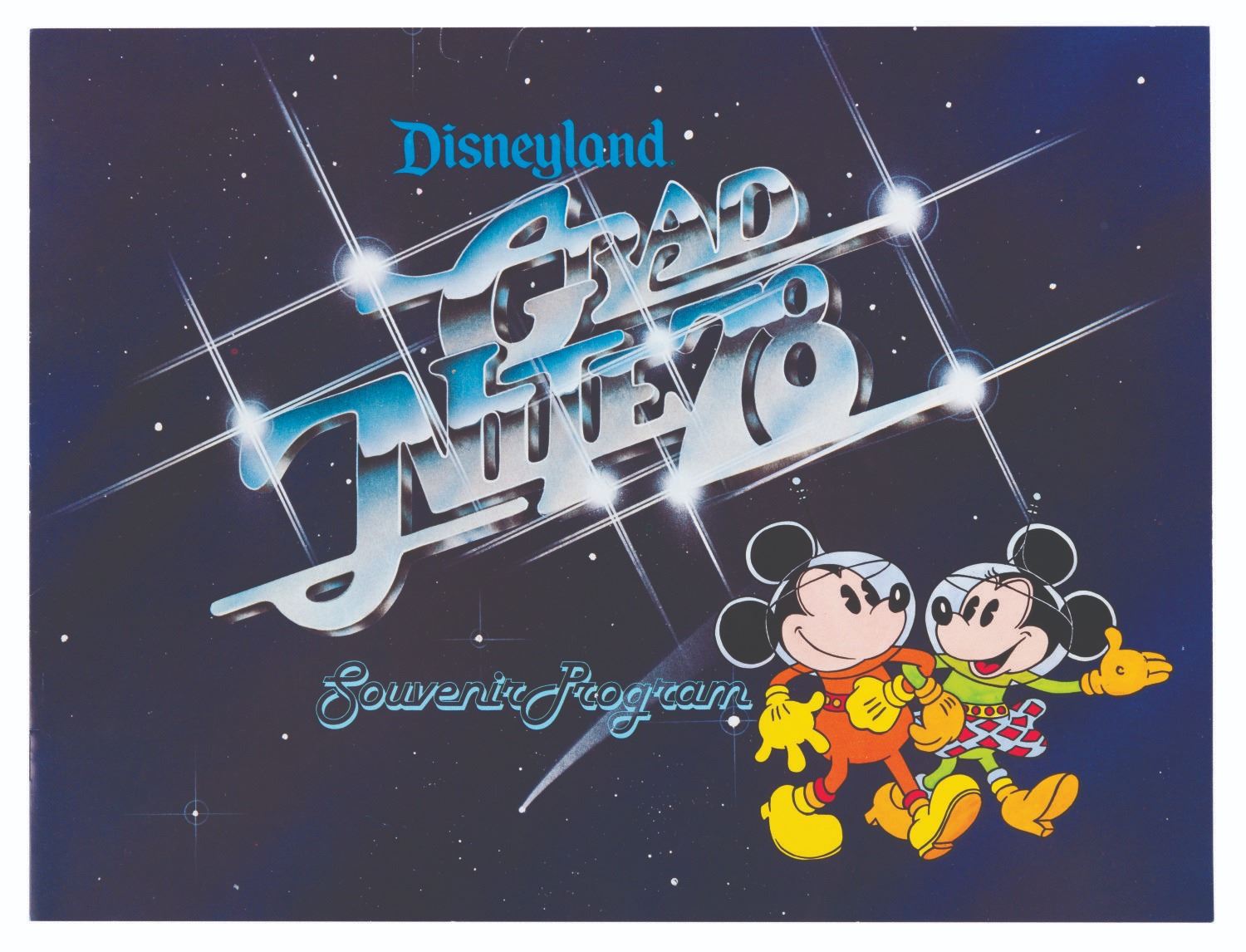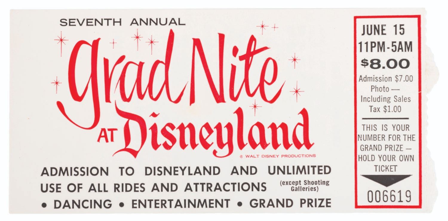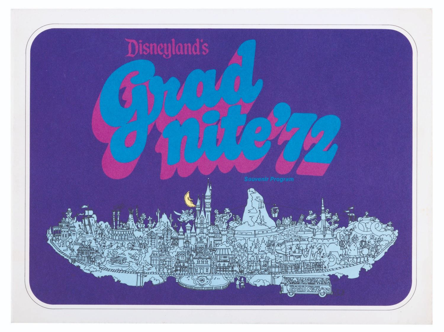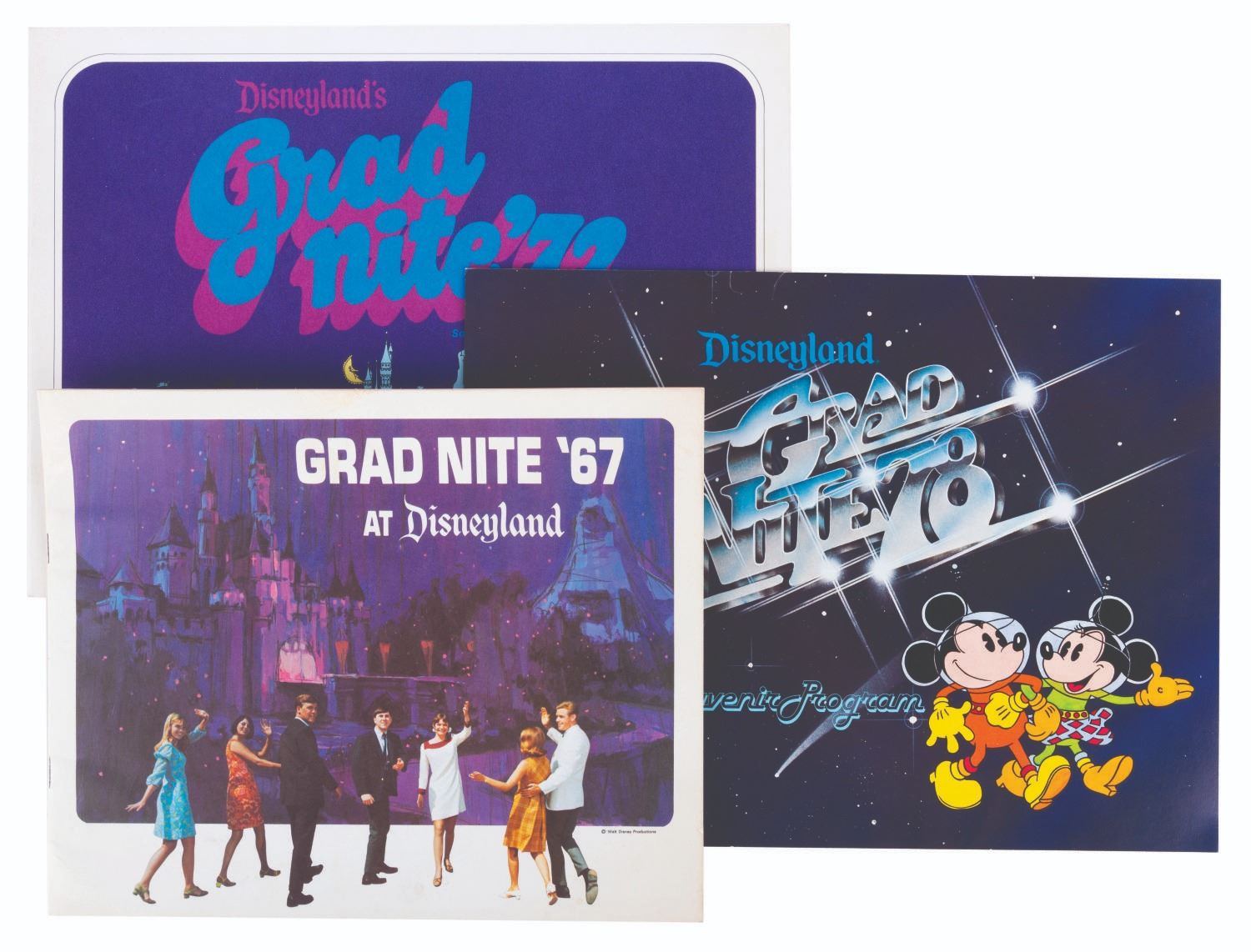 (Disneyland, 1967-78) A Disneyland Grad-Nite collection including souvenir programs from 1967, 1972, and 1978; and a ticket and program from 1967. The annual all-night party for graduating high school seniors started as an alternative to unsupervised celebrations. The souvenir programs measure 9" x 12" and are in very good condition with light handling wear. The '67 program measures 7.25" x 5.5" and is in good condition with small creases, and discoloration to the back. The '67 ticket stub is in very good condition with the right edge torn at the perforation as intended.