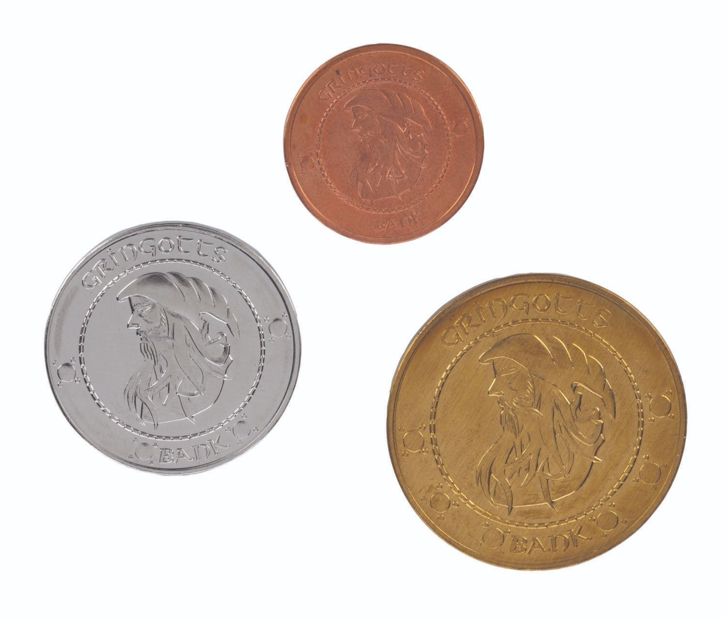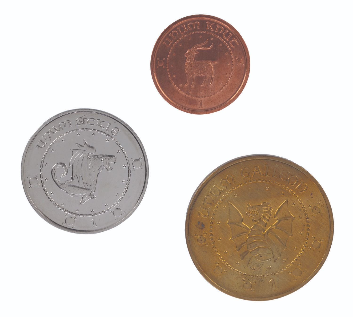 (Warner Bros., 2001) A set of (3) prop coins from Harry Potter and the Sorcerer's Stone (also known as Harry Potter and the Philosopher's Stone). The books called for (3) coins in the wizarding world, so Galleons, Sickles, and Knuts were designed in house at Leavensden Studios, and manufactured at a real coin mint in the United Kingdom. The largest Galleon coins were mostly seen in the Gringott Bank scenes, while smaller Sickles and Knuts were most extensively seen being used by wizards in Diagon Alley. Measuring from 1" to 1.5" in diameter, the (3) prop coins are in very good production-used condition, with slight wear including small scratches to the Galleon.