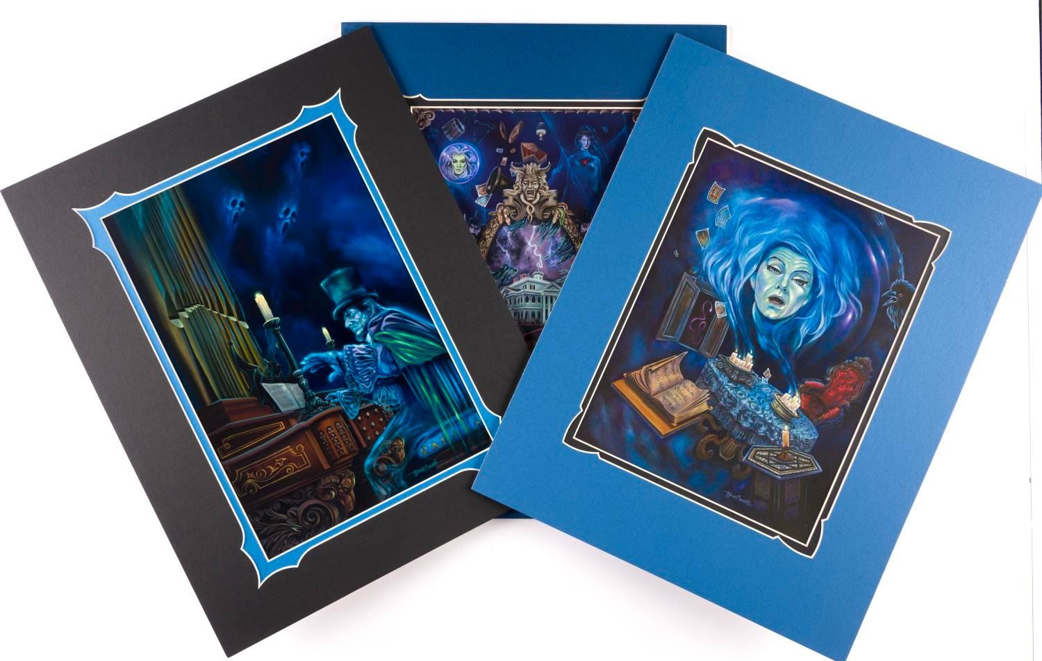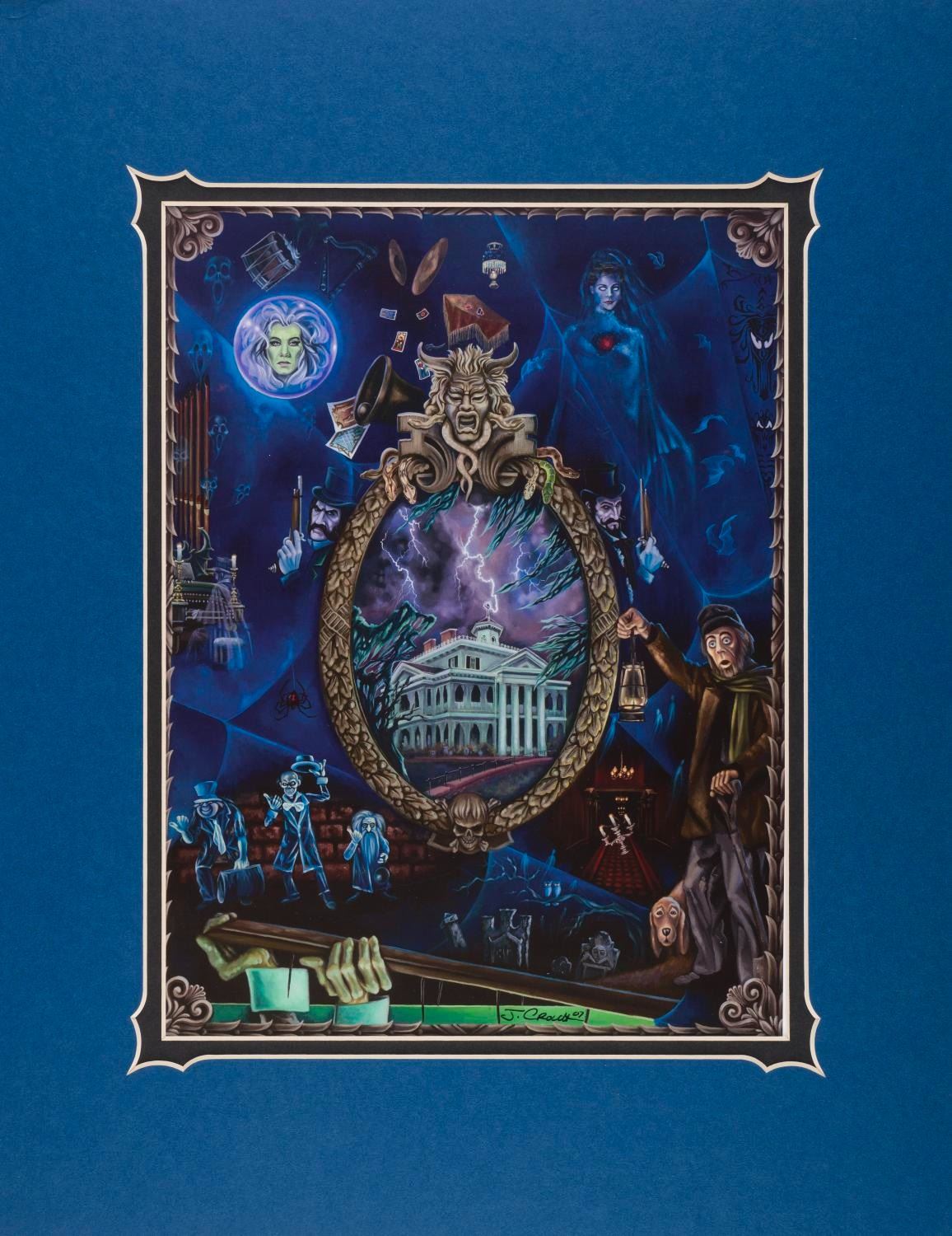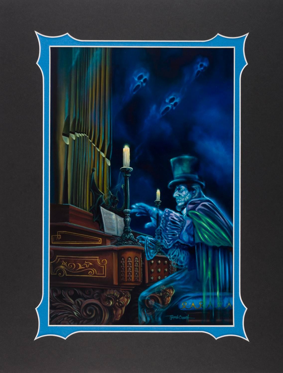 (The Art of Disney Theme Parks, 2007-09) Three Disneyland Haunted Mansion Prints by James Crouch featuring the "Happy Haunts" of the Mansion including the Organist and Madame Leota. Each piece comes within its 14" x 18" matte and is in fine condition.