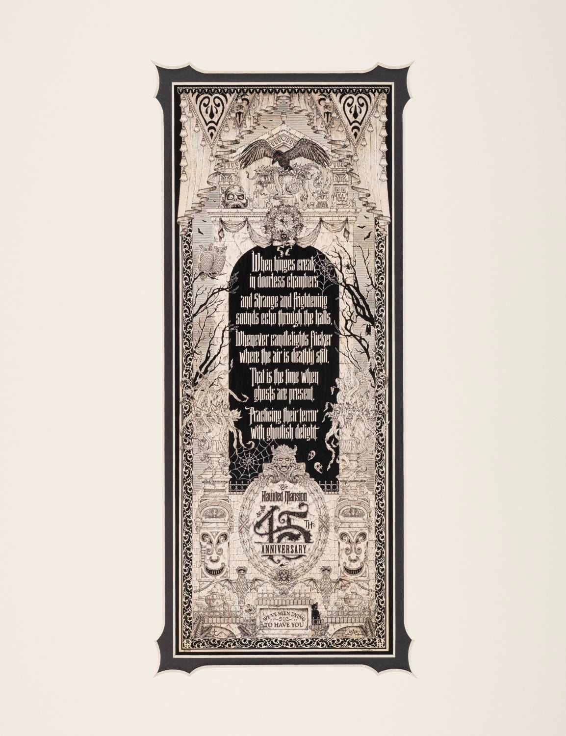 (Disney Parks, 2009-19) Three Haunted Mansion Prints by Jeremy Fulton, released during the 40th, 45th, and 50th anniversaries of the attraction. Among this lot are "Creepy Old Crypts," "50 Years of Ghoulish Delight," and one other. Measuring 18" x 14", each piece is in fine condition, with two retaining their biographies.