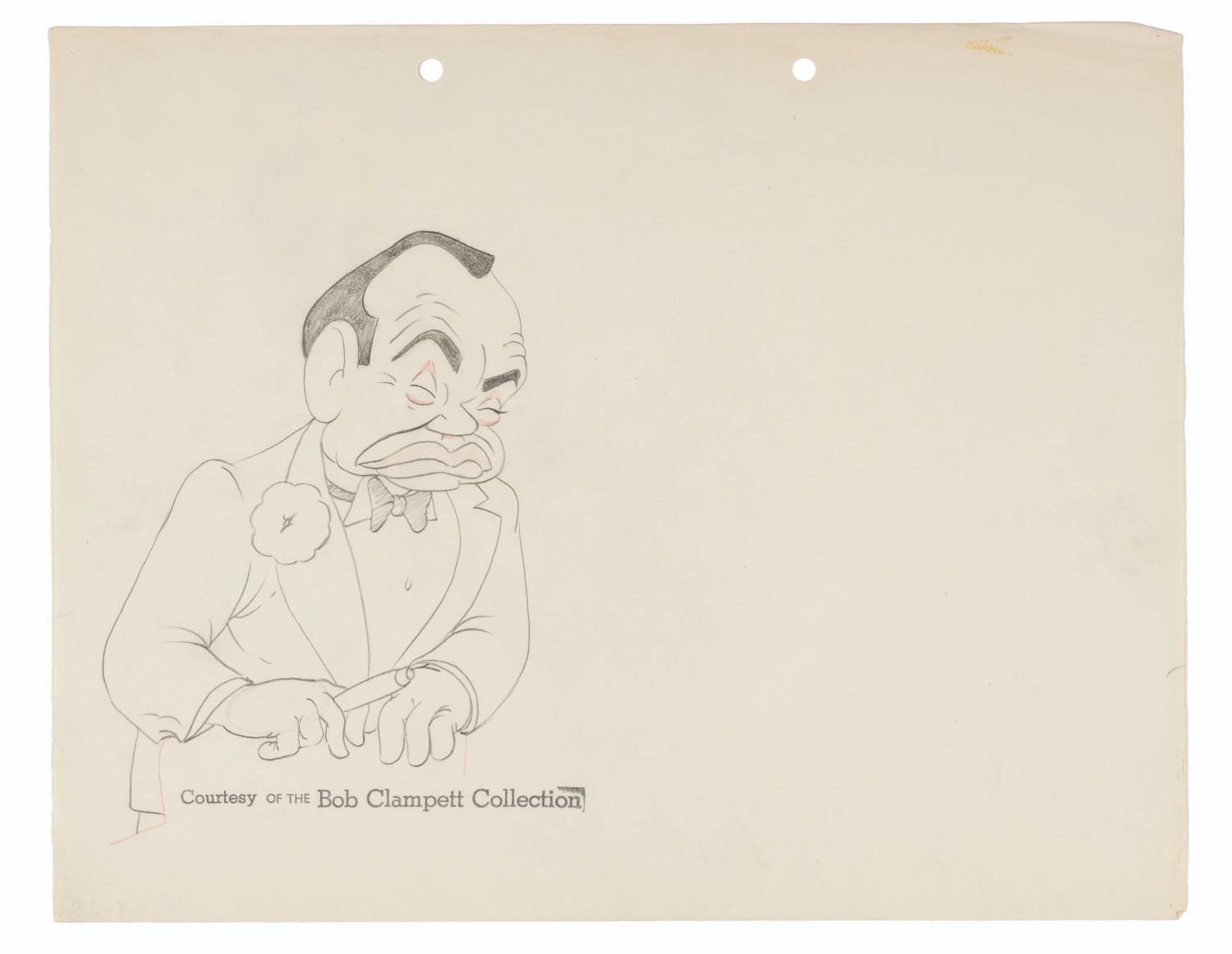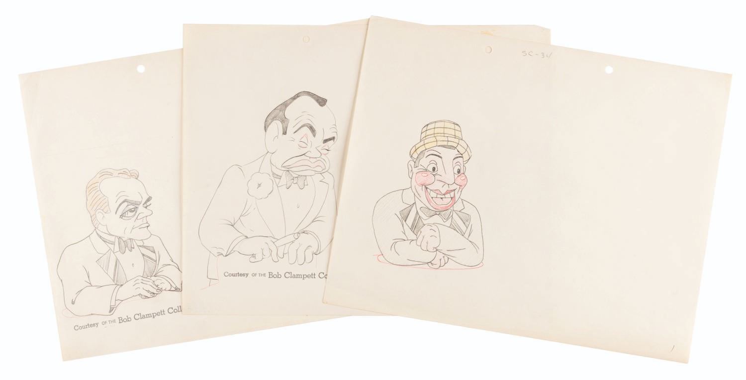 (Schlesinger, 1941) Three model drawings of Edward G. Robinson, James Cagney, and Joe Penner from the Merrie Melodies short, “Hollywood Steps Out.” The scene planned with Joe Penner was not produced because he died during the short's production, and it was deemed inappropriate to include it. With character image sizes from 4.75” x 4” to 6.5” x 4.5” on 9.5” x 12” animation paper, the graphite and colored pencil drawings are in good condition with light creasing, edge wear, pinholes from production use, and a 0.5” x 0.25” area of tape residue on the Robinson drawing, and light discoloration from age.