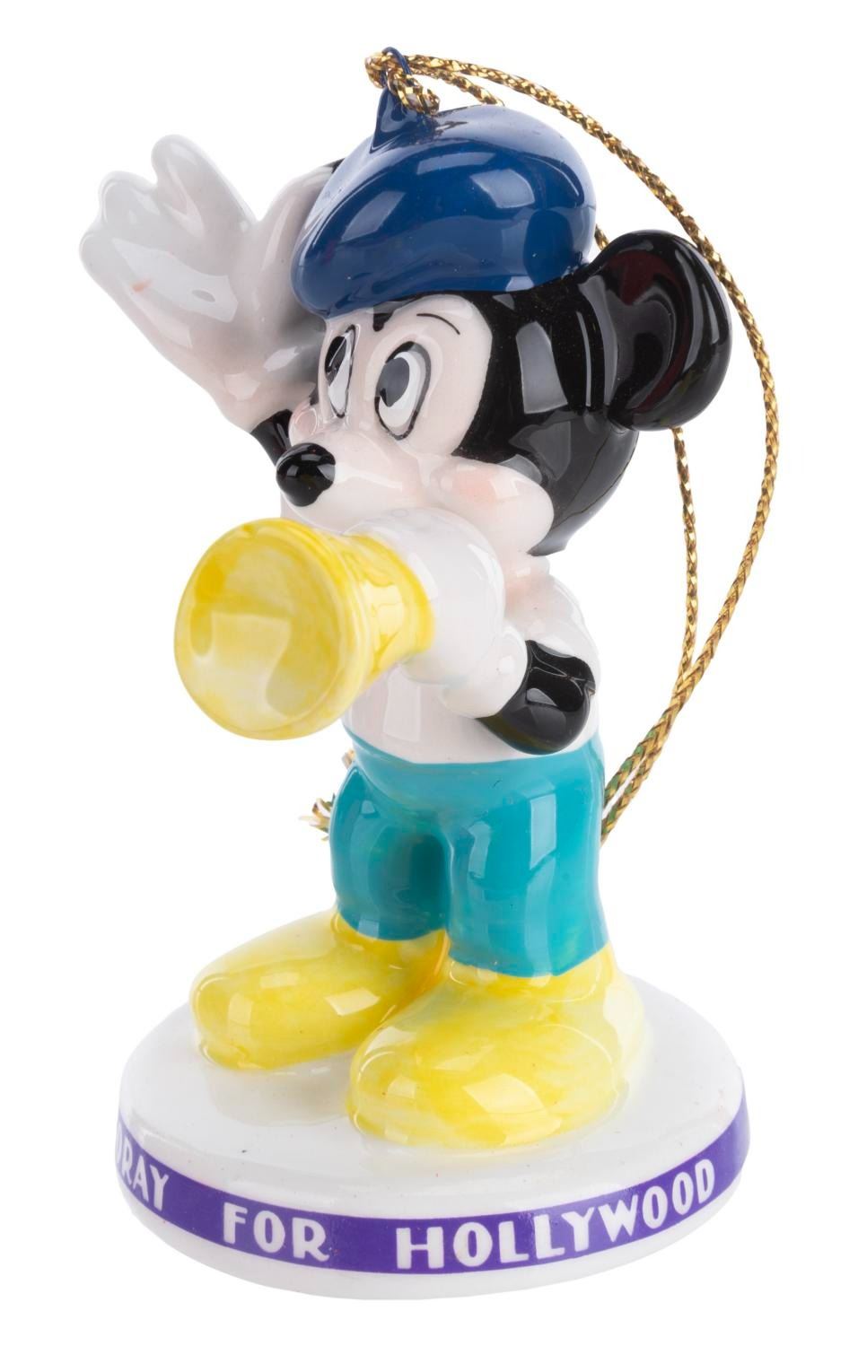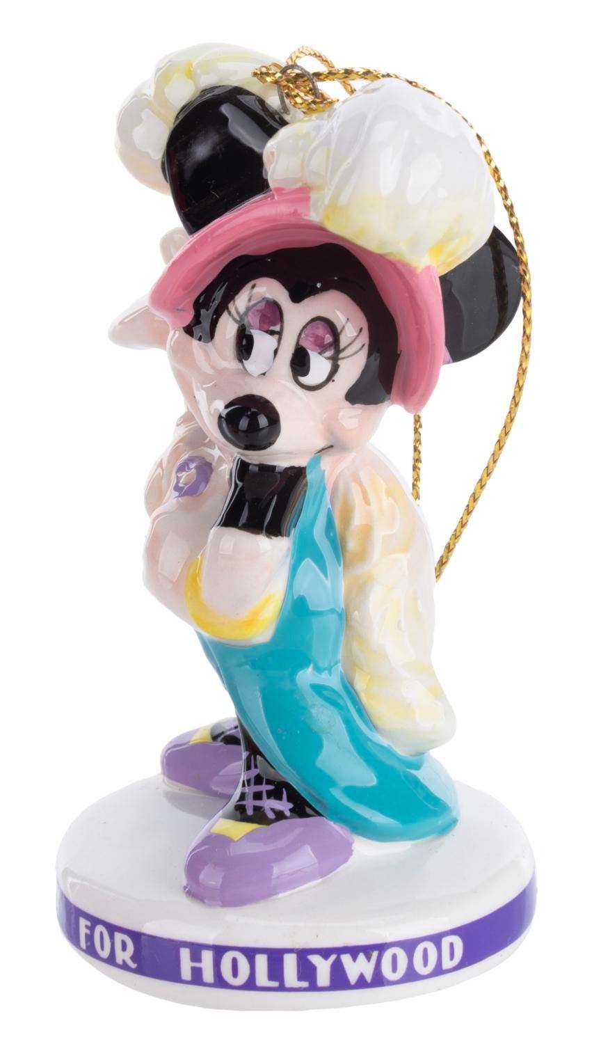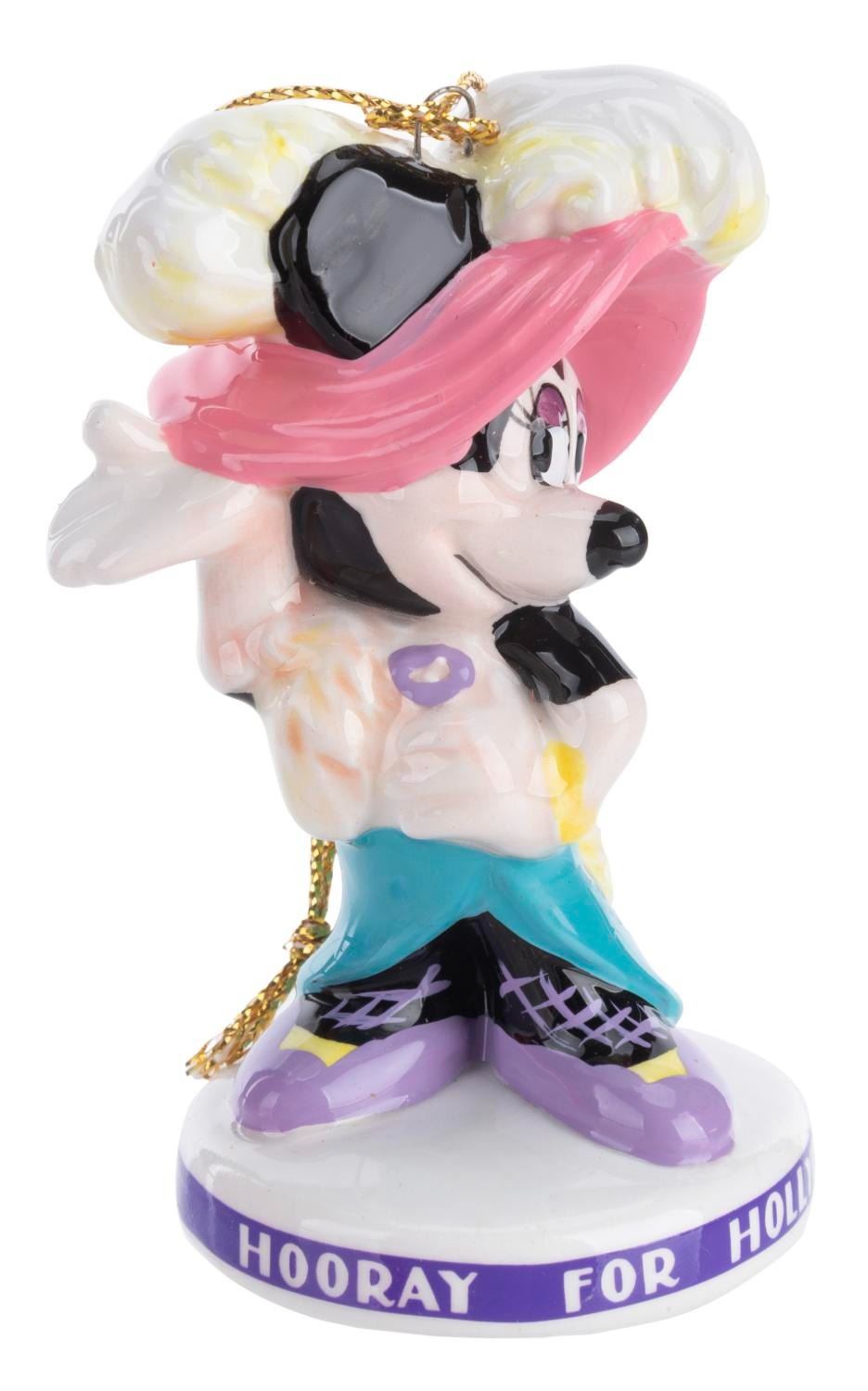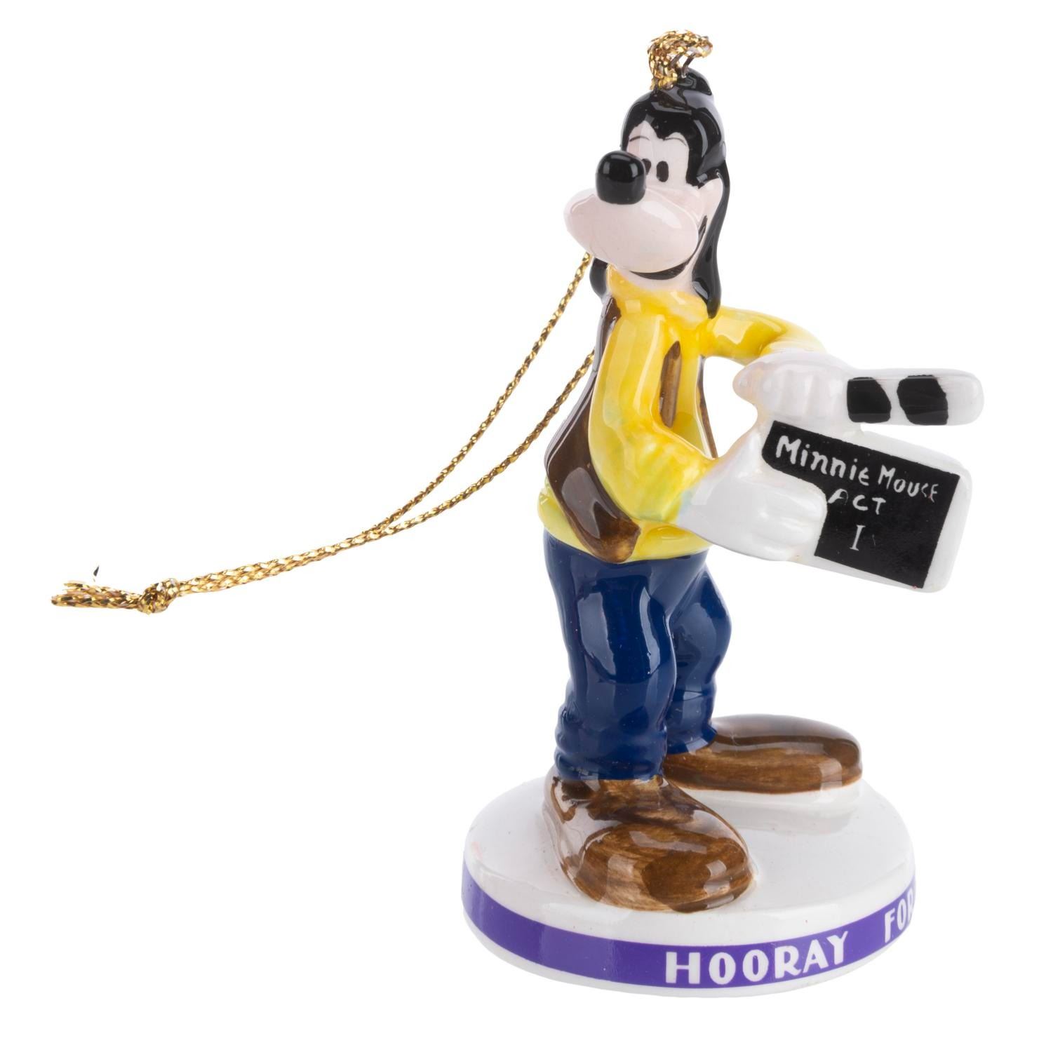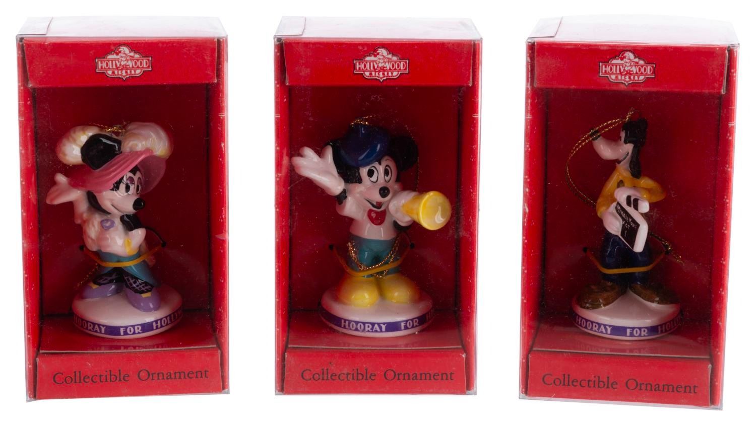 (Schmid, 1980s) Three Disney Characters "Hooray for Hollywood” Collectible Ornaments featuring Mickey, Minnie, and Goofy. Measuring 1.75” x 3” each, the ornaments are in fine condition and come with the original boxes.