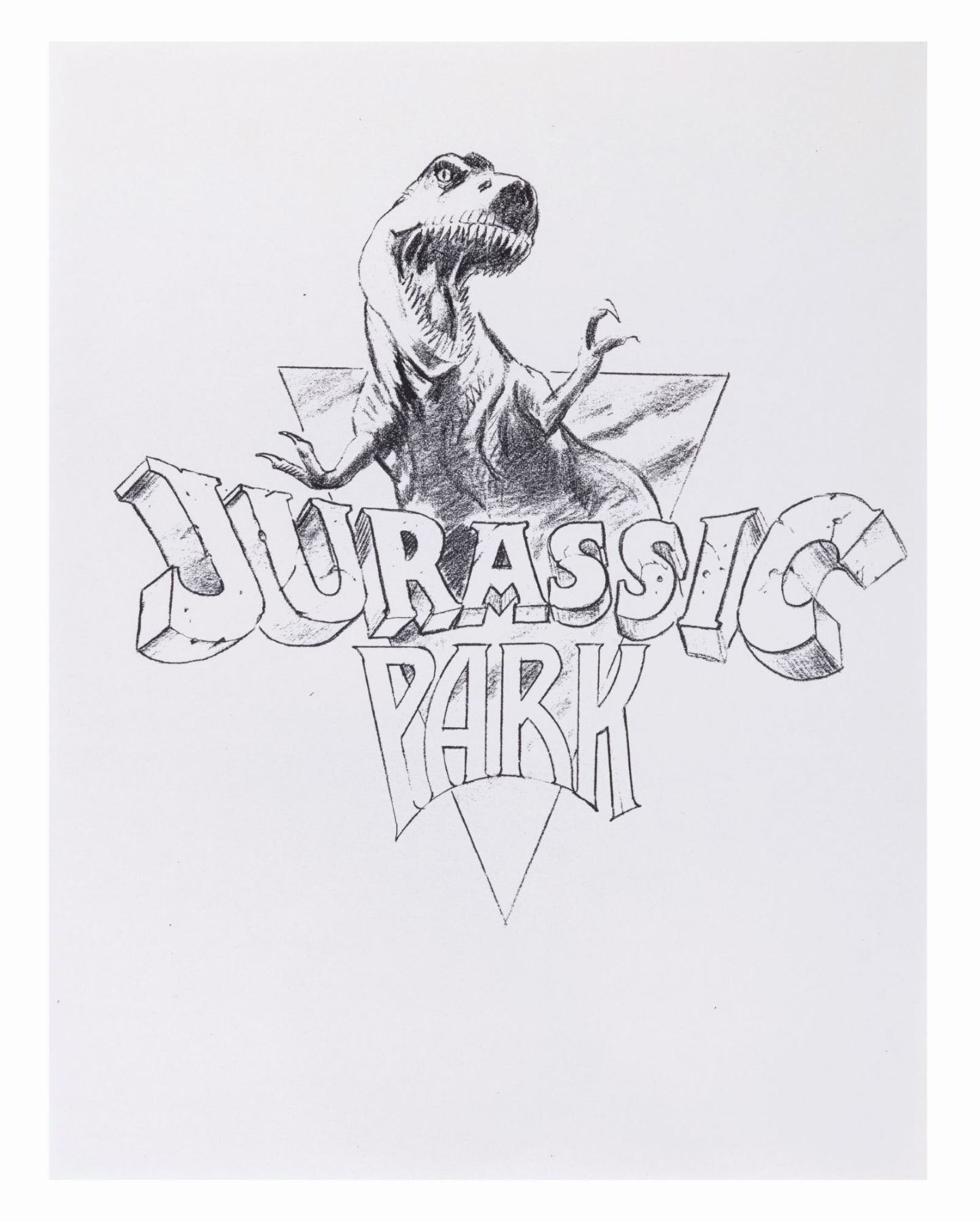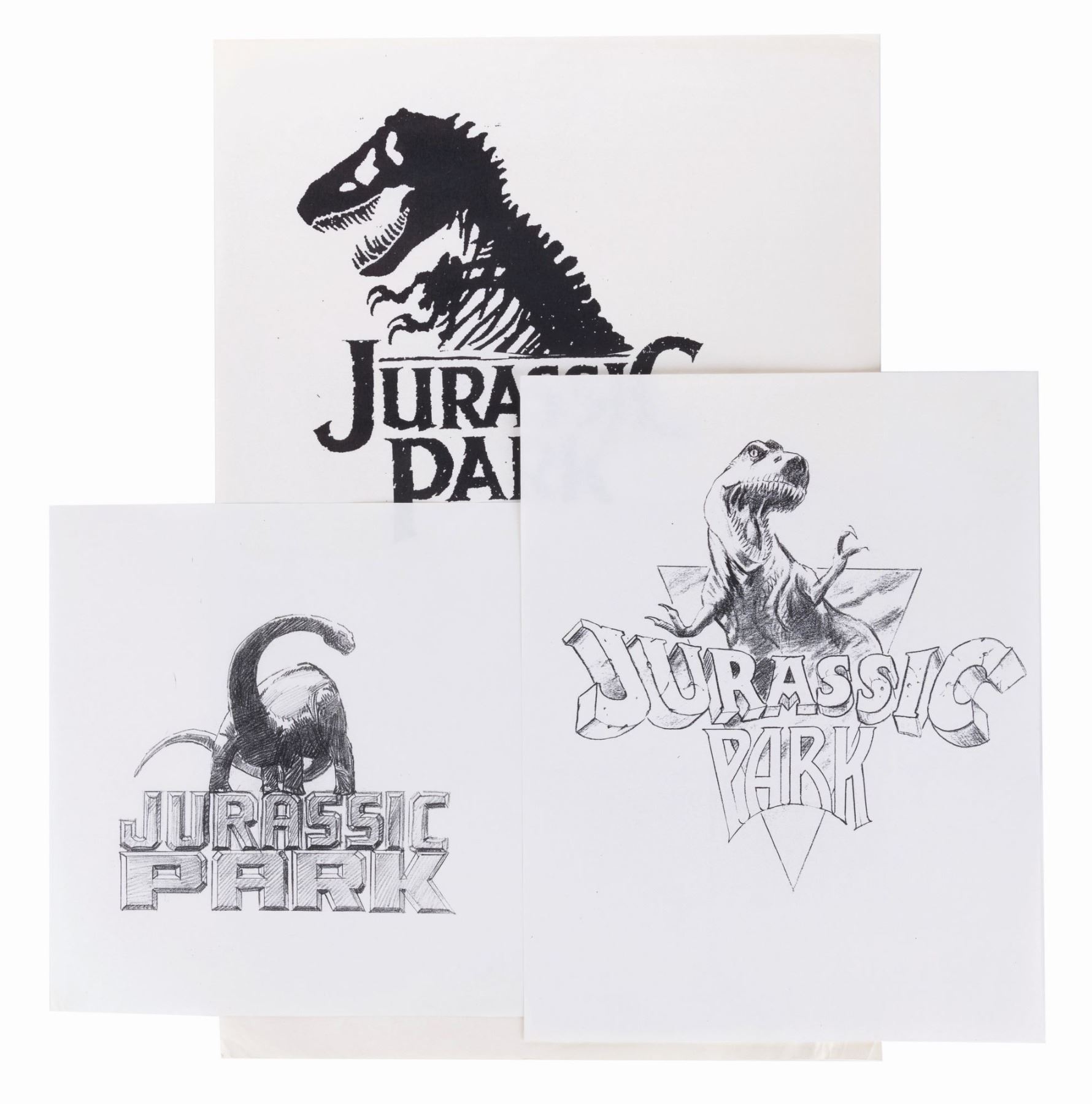 (Universal, 1993) Three prints of design concepts for the "Jurassic Park” logo. Ranging in size from 8.5” x 11” to 11” x 17”, the prints are in very good condition with edge wear and creasing.