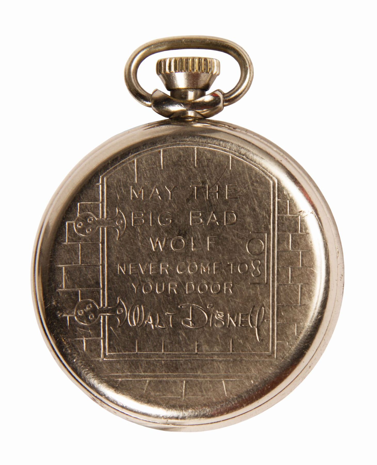 (Ingersoll, 1933) An extremely rare Ingersoll pocket watch featuring the Three Little Pigs and The Big Bad Wolf. The reverse of the watch is engraved with "May the Big Bad Wolf never come to your door." The watch measures 2" in diameter. The parts are all original and in good condition, with some wear to the paint on the hands and some surface wear to the silver case. The watch will need serving for full functionality, and one of the hands has come loose.