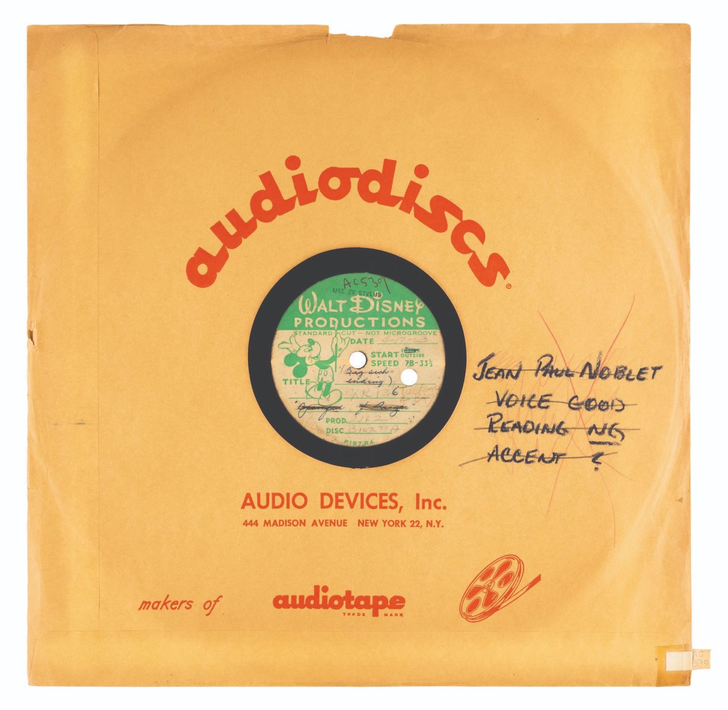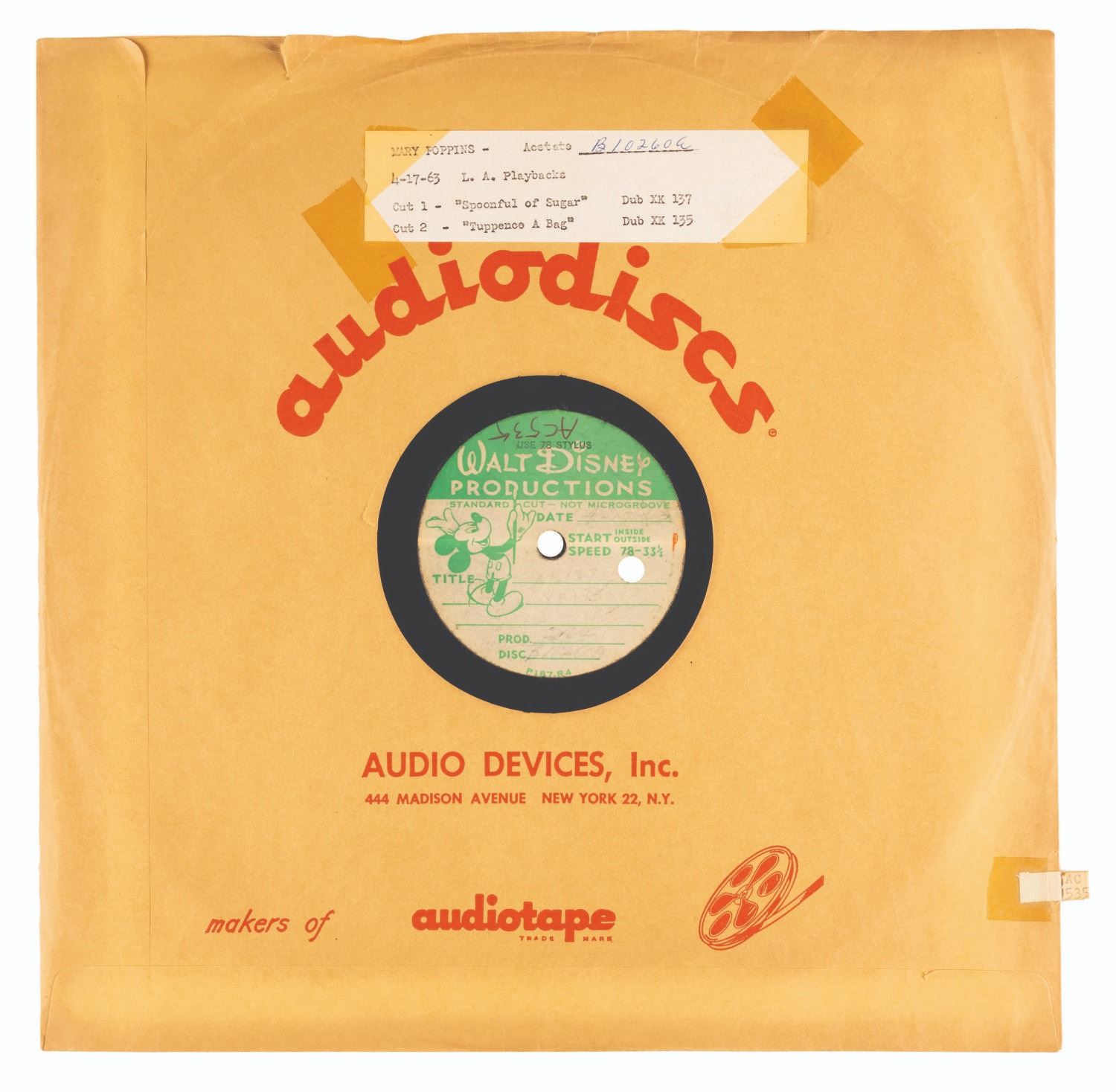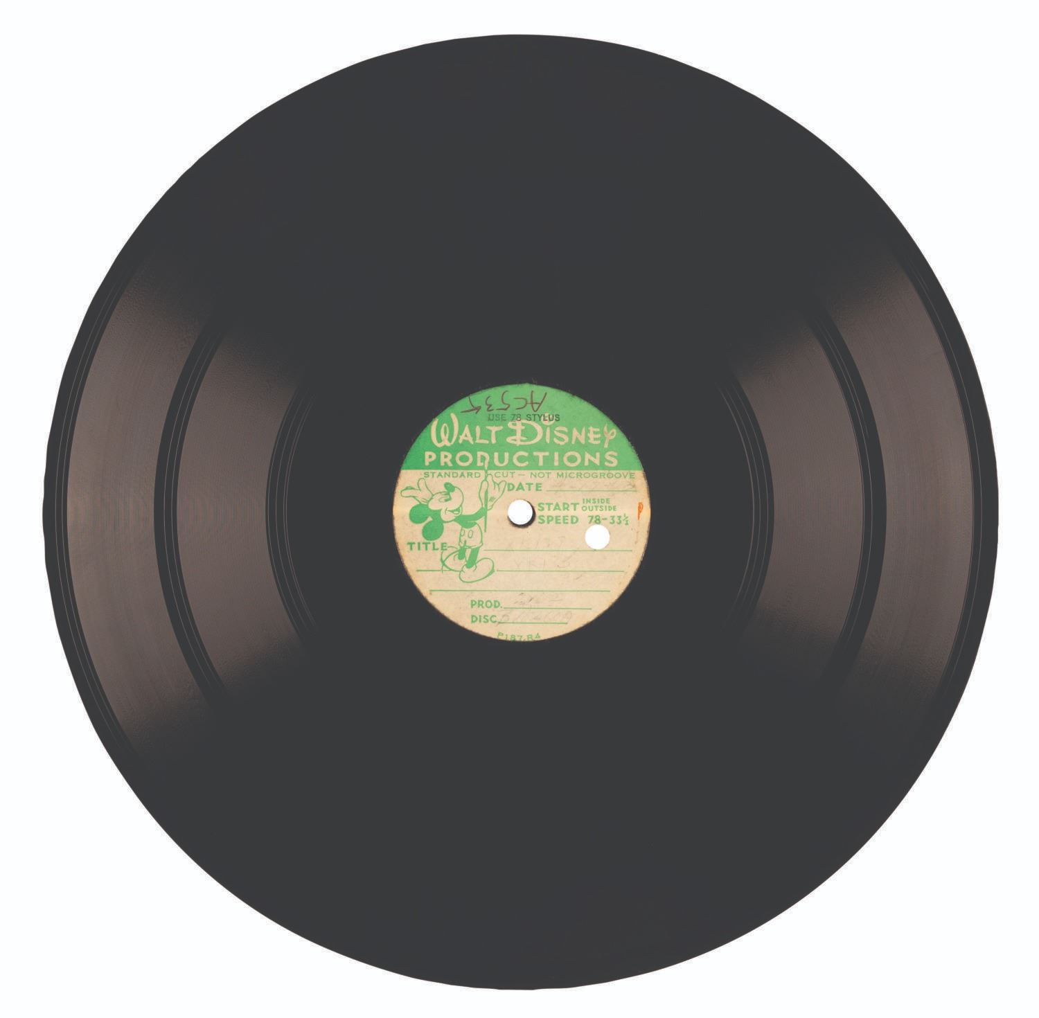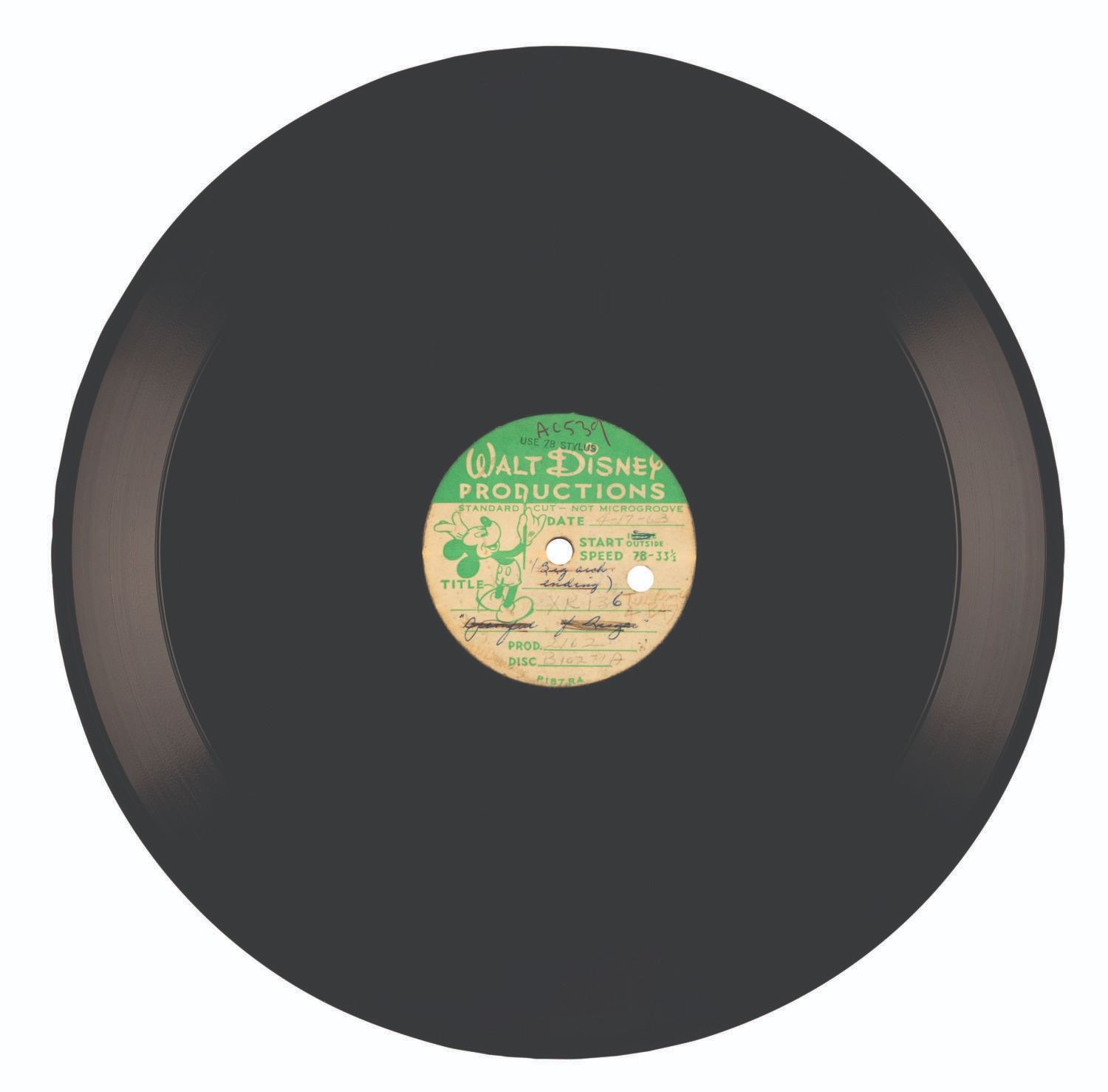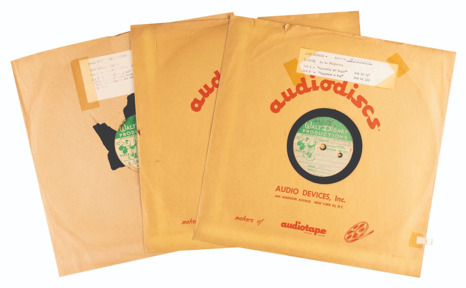 (Disney, 1963) Three “Mary Poppins” live-action playback acetates including rare takes of "Feed the Birds." The songs were prerecorded and played on set during filming while the actors lip-synched for the camera. Dated “4-17-63” and “5-22-63”, the records include “A Spoonful of Sugar,” “Stay Awake,” and three takes of “Feed the Birds.” Measuring 12” in diameter each, the records are in good condition with scratches, production inscriptions on the labels, and several chips at the edges.