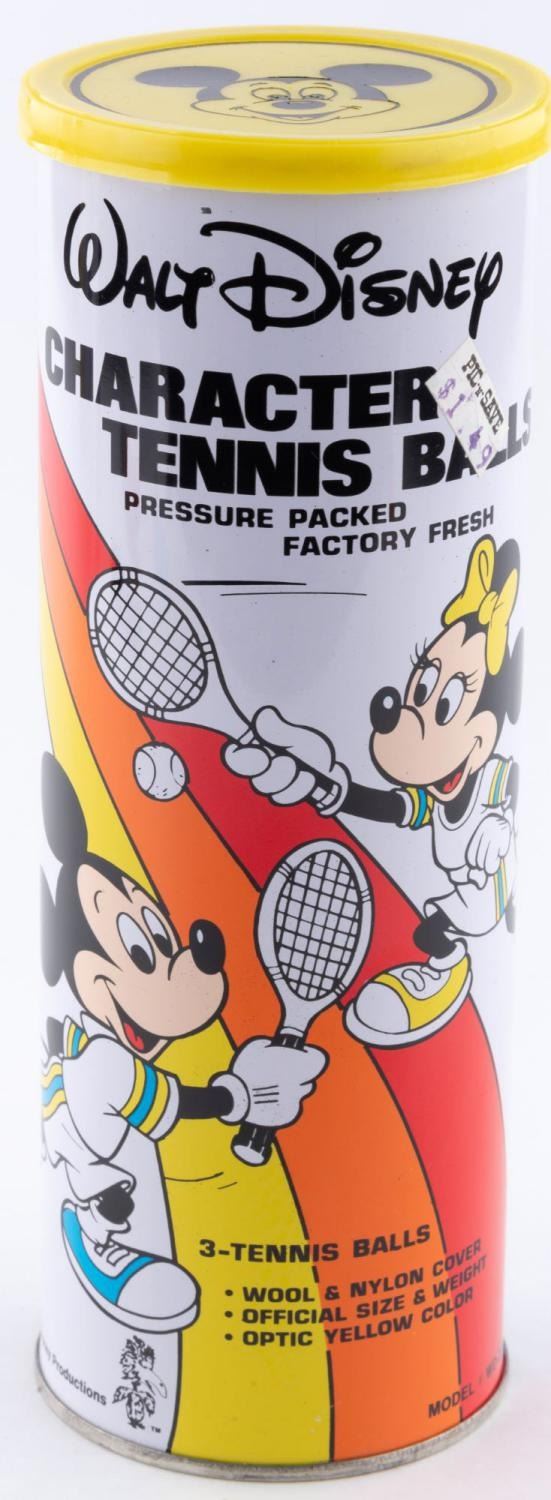 (Disney, 1980s) A sealed can of three Walt Disney Character tennis balls from the 1980s featuring Minnie and Mickey Mouse. The container measures 3" x 3" and 8" tall, and is in very good condition with two small dents and light surface scratches. The tennis balls are presumed in fine condition, sealed in the container.