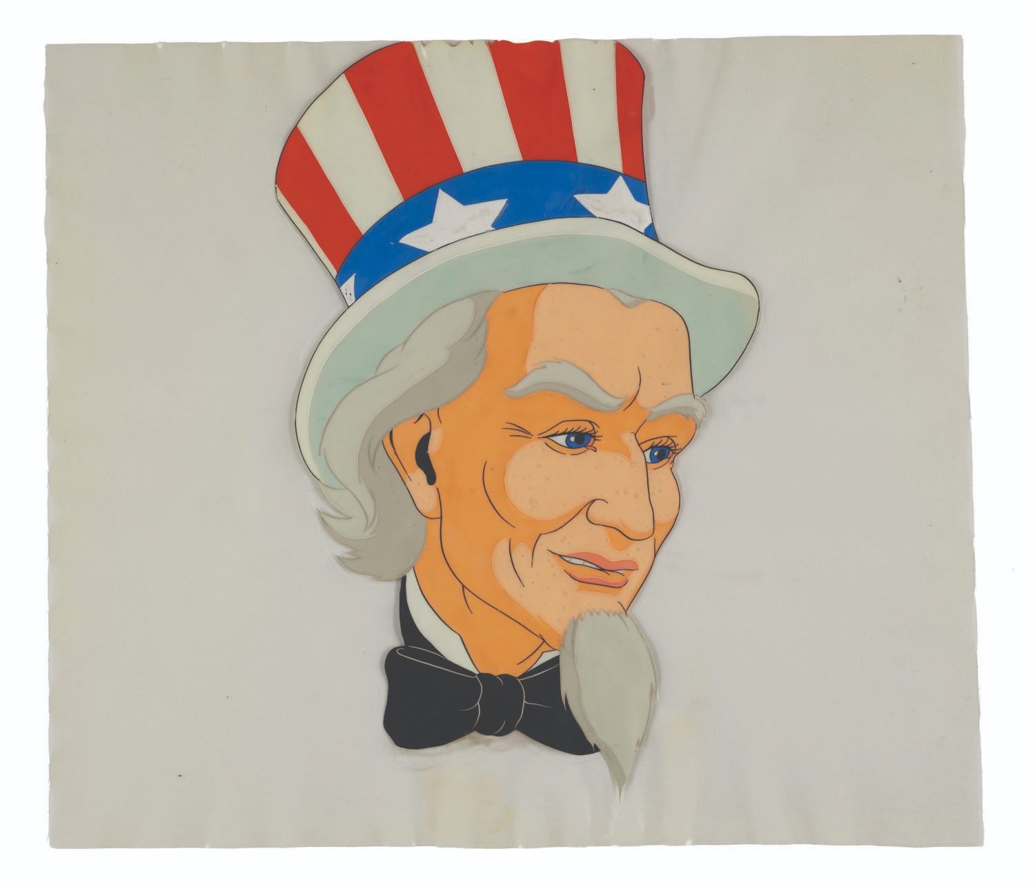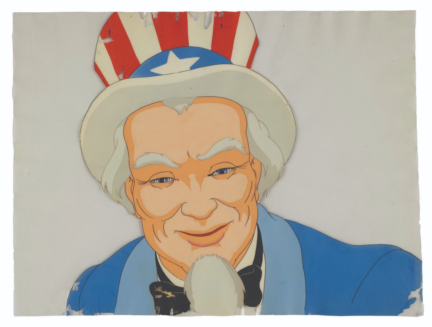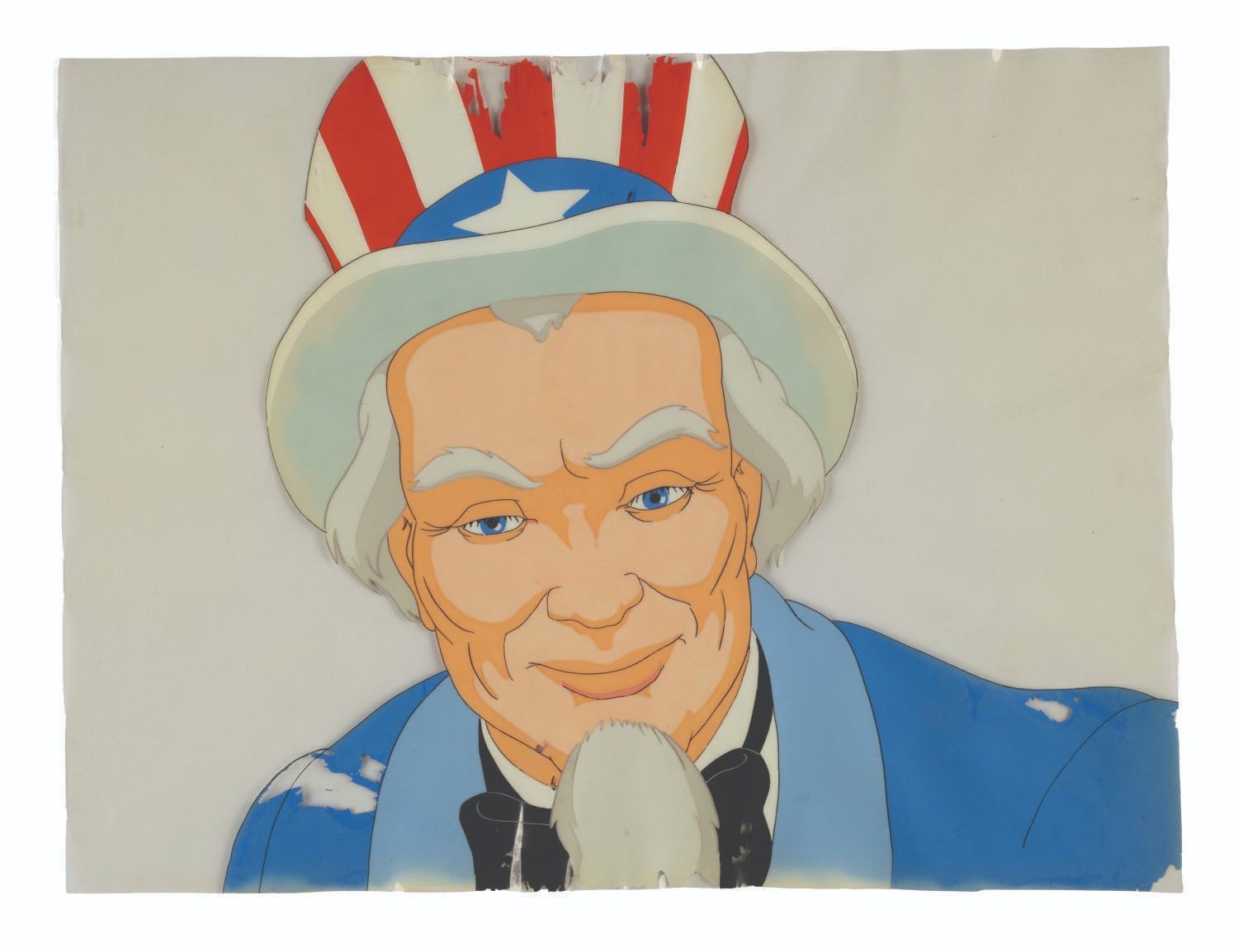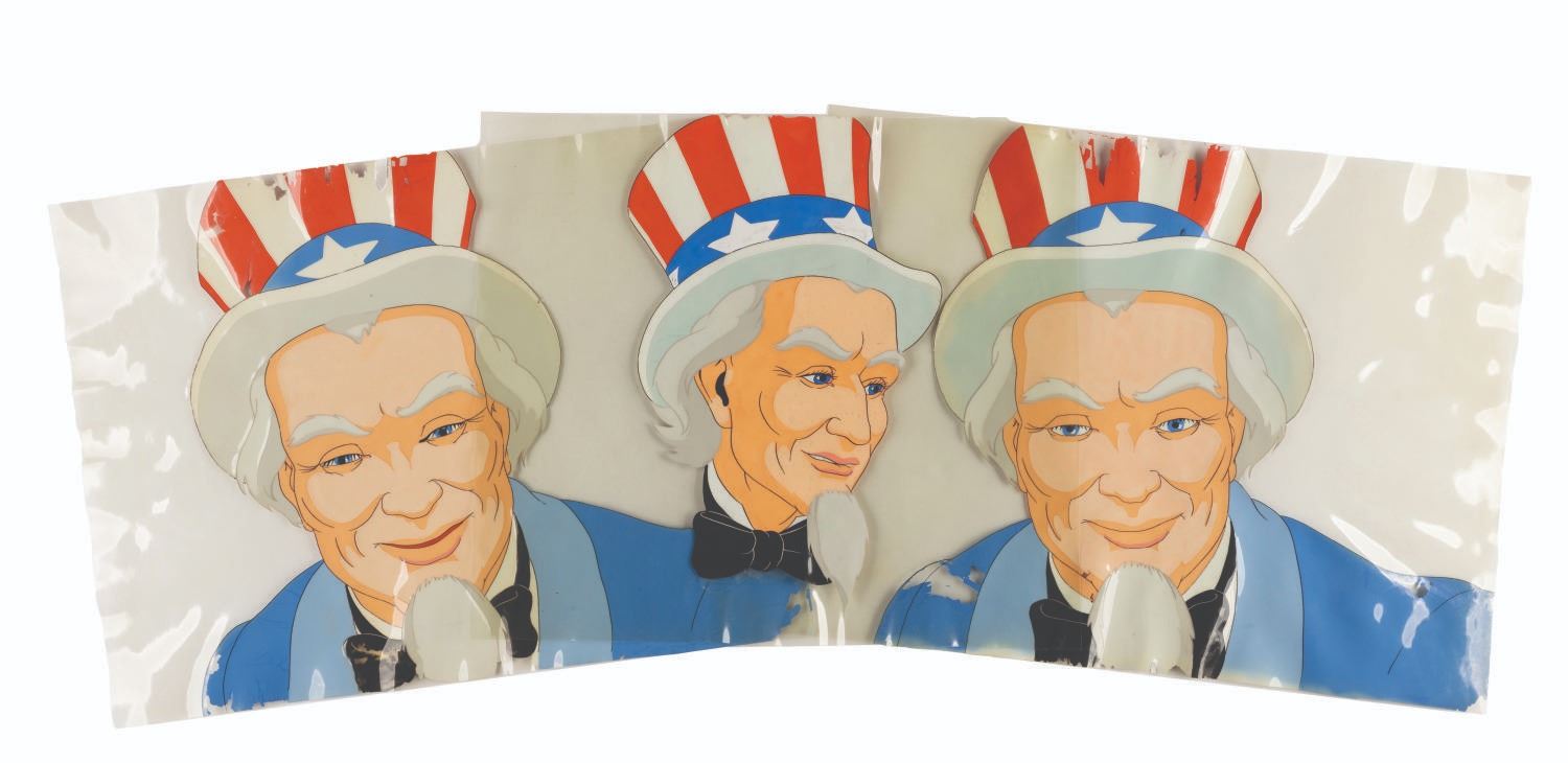(Schlesinger, 1939) Three original hand-painted production cels of Uncle Sam from the Porky Pig-starring Merrie Melodies short “Old Glory.” With character sizes from 5.5” x 8” to 9” x 10.25” on cels measuring from 9” x 10.25” to 9” x 11.75”, the pieces display in good condition with heavy paint loss, scratches, and wear from production use.