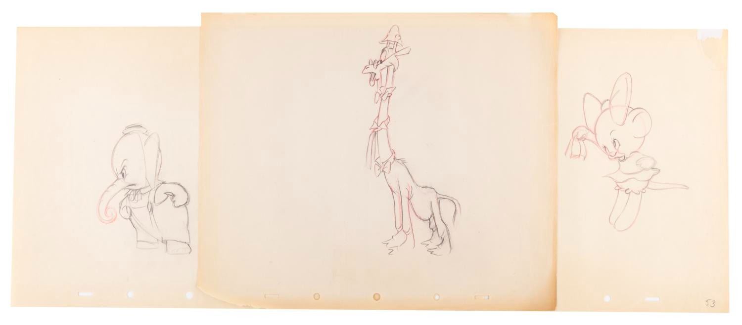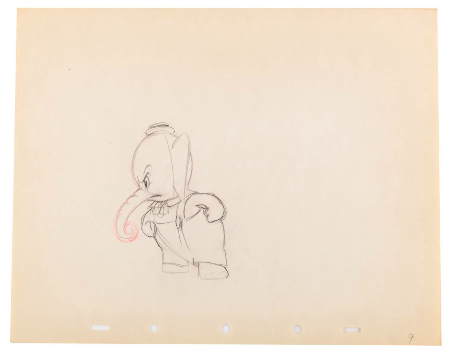 (Disney, 1936) Three original production drawings from the 1936 Disney Silly Symphony, "Elmer Elephant." The drawings feature Elmer, Tillie, and Joe Giraffe. All three drawings are on untrimmed 10" x 12" animation paper. Elmer measures 3" x 4.5", Tillie measures 4" x 5", and Joe measures 3" x 7.5". The drawings are in very good condition with expected wear and yellowing along the edges. There is a small 1" section of paper missing from the bottom left corner of the Joe drawing.