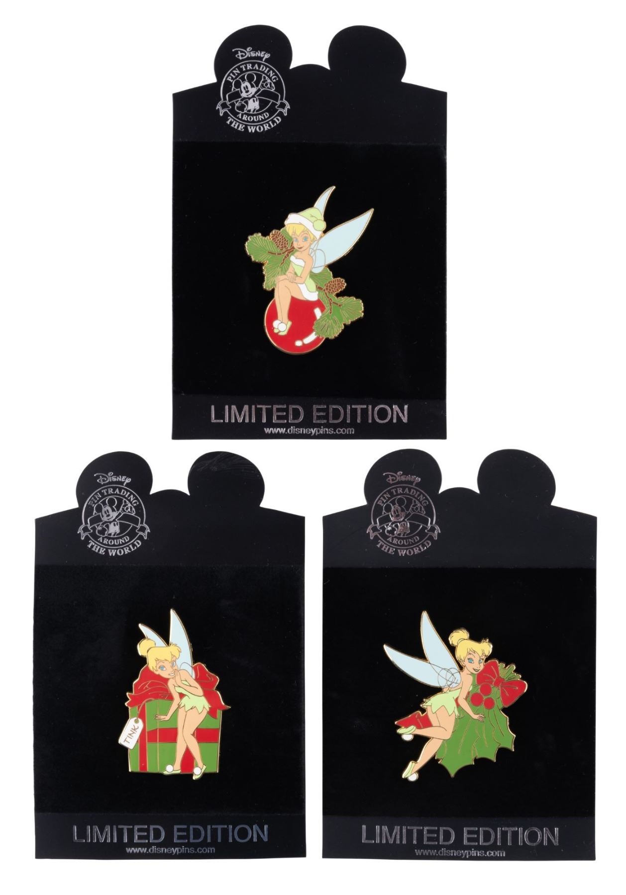(Disney, 2008) Three Pin Trading Around The World Tinker Bell Christmas-themed pins including Tink sitting on an ornament, Tink with holly, and Tink with a present, each released in an edition of 100 pieces. The pins are in very good unused condition and come on their original cards.