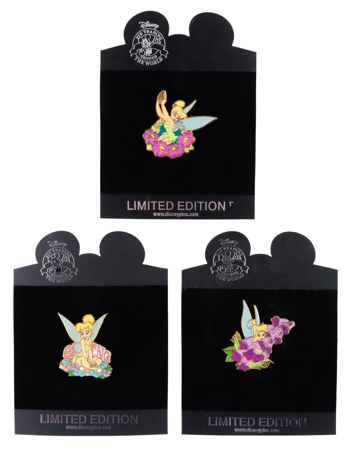 (Disney, 2009-2010) Three Disney Auctions Tinker Bell pins including a Tinker Bell Spring Sparkle Wing released in 2010 in an edition of 250 pieces and Tinker Bell Fantasy Flowers and Tinker Bell in flowers with arms raised both released in 2009 in editions of 250. The pins are in very good unused condition and come on the original cards.