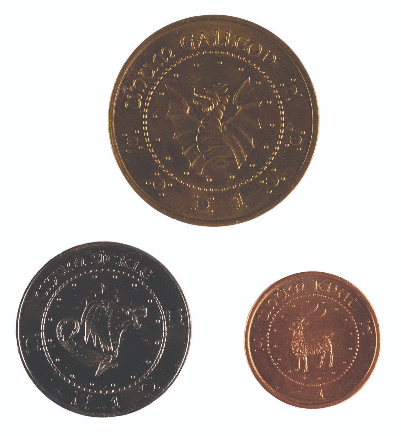 (Warner Bros., 2001-2011) A prop Galleon, Knut, and Sickle used in a Gringotts Bank scene from production of the Harry Potter franchise. Measuring from 1” to 1.5” in diameter, the metal currency is in fine production-used condition.