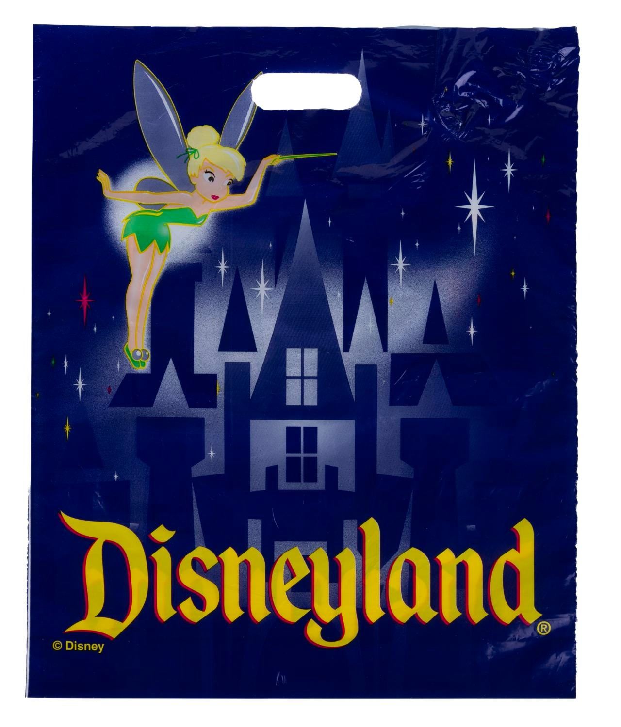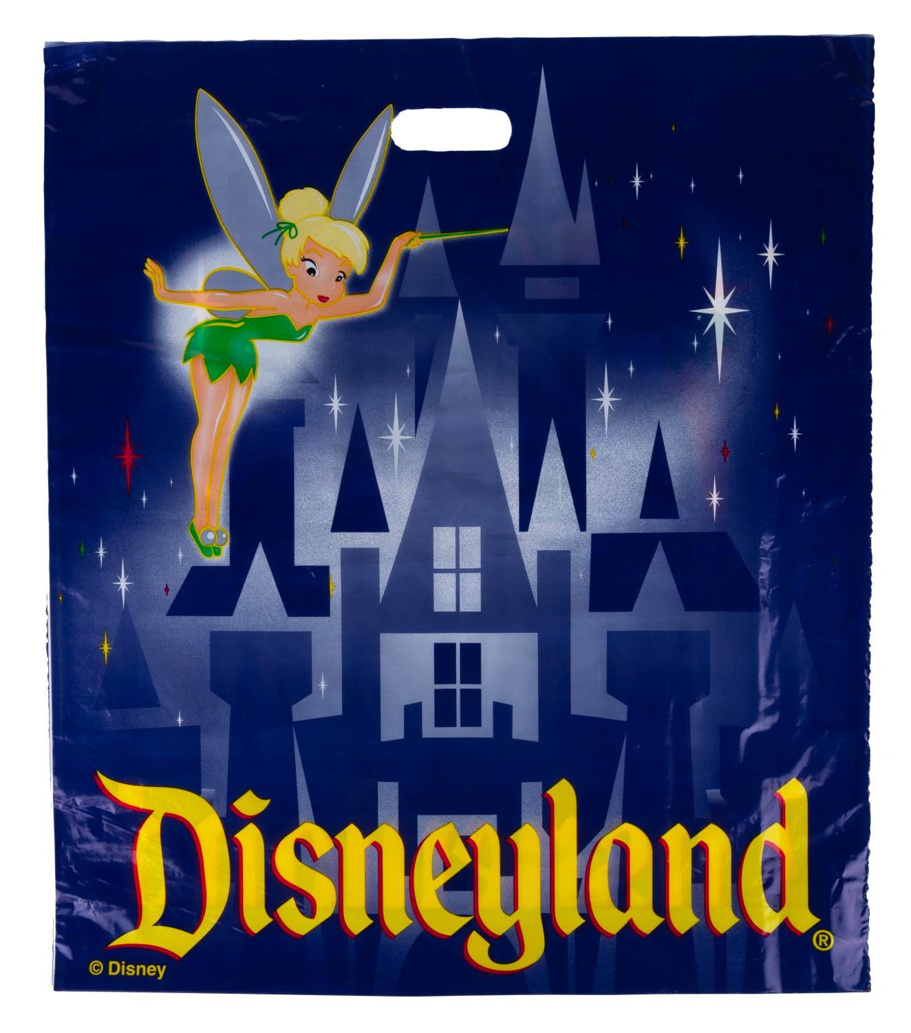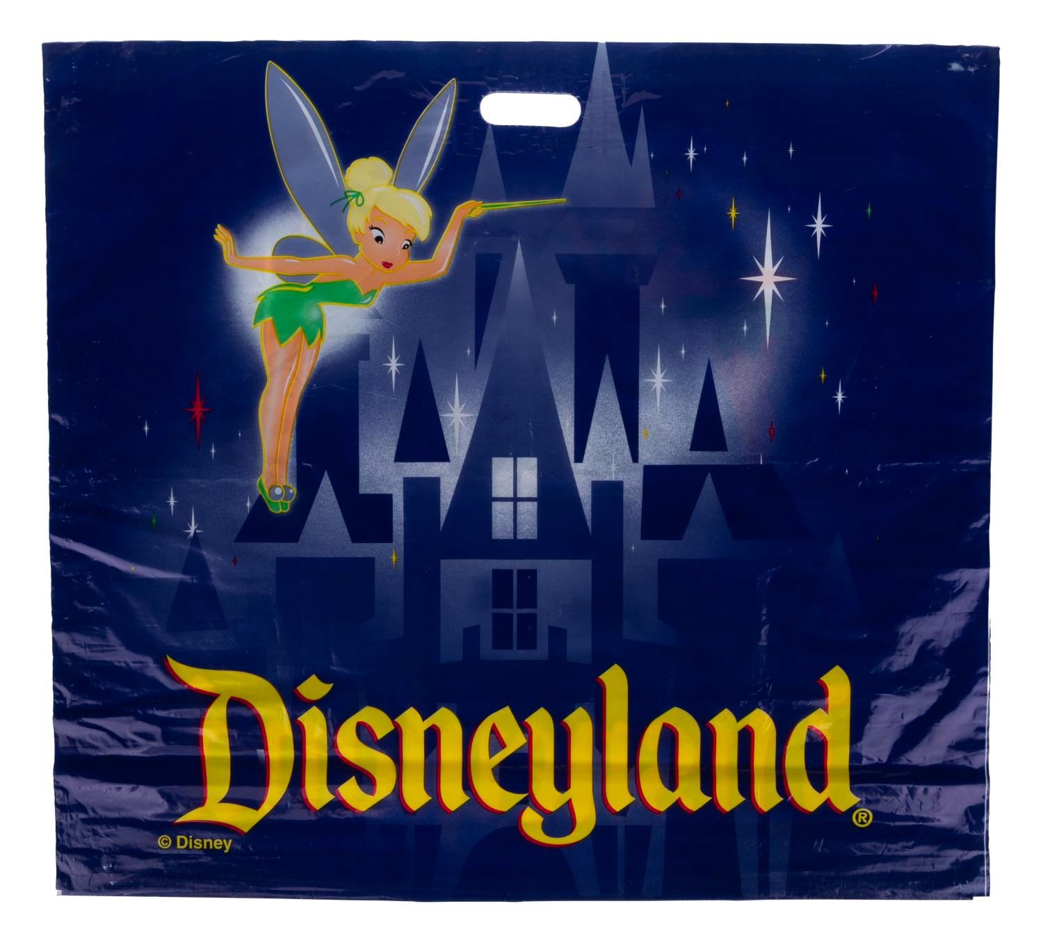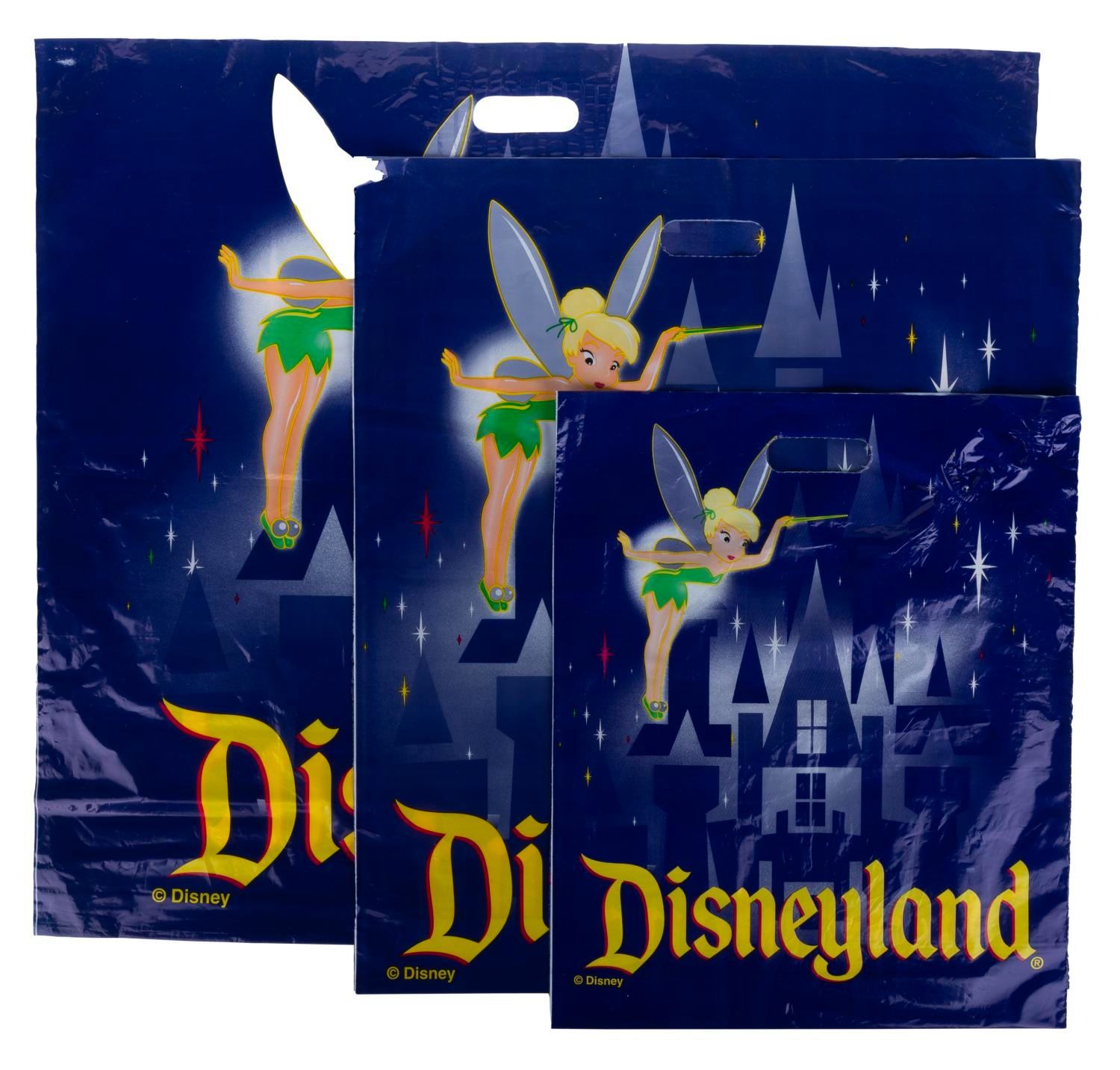 (Disneyland, 1980s-90s) Three plastic shopping bags from Disneyland featuring Tinker Bell. This very rare design was used in the Park very briefly due to issues with the ink. Measuring 15" x 18", 20.5" x 23.5", and 25" x 27.5" the bags are in good condition, with some wrinkling, small scuffs, and wear.