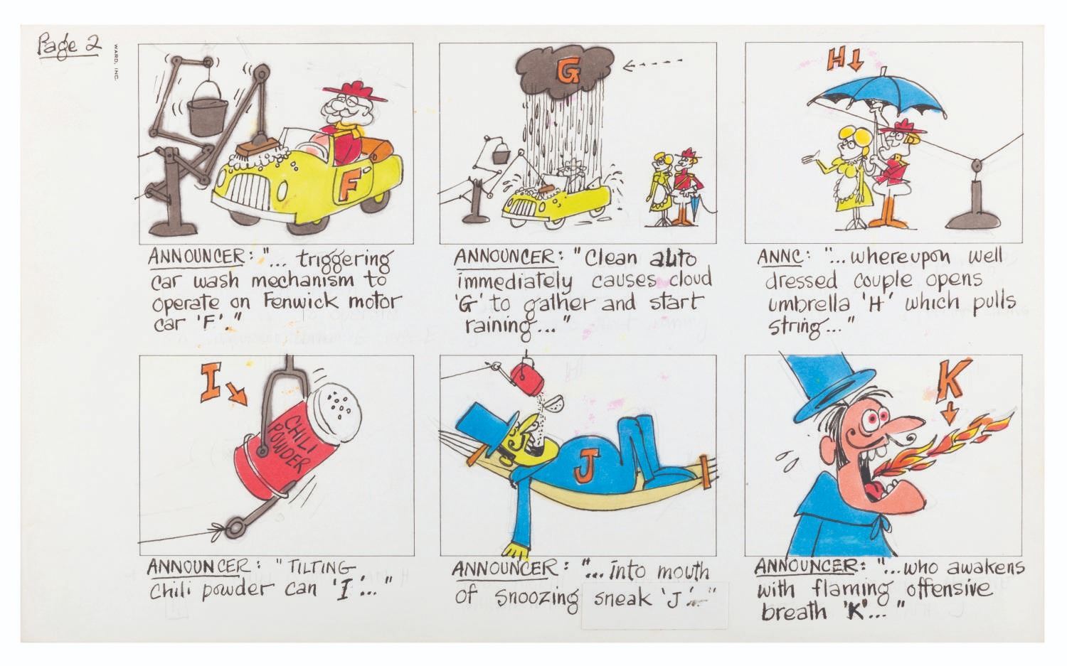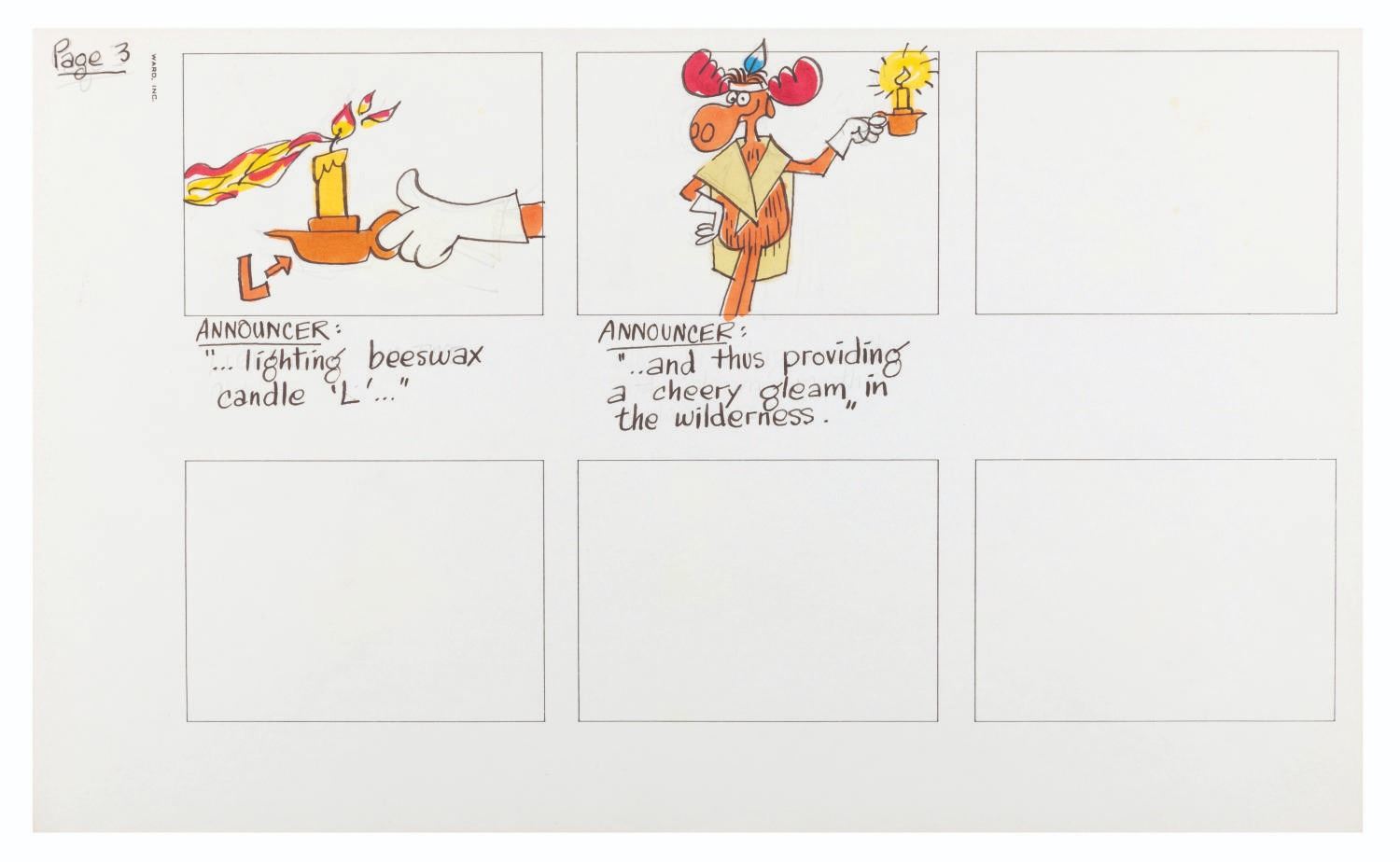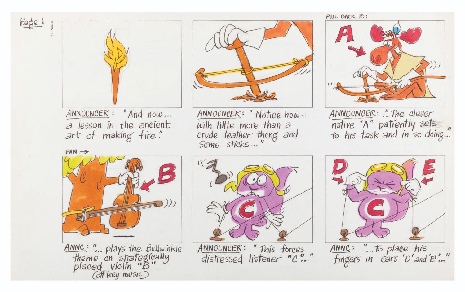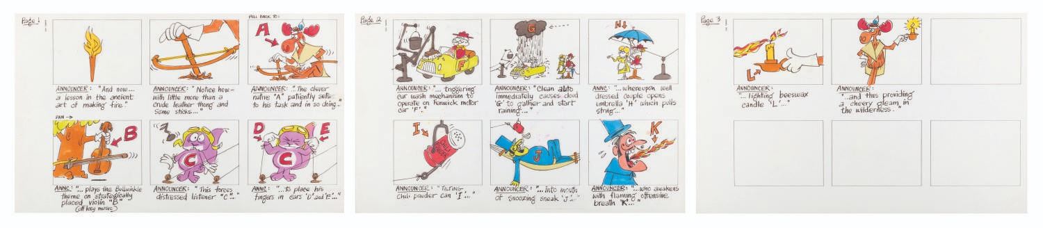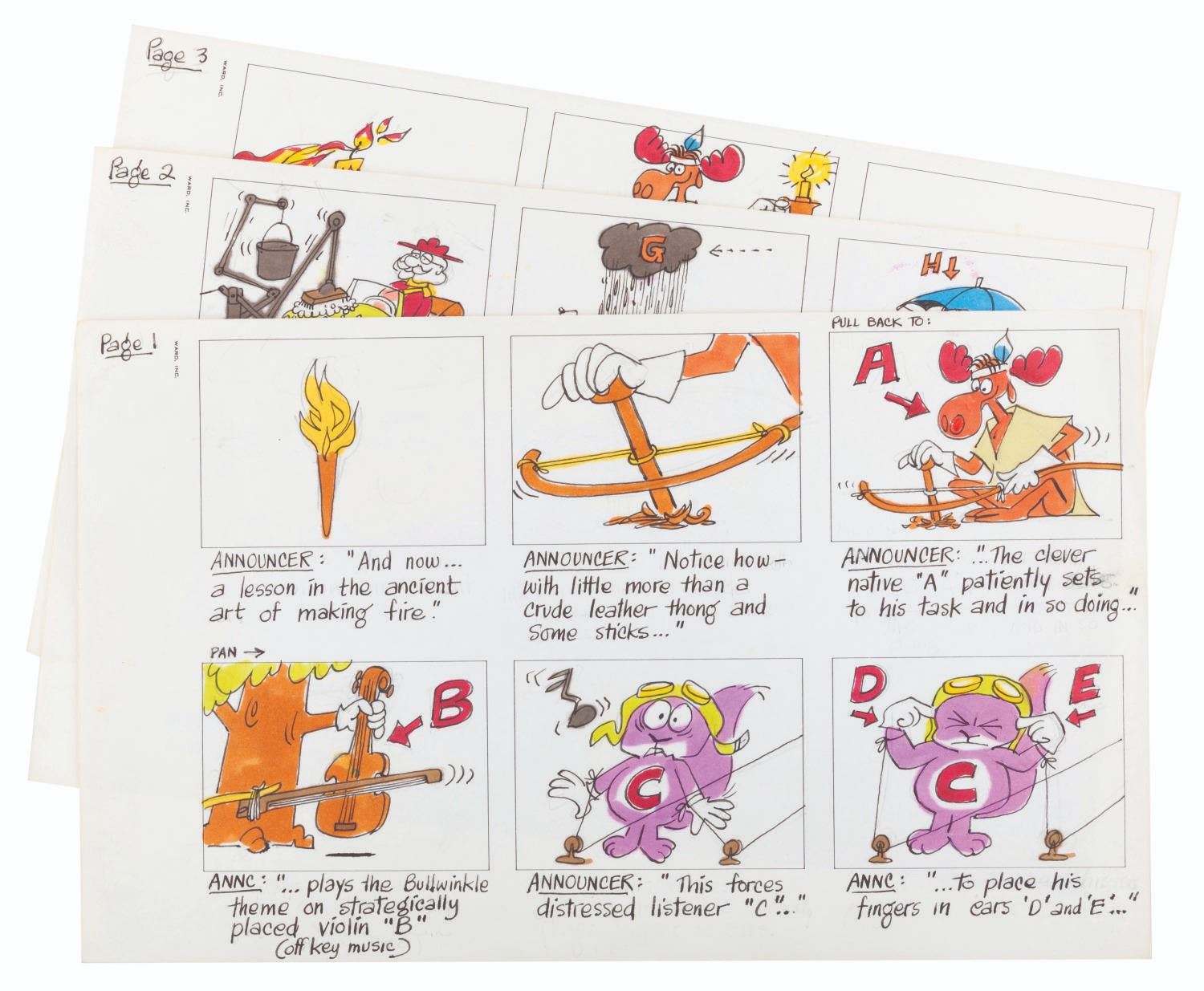 (Ward, 1970s) Three storyboard pages by Alex Anderson for an unproduced “Rocky and Bullwinkle” revival, featuring an unorthodox lesson in making a fire. Accomplished in graphite, ink, and marker and measuring 8.5” x 14” with six 2.75” x 3.75” panels, the pages are in very good condition with light edge wear and creasing.