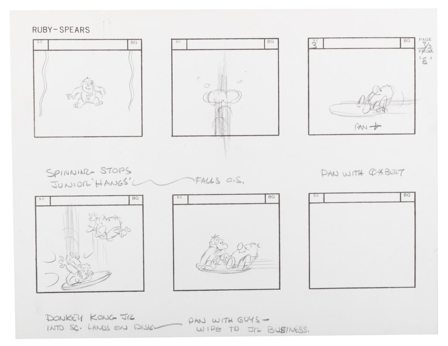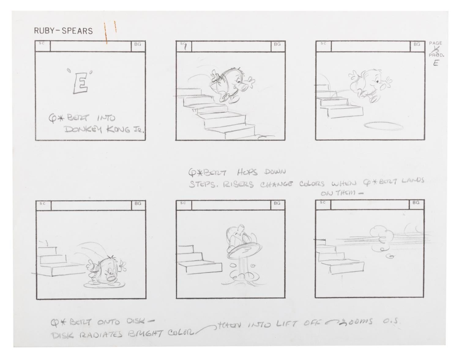 (Ruby Spears, 1984) Three hand-drawing storyboard pages from the transition titles of the "Q*bert" and "Donkey Kong Jr." segments of “Saturday Supercade.” Each page measures 8.5” x 11” with six 2.5” x 2.75” panels. The graphite storyboard pages are in very good condition with minor handling wear.