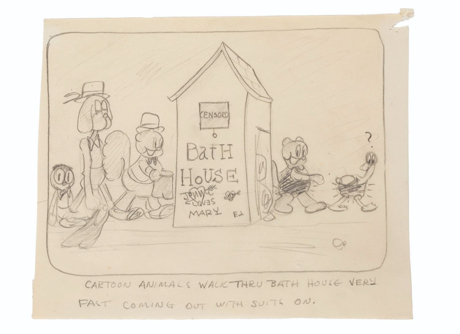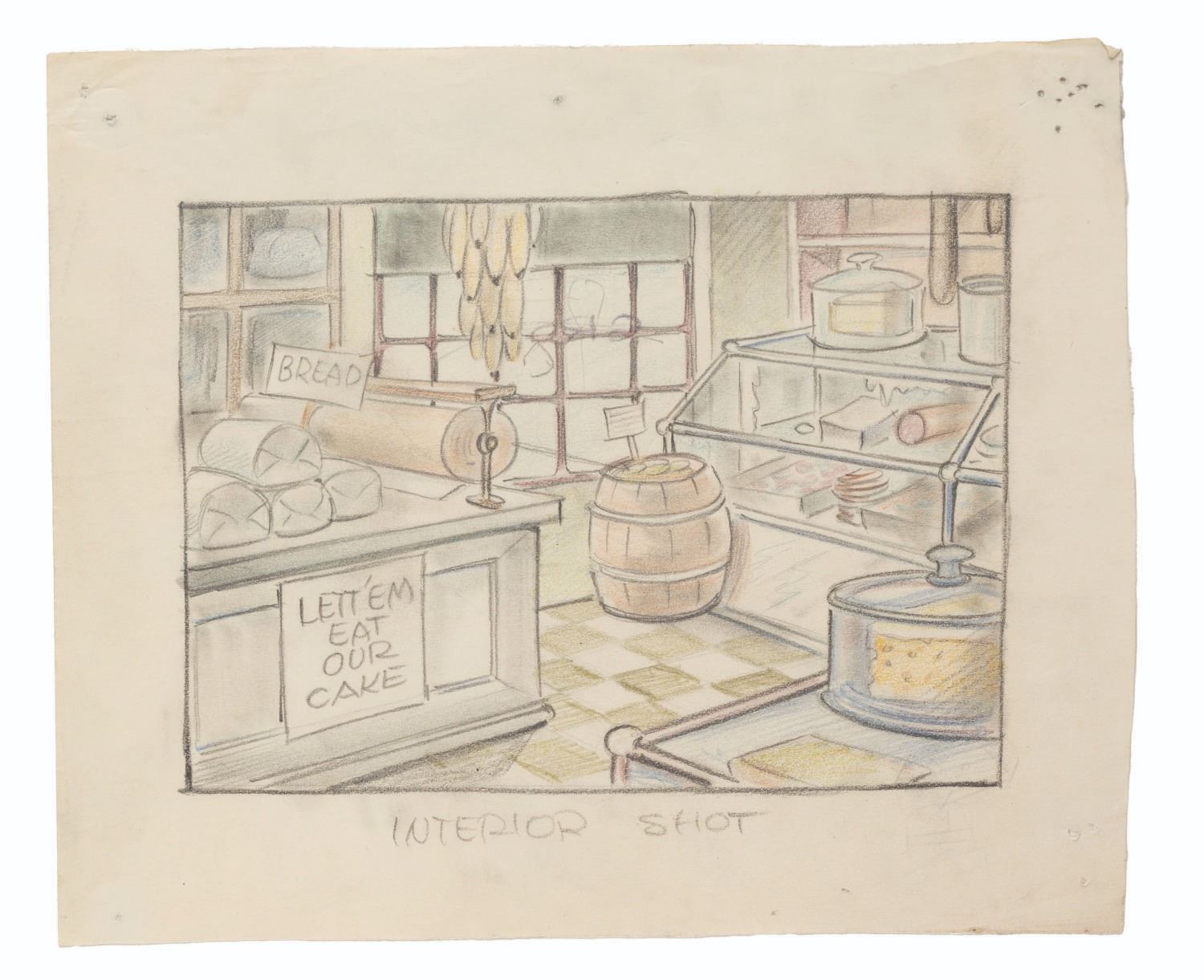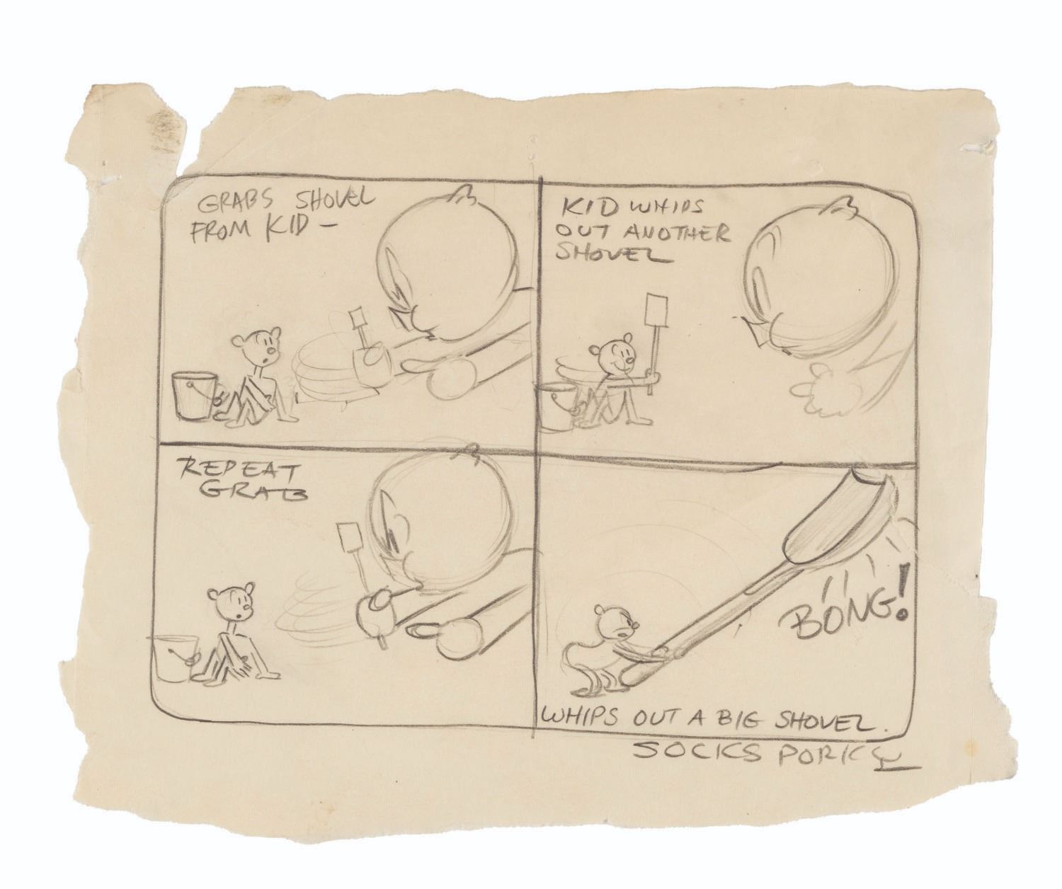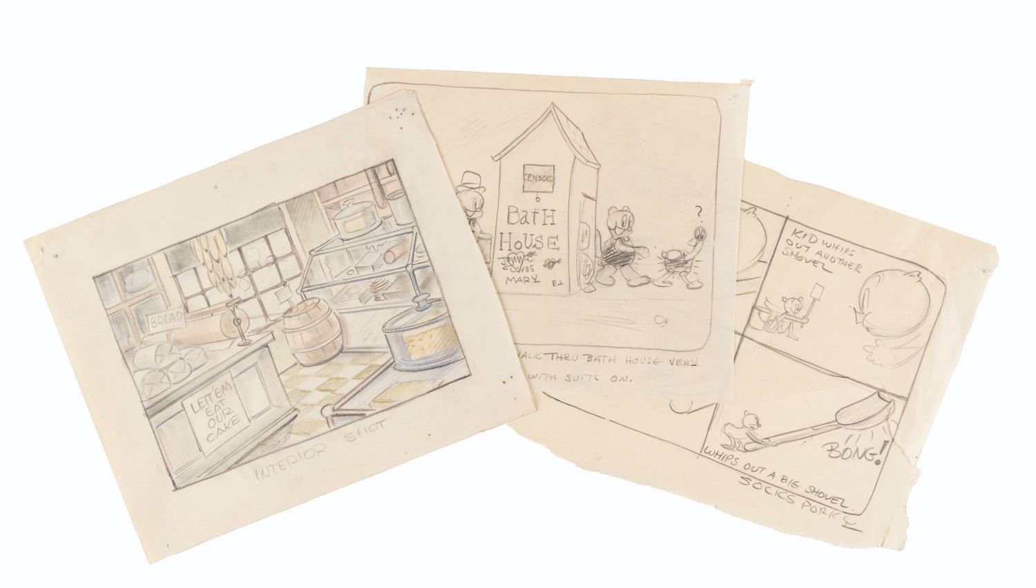 (Schlesinger, 1938) Three storyboard panels from the Looney Tunes short “Porky’s Naughty Nephew,” directed by Bob Clampett. Accomplished in graphite and measuring 6.75” x 8”, the panels display in very good production-used condition with creases, pinholes with some corner tears, edge tears, and light discoloration from age.