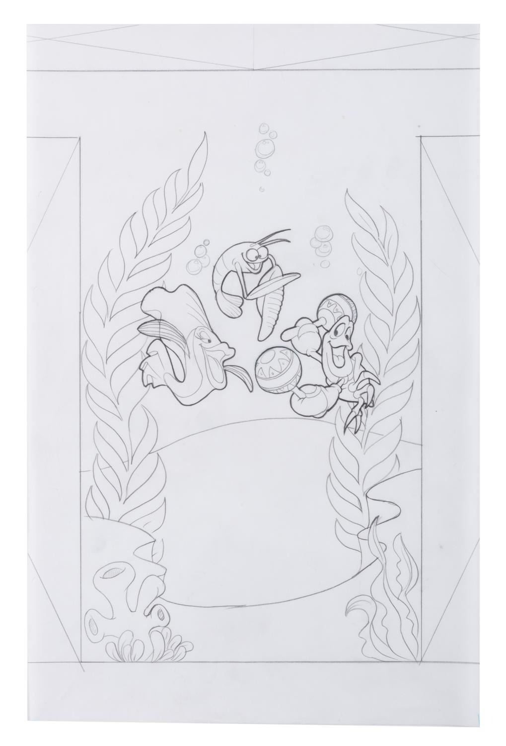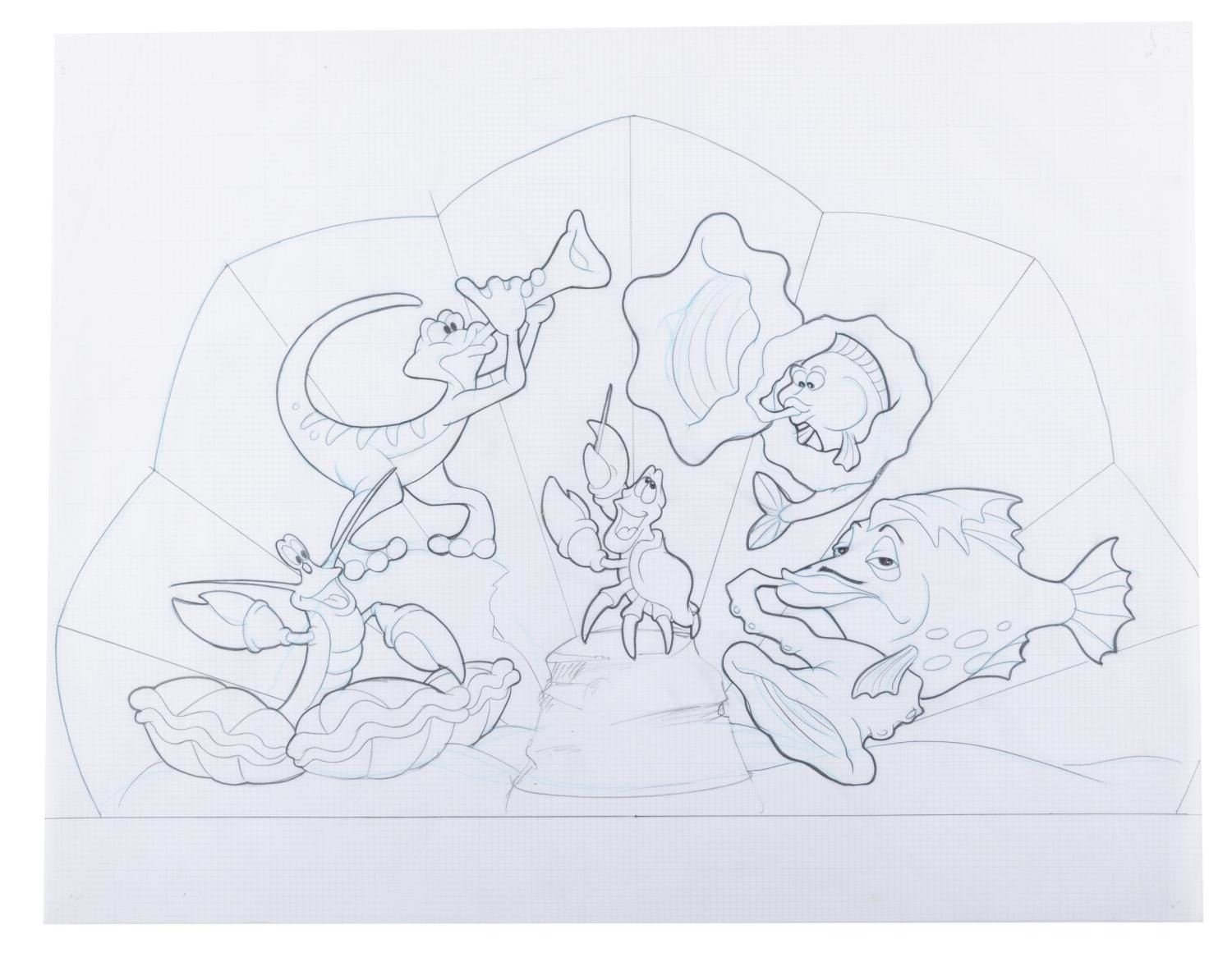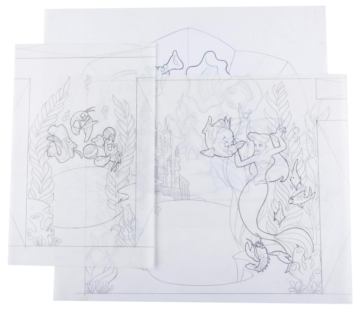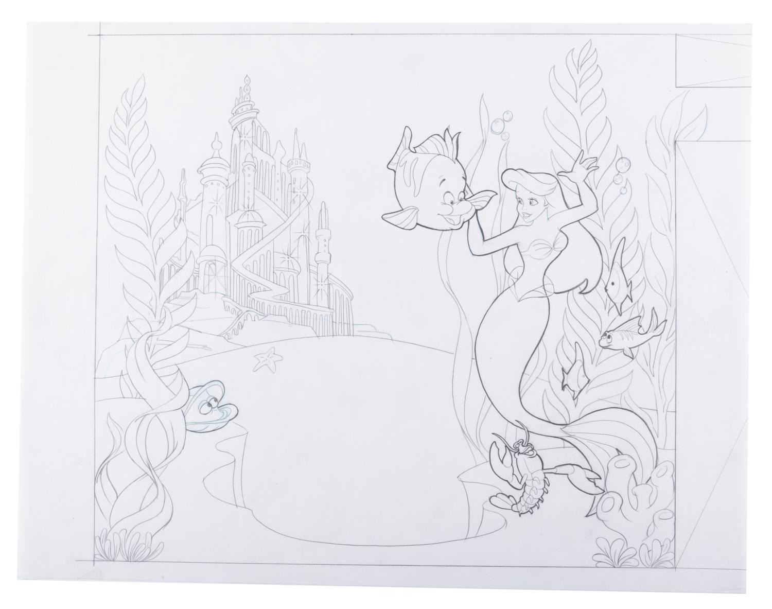 (Disney, 1989-1990s) Three “The Little Mermaid” drawings featuring Ariel, Flounder, and Sebastian, likely used for merchandising purposes. Ranging in size from 11” x 17” to 17” x 22”, the graphite and color pencil drawings are in very good condition with light creases and pinholes at the corners from production use.