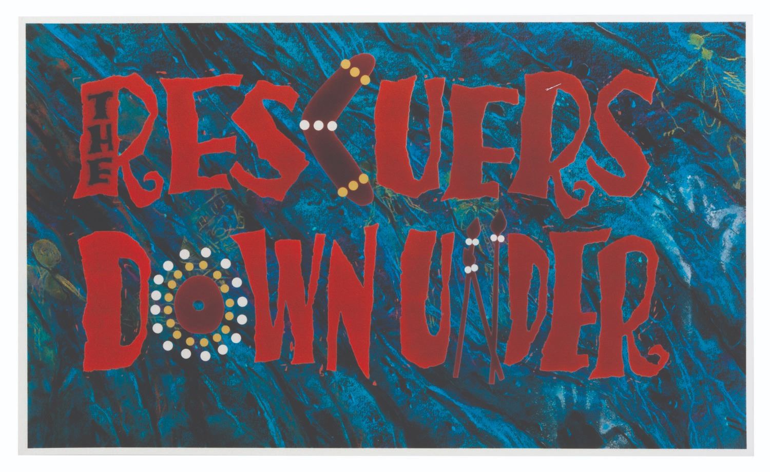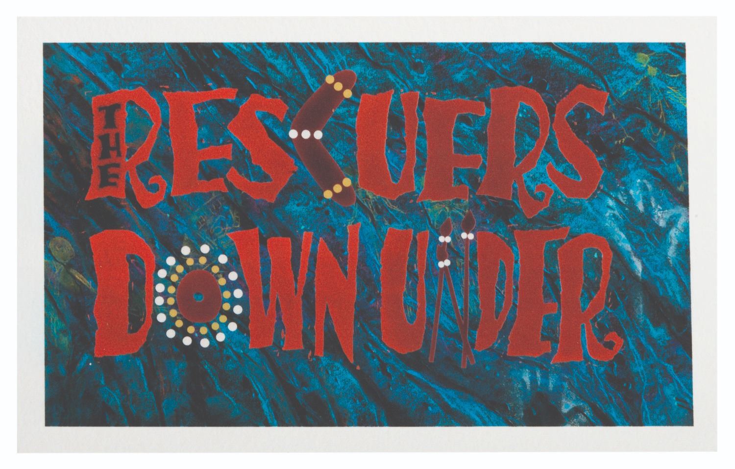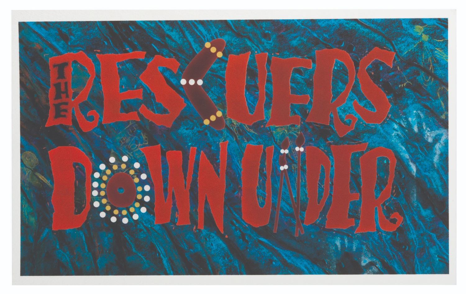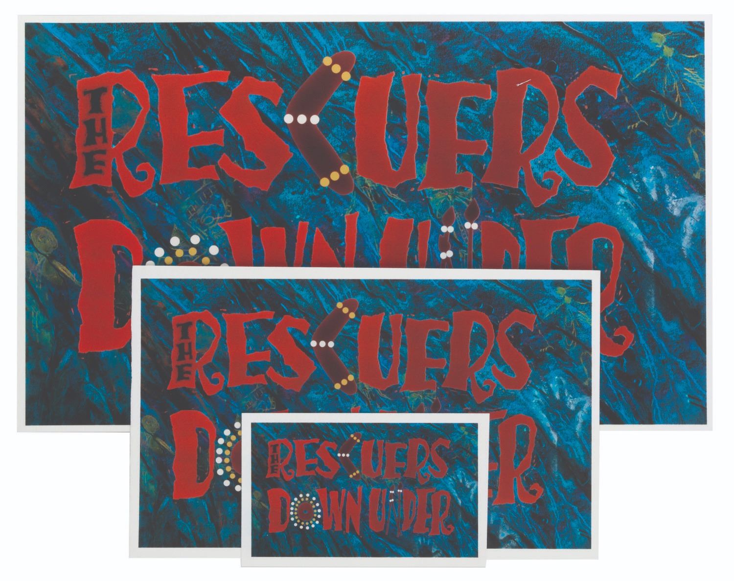 (Disney, 1990) Three reference prints of the main title treatment for"The Rescuers Down Under." As the first feature to be fully created digitally, these prints were made by the CAPS (Computer Animation Production System) department to test the color correction and color matching of the new computer animation compared to traditional animation. Measuring 4.5" x 7.5", 8.75" x 14", and 12.5" x 21", the prints are in fine condition.