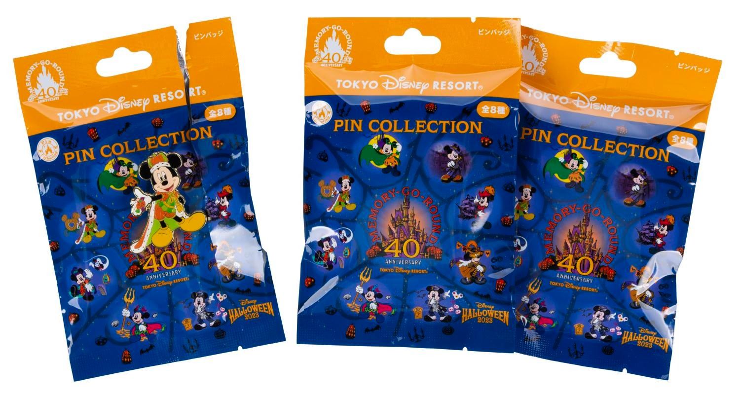 (Tokyo Disney, 2023) Three Memory-Go-Round Halloween blind bag pins released during the Tokyo Disney Resort's 40th anniversary, featuring Mickey Mouse in different costumes. The 1.5" pins are in fine condition, with two sealed and one open, featuring Mickey in a King Costume.