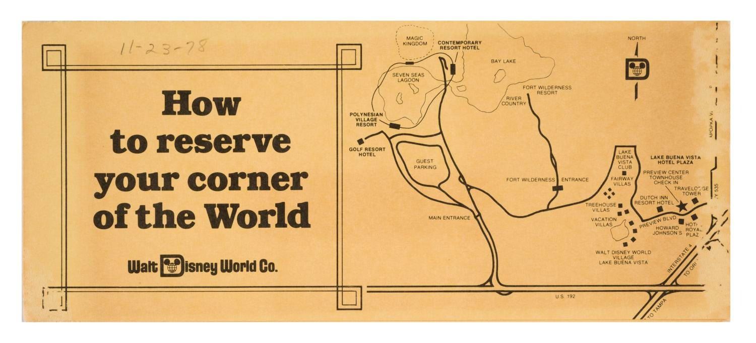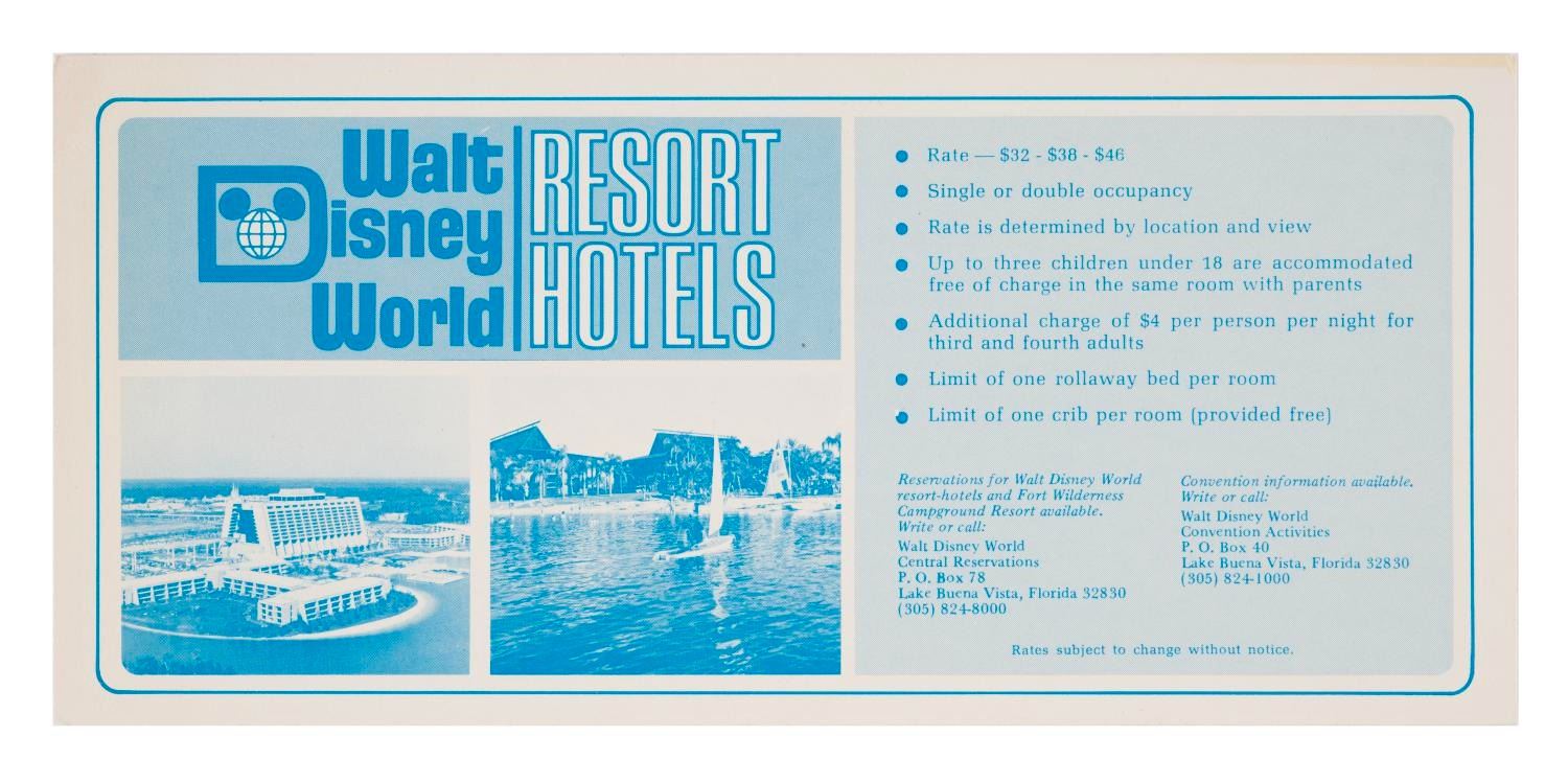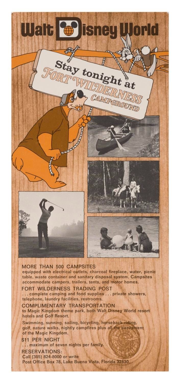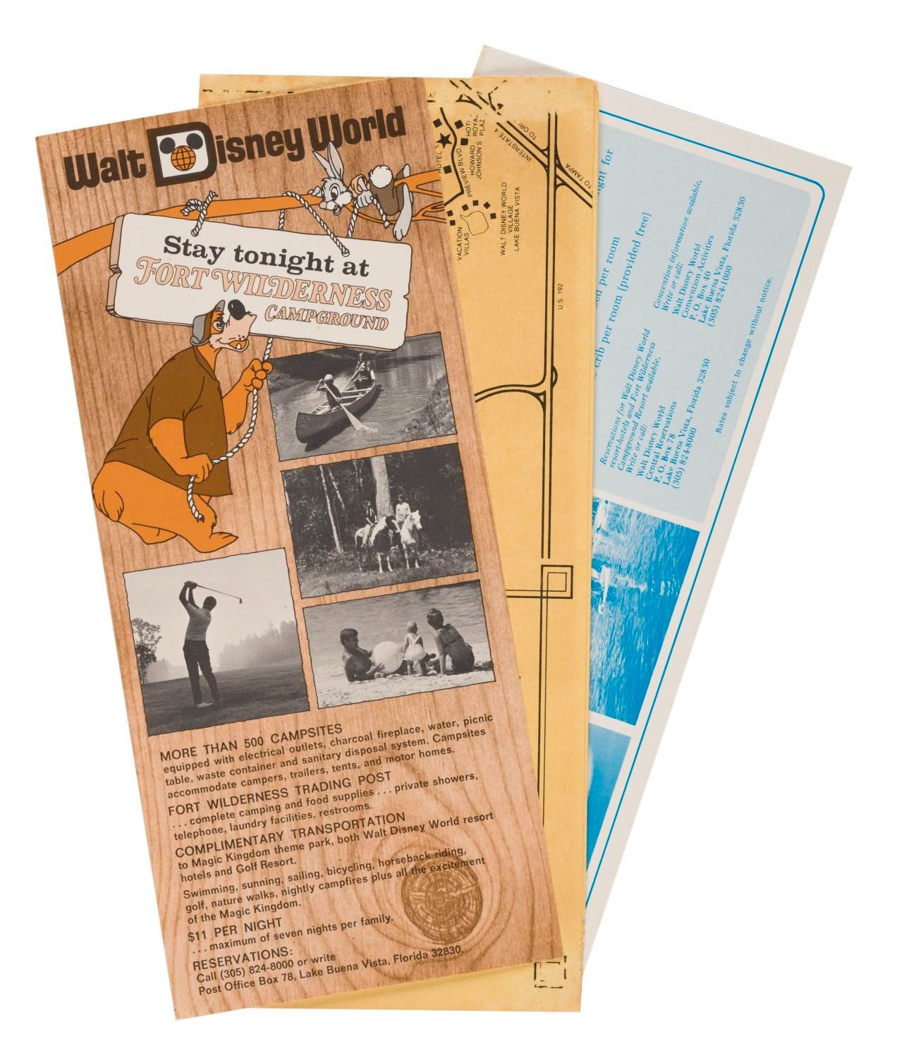 (Walt Disney World, 1972-78) Three fliers from Walt Disney World Resorts advertising the Fort Wilderness Campground and the many Resort Hotels, with maps and pricing information. Measuring approximately 4” x 9.5”, each flier is in very good condition with minor wear to the edges and corners.