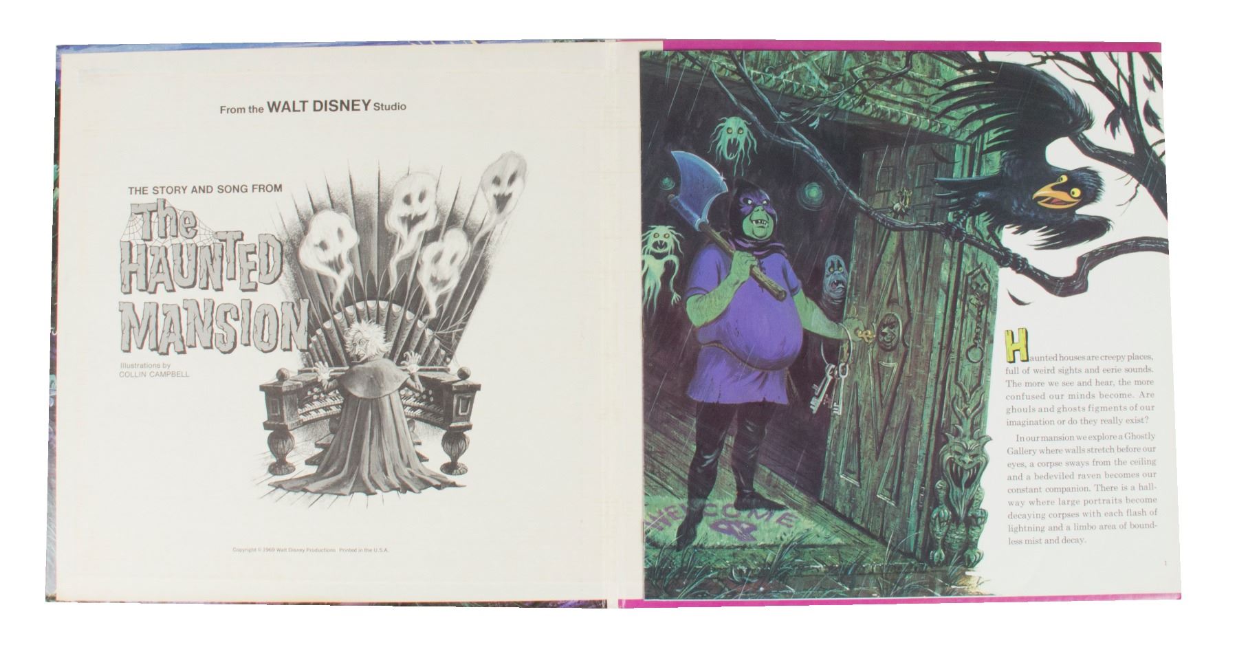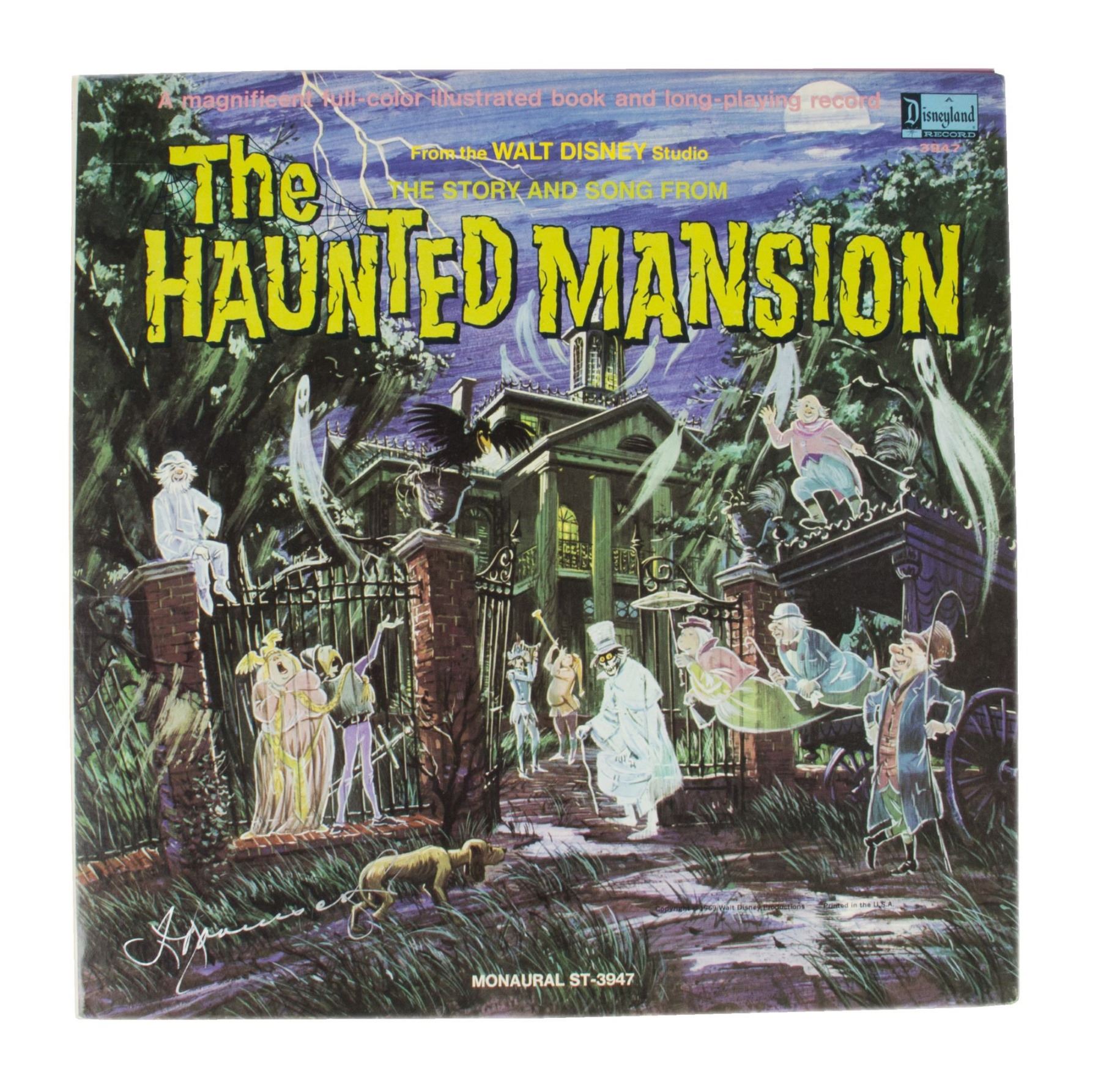 (Disneyland, 1969) A Disneyland souvenir record titled "The Story and Song from the Haunted Mansion". The album cover has been signed by Thurl Ravenscroft whose voice can be heard within the attraction as the lead singing bust. The cover opens to reveal a 11-page illustrated story by Collin Campbell to go along with the record. Measuring 12.5"x12.5" within its original album cover, the record is in very good condition with minor wear.
