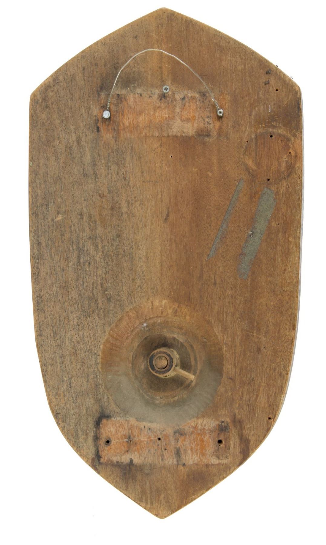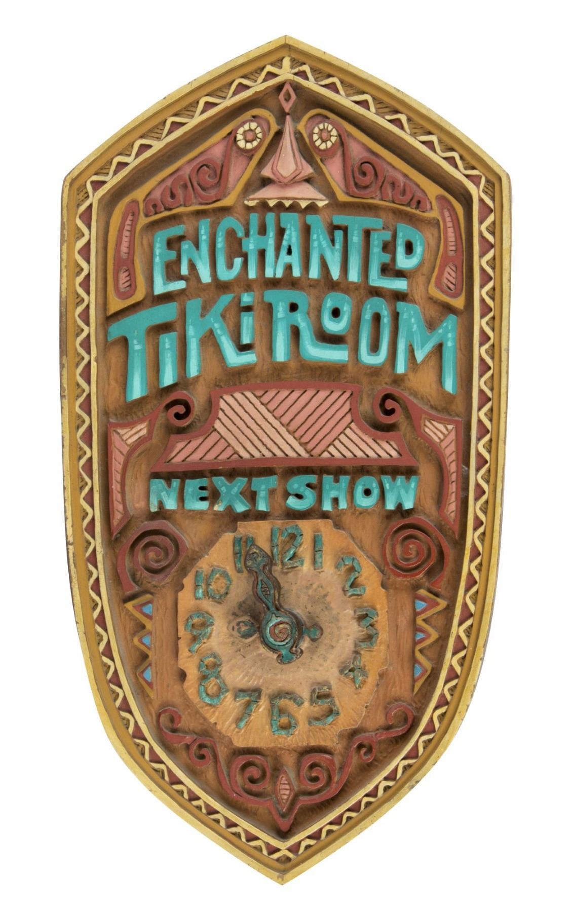 (Disneyland, c.1980s) A Polynesian-themed sign used to display the next show time for the "Enchanted Tiki Room" attraction at Disneyland. Accomplished in wood with elaborately carved and vibrantly painted portions, this shield-shaped show time sign prominently displays the name of the "Enchanted Tiki Room" in high relief above a rotating dial clock. The dial can be adjusted both by the front and the back sides of the sign. This sign measures approximately 23"x14" and is in very good condition with some edge-wear from frequent park use.