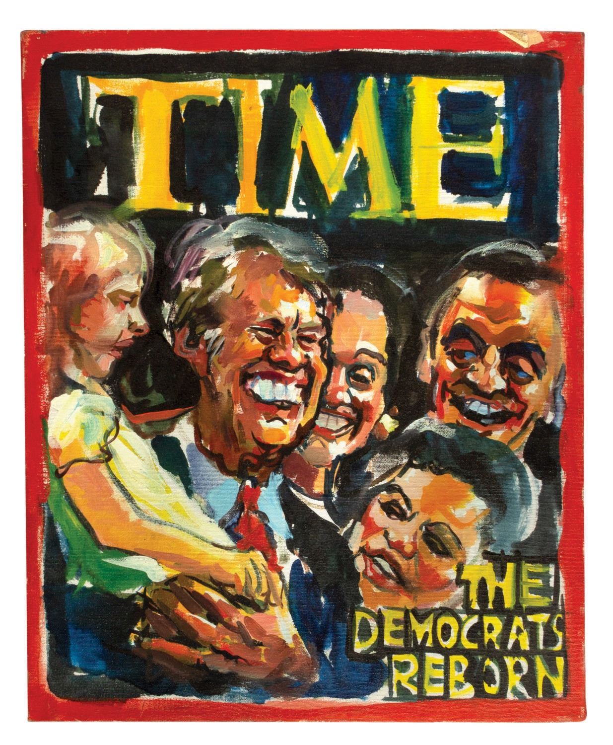 (Green, 1976) An original painting created by renowned illustrator Peter Green. Wonderfully capturing his popular caricature style, the painting is a personal work of Green that was created as parody of Time Magazine's cover from their July 26, 1976 issue featuring President Carter. Accomplished in oils on canvas over a wooden frame, the painting measures 20"x16". The condition is very good with some paint wear at the top edge, and a small piece of tape adhered to the canvas at the top right.