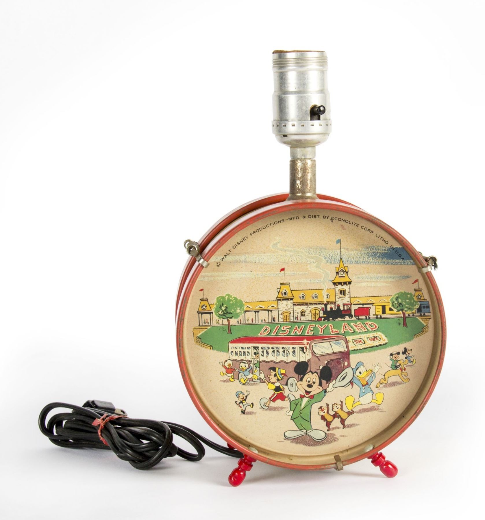 (Disneyland, c.1955) A colorful tin drum lamp with Disney characters in front of Disneyland. The lamp measures 6.25"x3.75" and 10" tall. The condition is good with minor wear throughout and no lamp shade. Functionality has not been tested.