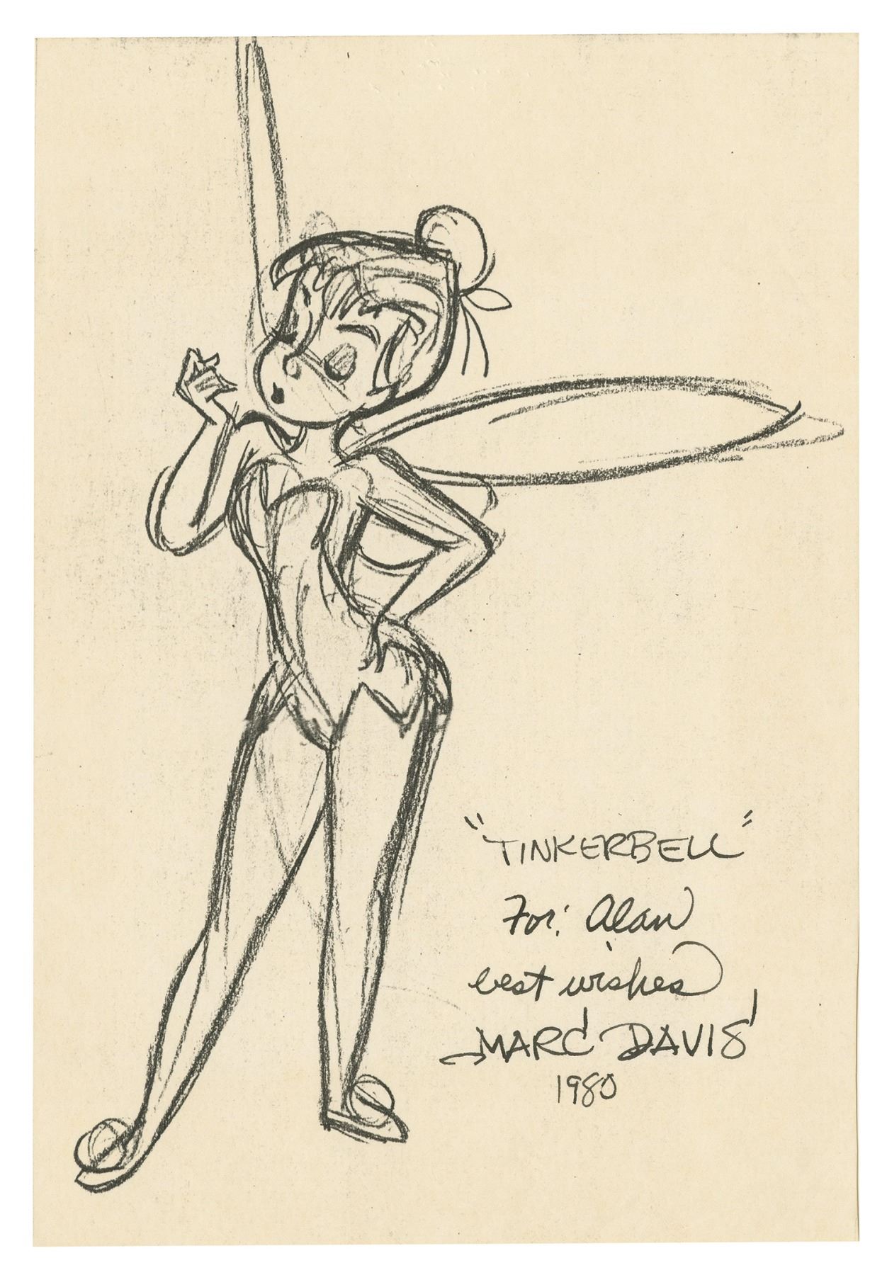 (Disney, 1980) A printed drawing of Tinker Bell by Disney Legend Marc Davis, that has been signed by Davis in ink. Davis famously animated Tinker Bell for Peter Pan, and has personalized the printed drawing for a fan Alan. Measuring 8.5"x5.75", the signed print is in very good condition.