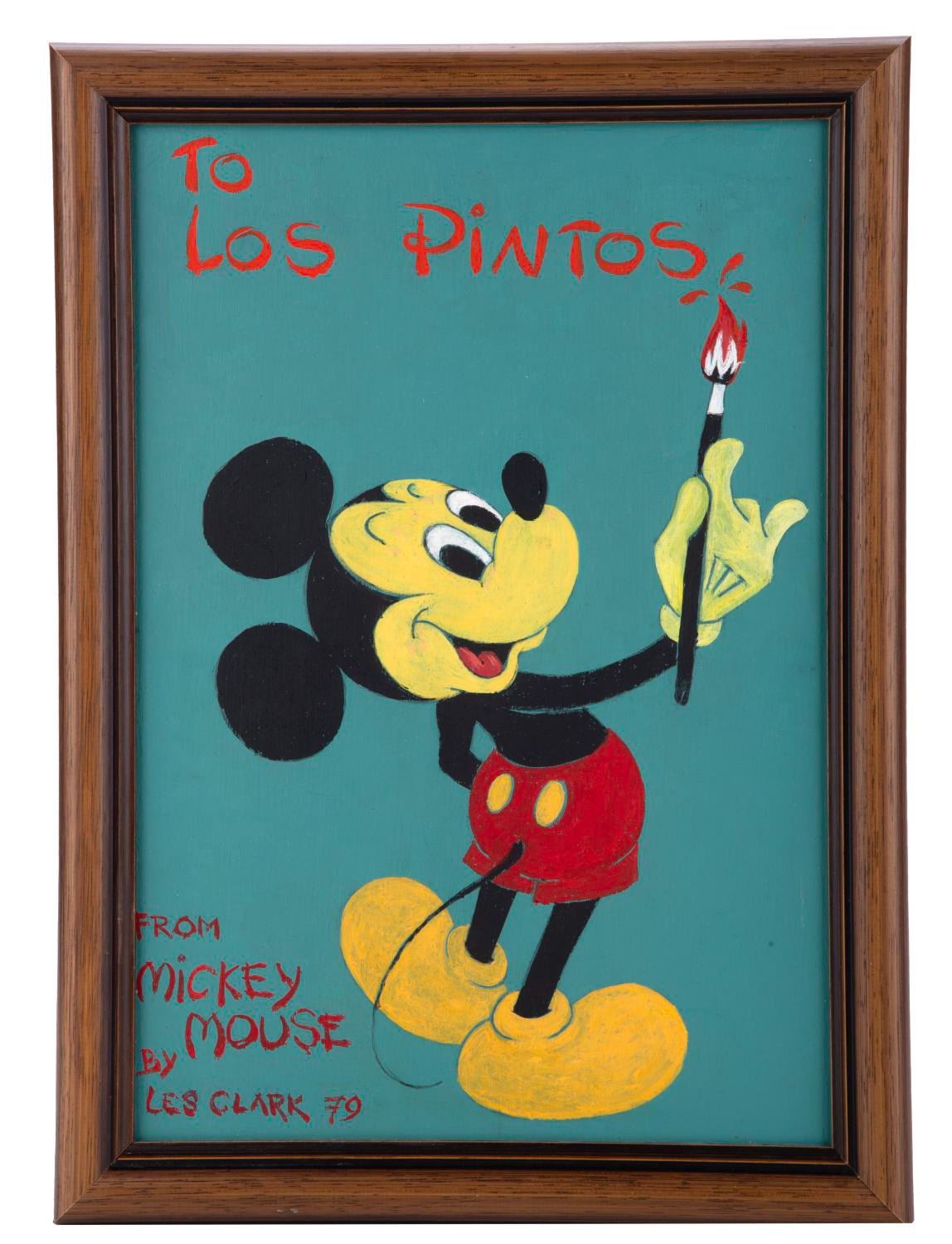 (Disney, 1979) A painting of Mickey Mouse by veteran Walt Disney Studio animator Les Clark. Les Clark was the first of Walt Disney's Nine Old Men, active from 1927 to 1975. The painting is dedicated "To Los Pintos" and was produced by the artist during the year of his passing, 1979. The piece has an image size of 12.75"x8.75" within a 10.75"x14.75" frame and is in fine condition.