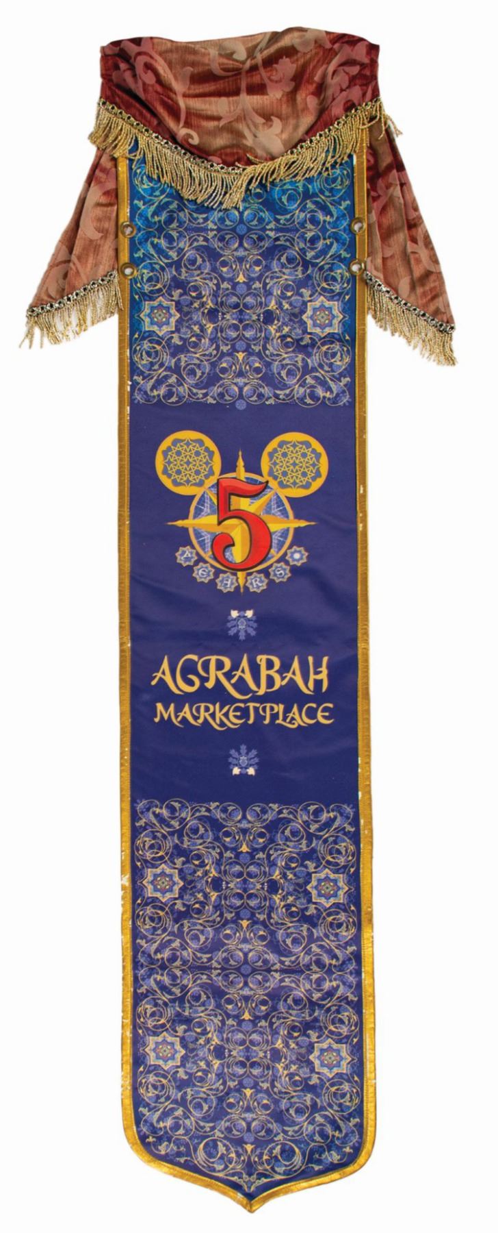 (Tokyo DisneySea, 2006) An original park-used 5 Year Anniversary banner from the Agrabah Marketplace in Tokyo DisneySea's Arabian Coast port-of-call. The banner is equipped with plastic grommets on both sides and an additional two holes at the top for hanging. Measuring a full 53”x11”, the piece is in good condition. It exhibits delamination and surface loss to the faux leather trim and some wear from outdoor exposure.