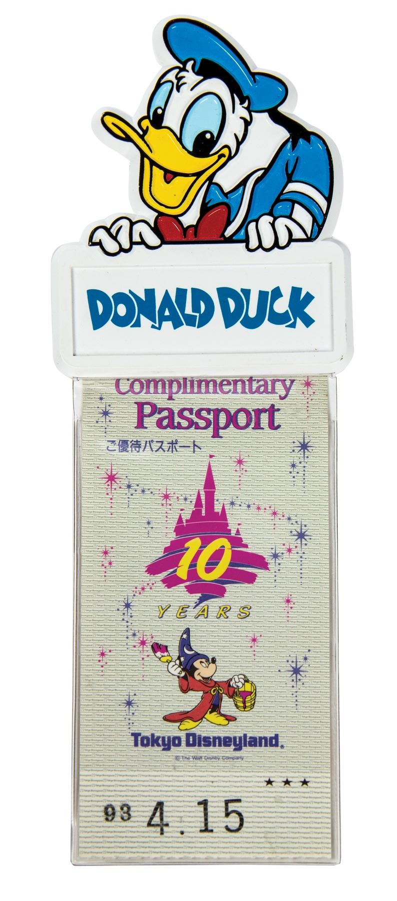 (Tokyo Disneyland, 1993) A 10-year anniversary complimentary passport for Tokyo Disneyland. The Donald Duck holder contains the inner passport and has a safety pin on the reverse for wearing. Measuring 8.25"x3", the passport is in very good used condition with minor wear.