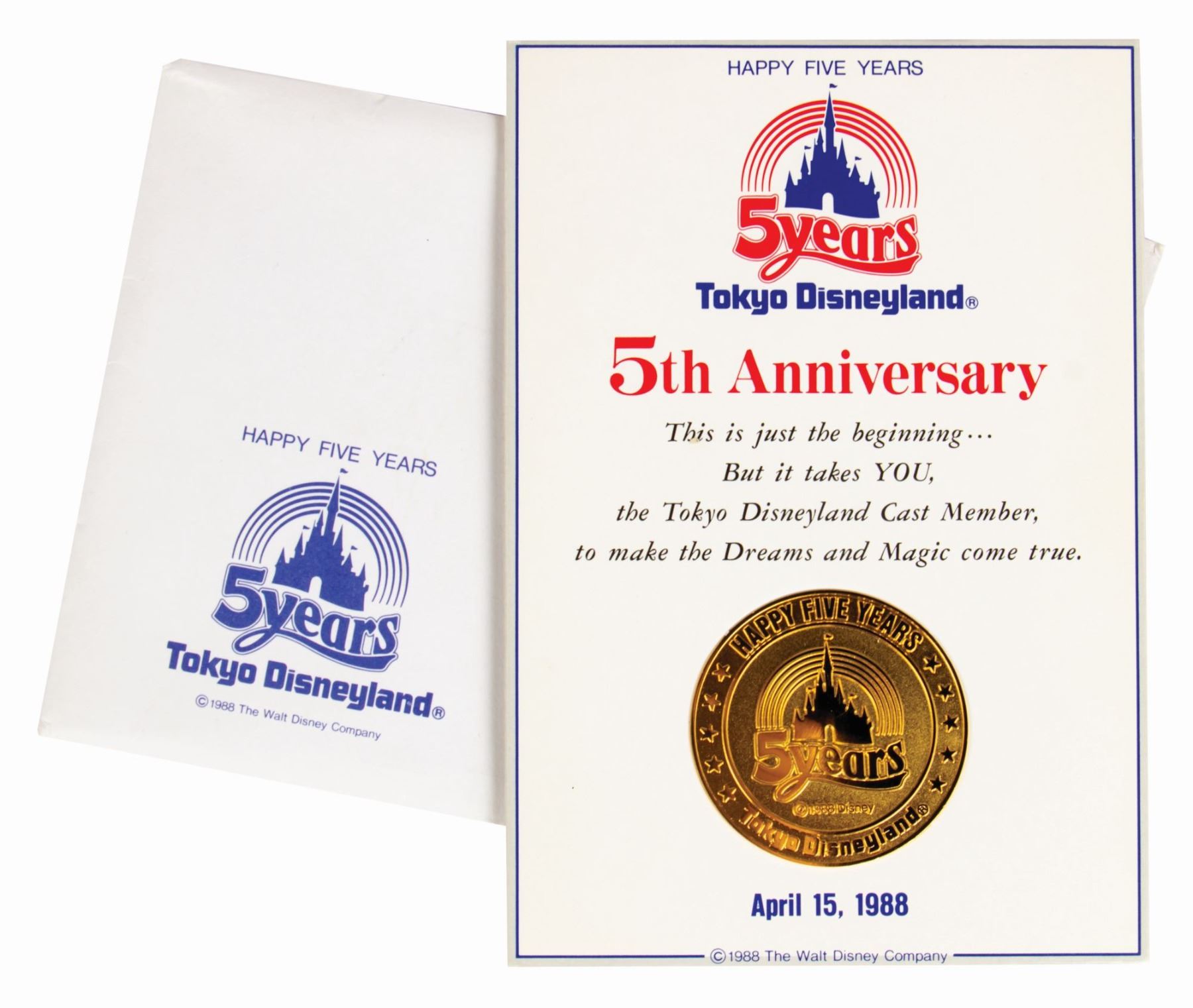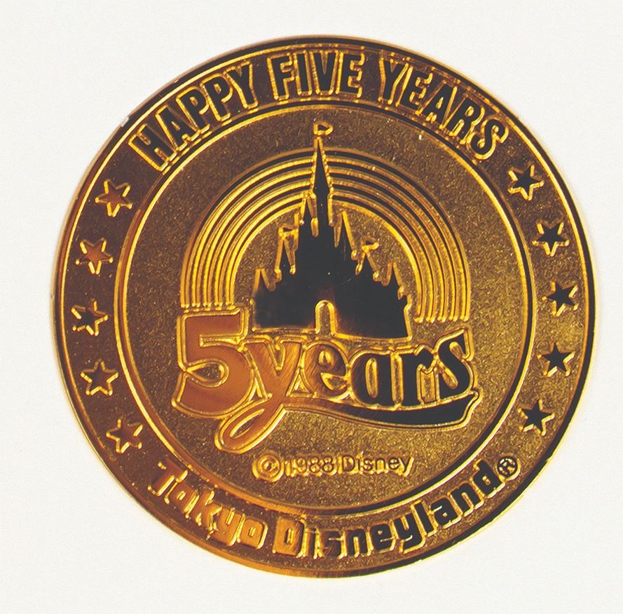(Tokyo Disneyland, 1988) A special medallion created to commemorate the 5th anniversary of Tokyo Disneyland in 1988. The medallion features Cinderella Castle on the front with Mickey Mouse imagery on the reverse and is encased within a cardboard frame with a built-in stand. Measuring 1.75" in diameter, the medallion is in very good condition.