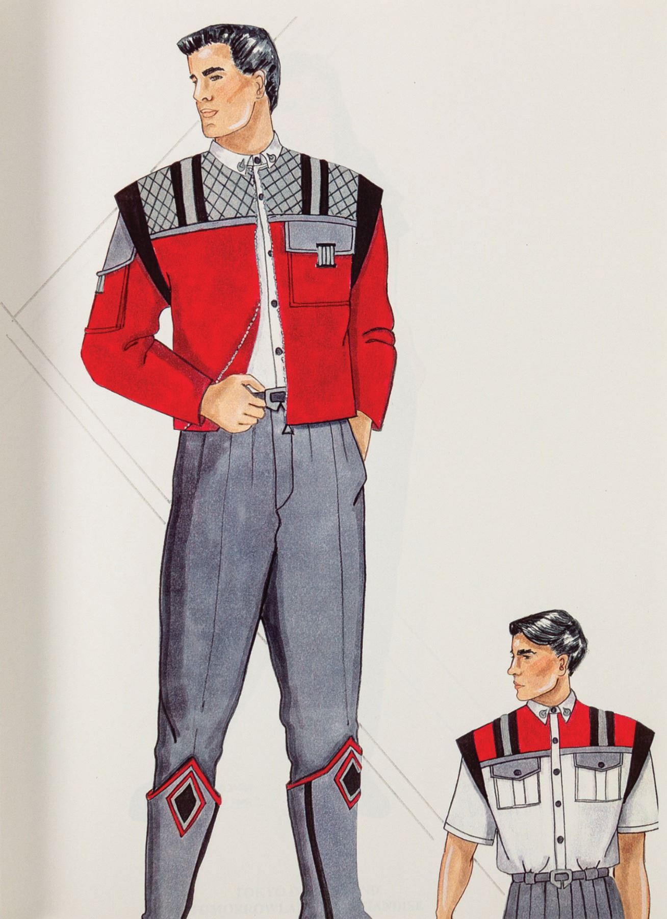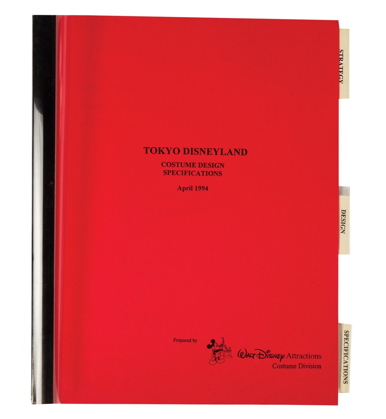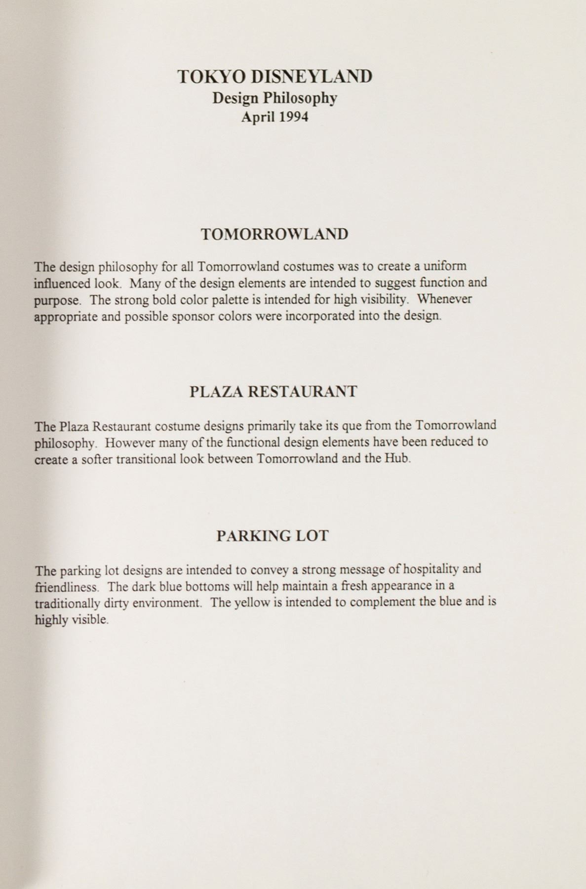 (Tokyo Disneyland, 1994) A report featuring costume design specifications for the cast members at Tomorrowland, Plaza Restaurant, and the parking lot at Tokyo Disneyland. The book contains a brief description of the costume design philosophy for each location and (7) different male and female costume designs. Measuring 8.5"x11", the book is in fine condition with light handling and surface wear.