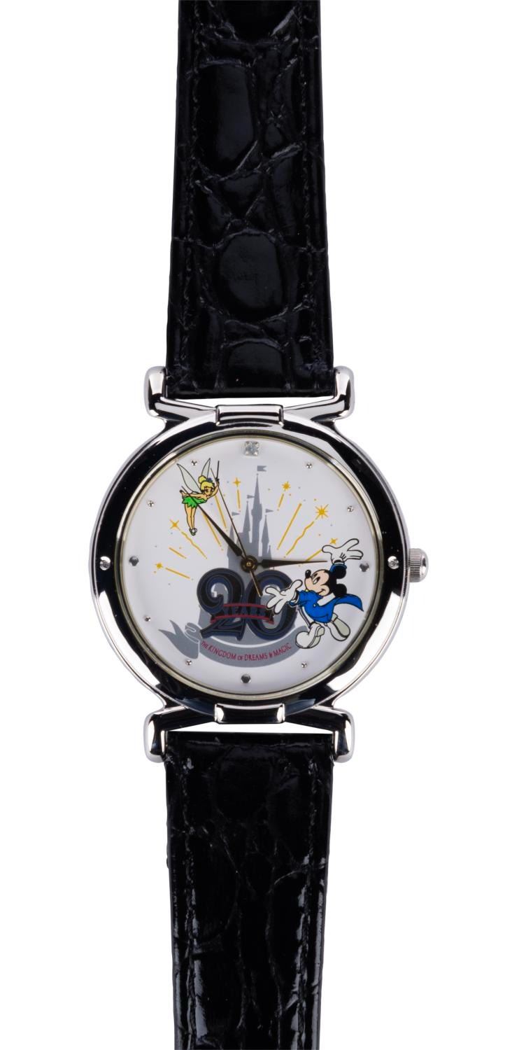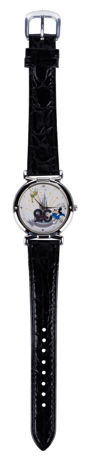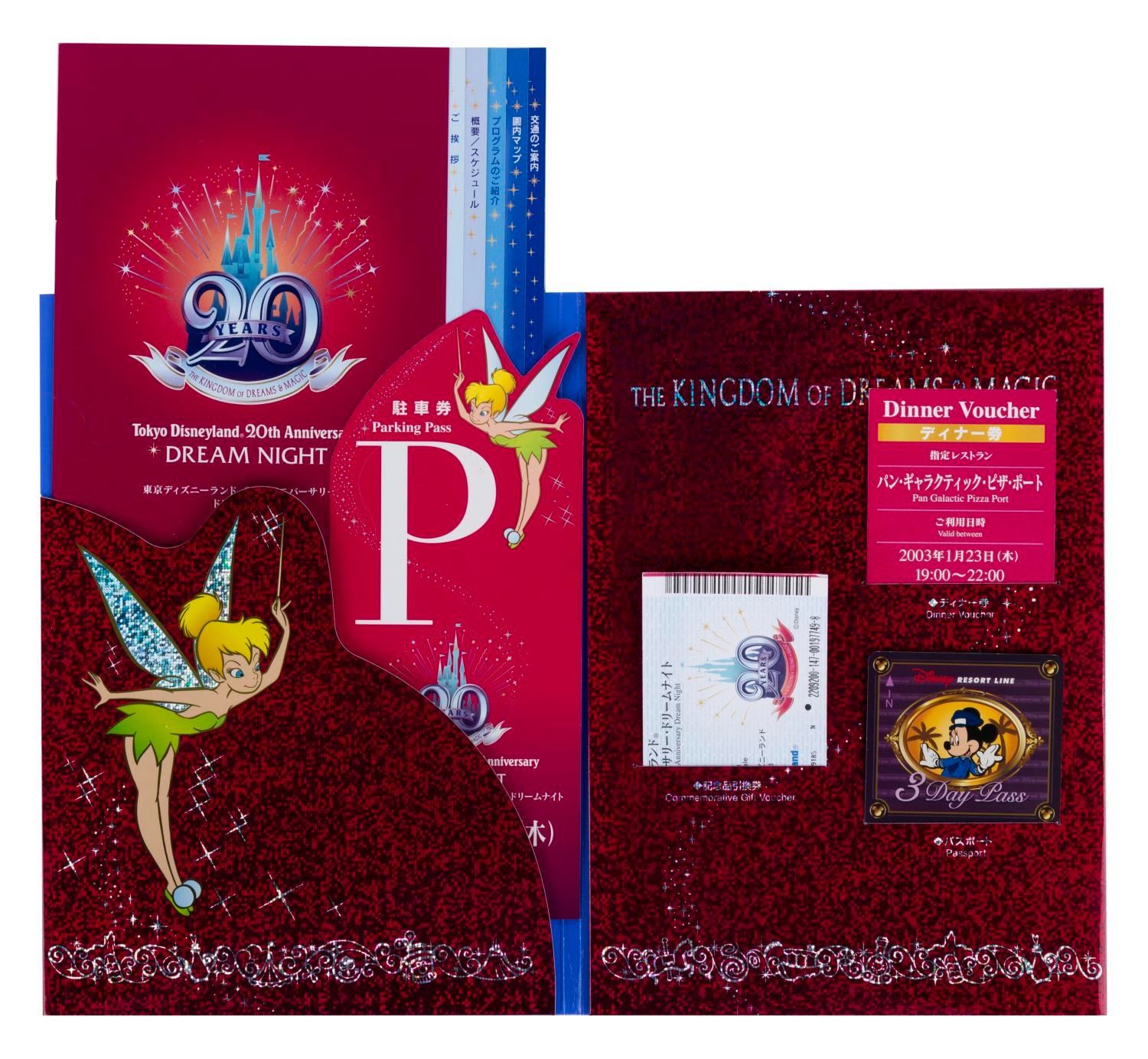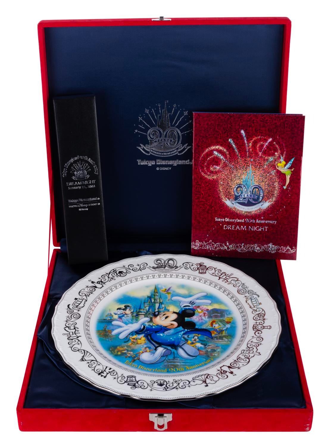 (Tokyo Disneyland, 2003) A Tokyo Disneyland 20th anniversary watch, plate, and tickets celebrating Dream Night at Tokyo Disneyland Resort. The passport portfolio contains a passport, commemorative gift voucher, dinner voucher, parking pass, and souvenir guide. The timepiece measures 1.5" in diameter on a 9.25" long band, the plate is 12" in diameter, and the passport portfolio measures 6.25" x 8.5". Each piece is in fine condition in its original package.