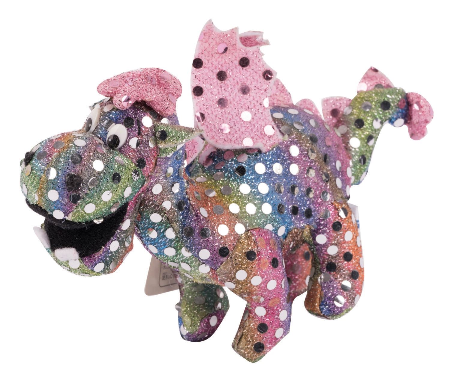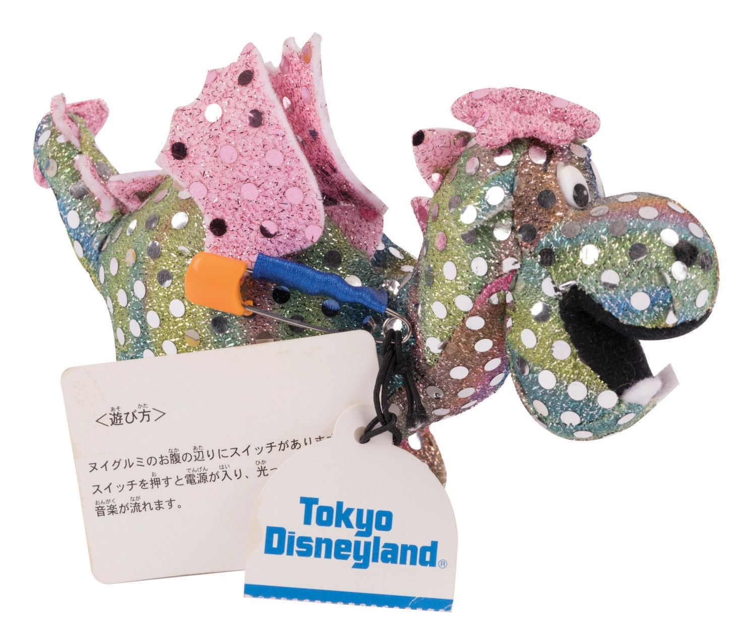 (Tokyo Disneyland, 1980s-90s) A souvenir Elliott the Dragon plush created to be worn as a badge during the Electrical Parade Dreamlights at the Tokyo Disneyland Resort. Measuring 4" tall, the plush is in very good condition with an internal sound function that no longer works and the original tags attached.