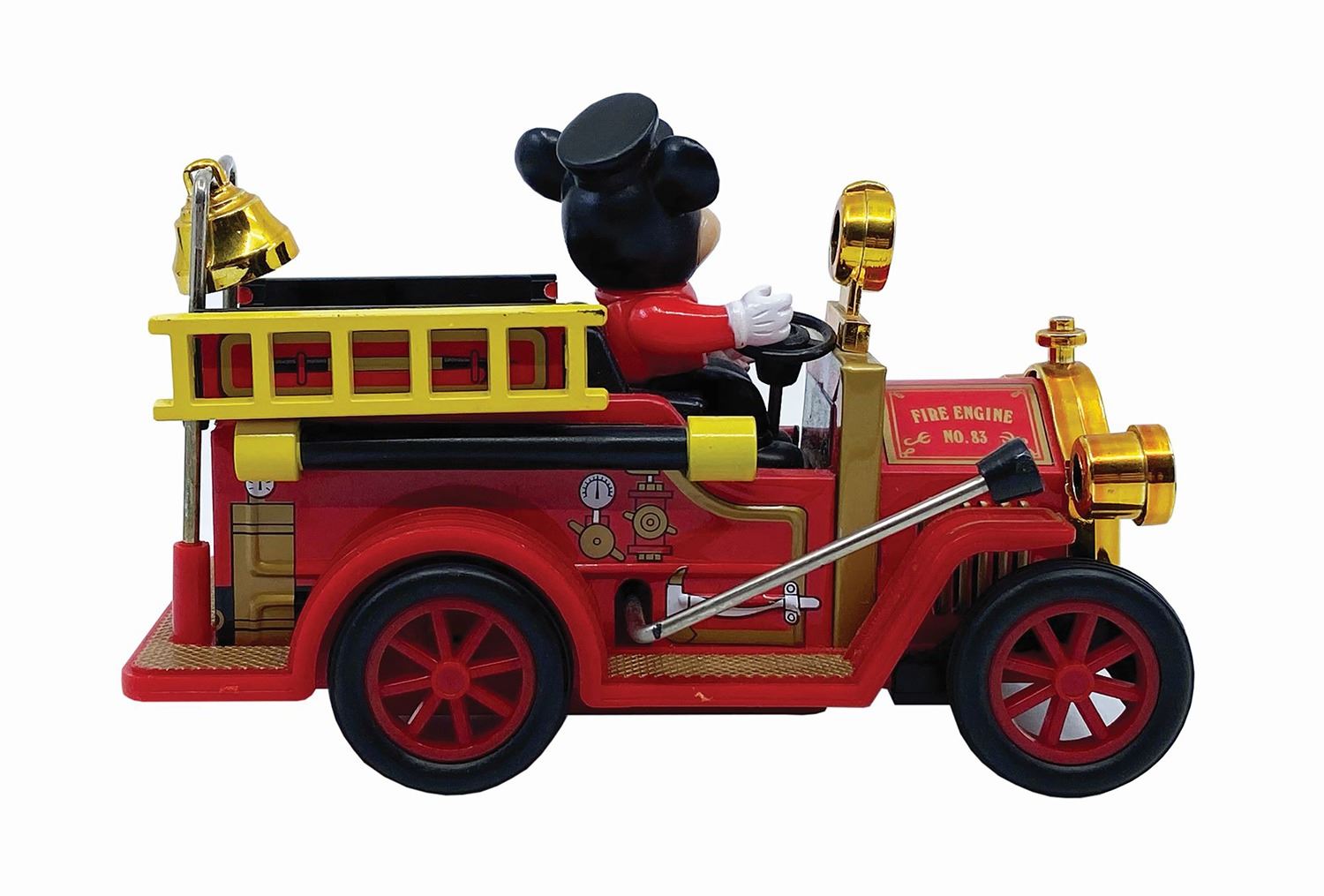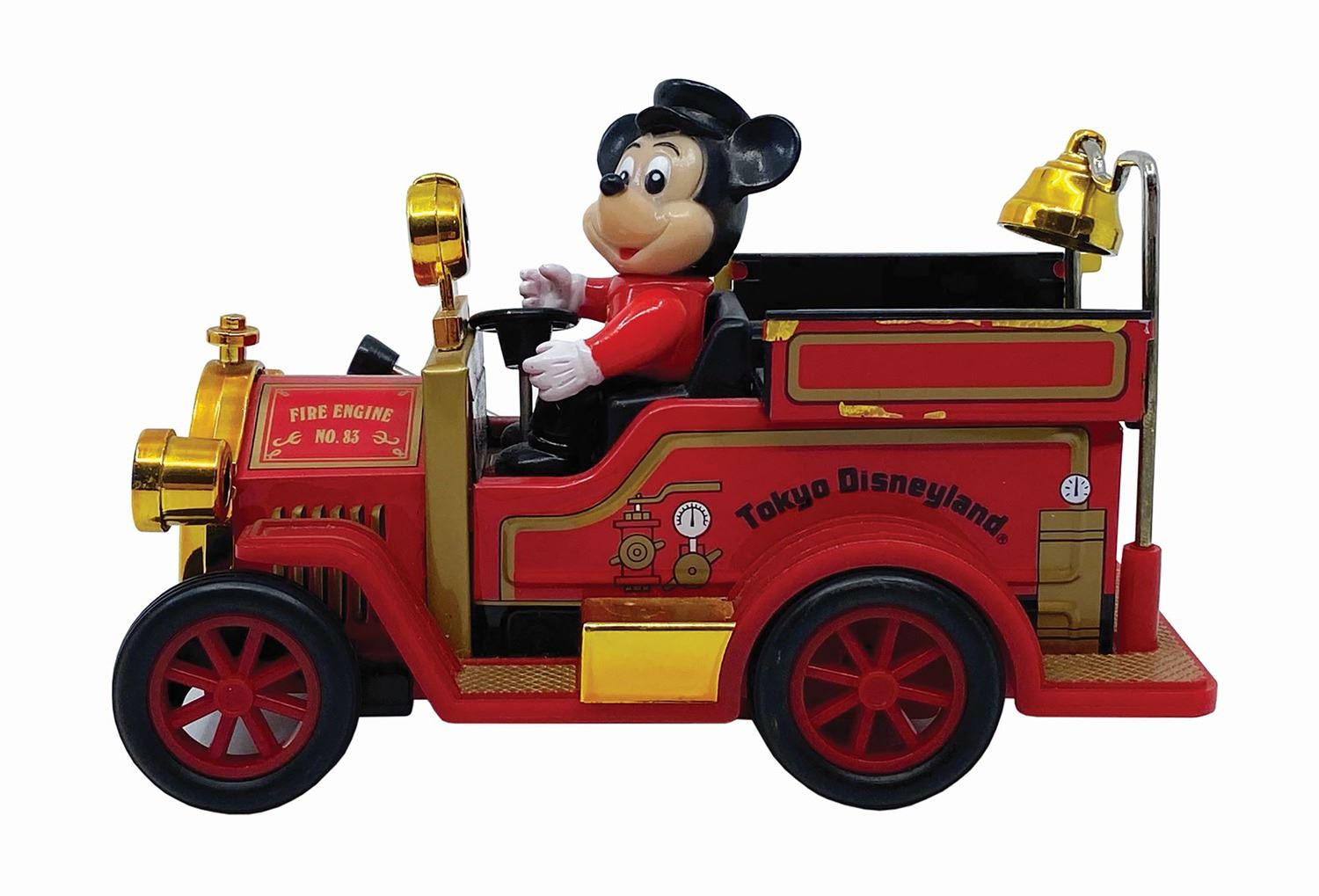 (Tokyo Disneyland, c.1987) A vintage Tokyo Disneyland fire engine toy with Mickey as the driver. The tin and plastic toy has a lever which will propel the car forward when pulled. Measuring 4"x5.75", the toy is in fair condition with a few small pieces missing from the toy, as well as some wear to the painted sections from age.