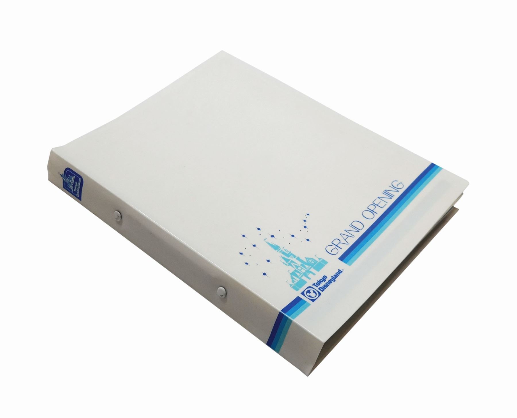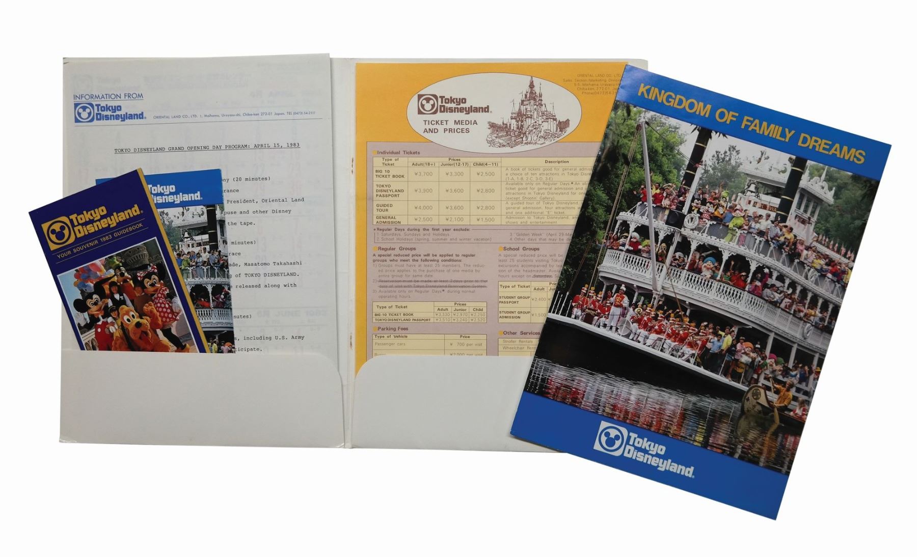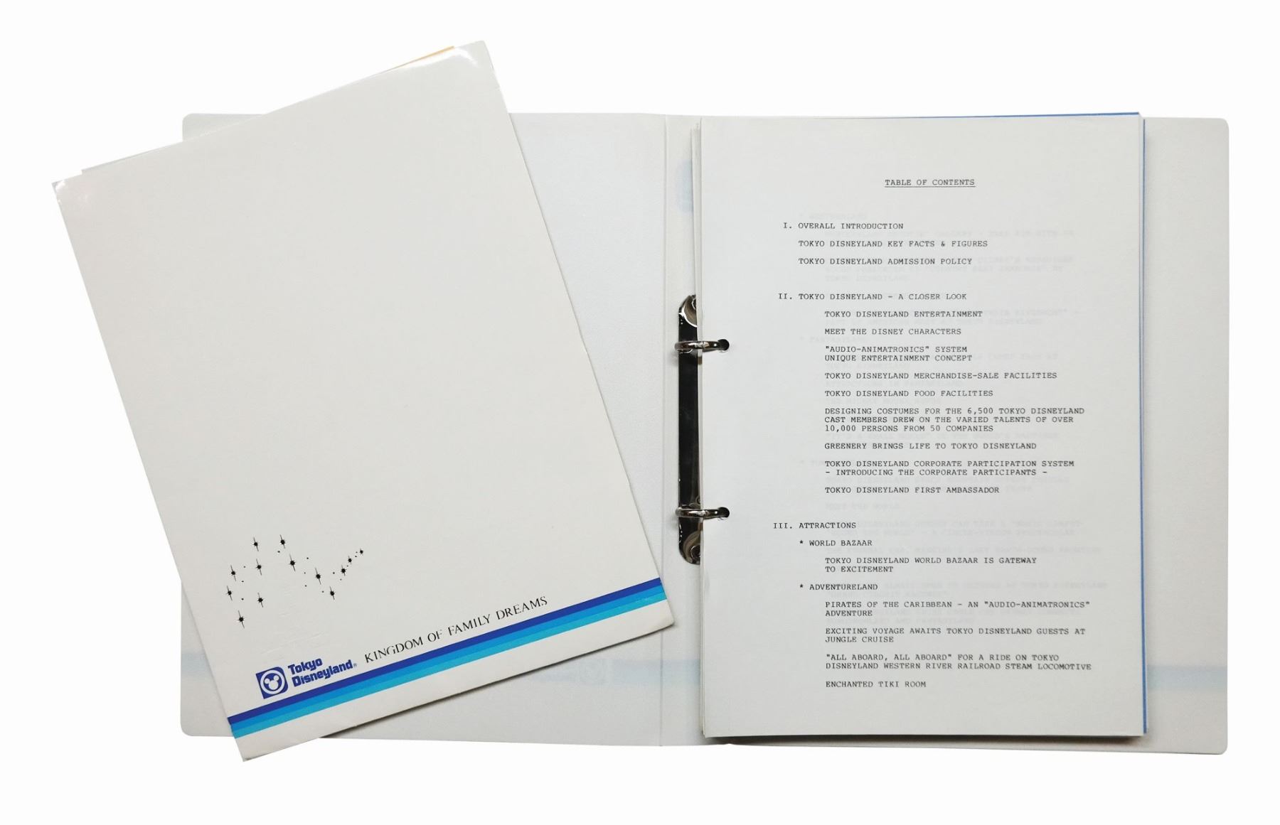 (Tokyo Disneyland, 1983) An opening day press kit, complete with press folder and binder. This impressive set includes information on ticket prices, a guidebook, press releases, and other materials to show the press everything the park has to offer. Measuring 12.25"x9.5", these materials are in very good condition with some wear from age and use.