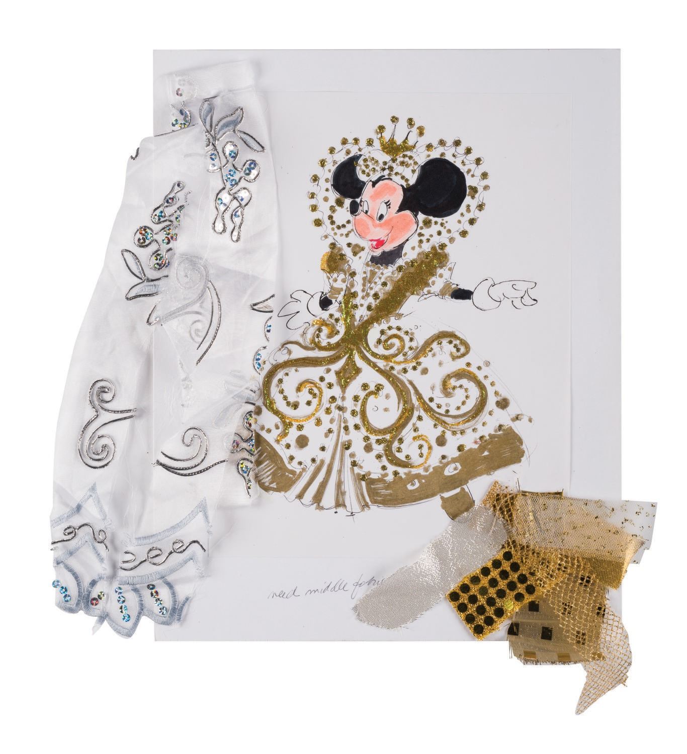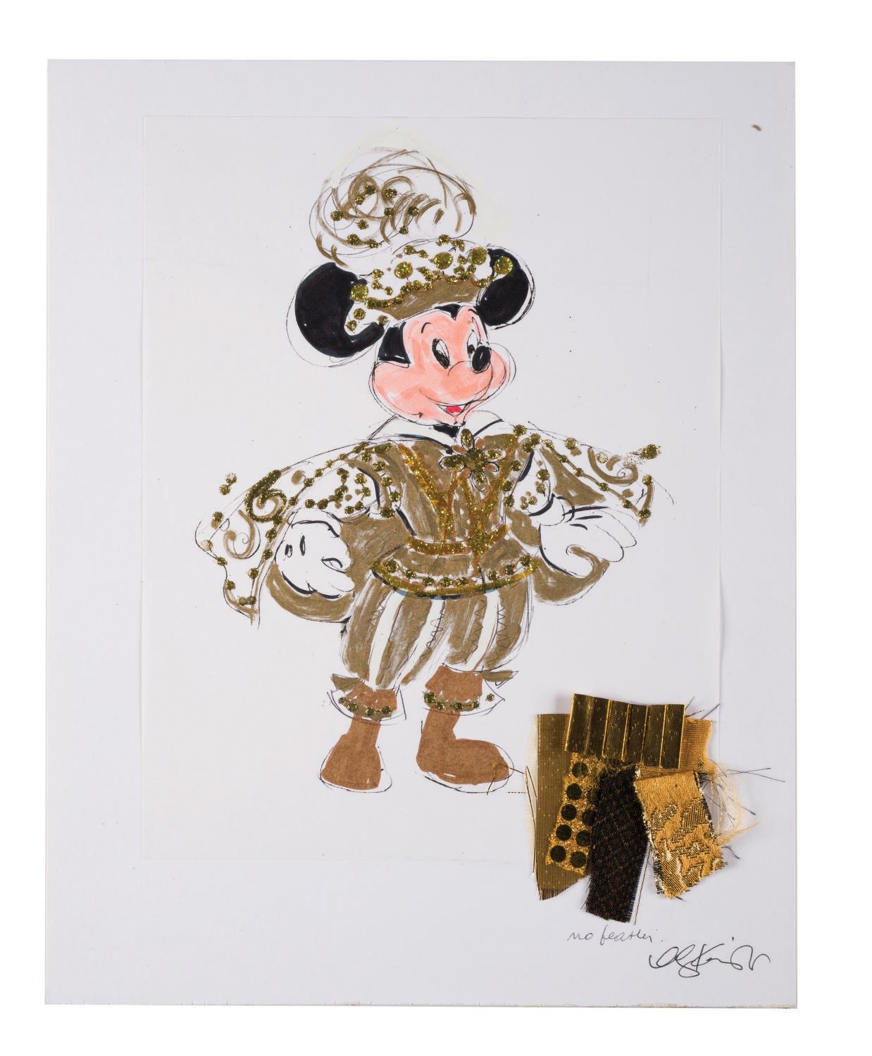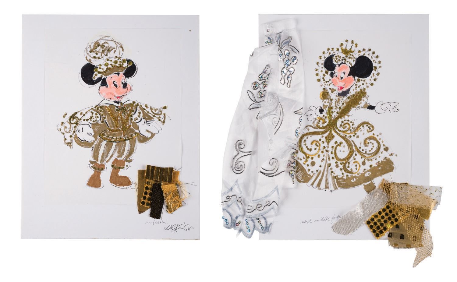 (Disneyland, 1988) A pair of original character overdressing designs by artist Alyja Kalinich. Accomplished in graphite, ink and marker with suggested fabric samples attached, the designs were for a show at Tokyo Disneyland. Each design is on 8.5"x11" drawing paper mounted to 11"x14" cardstock. Both are signed by the artist and in very good condition with expected wear from age and use.