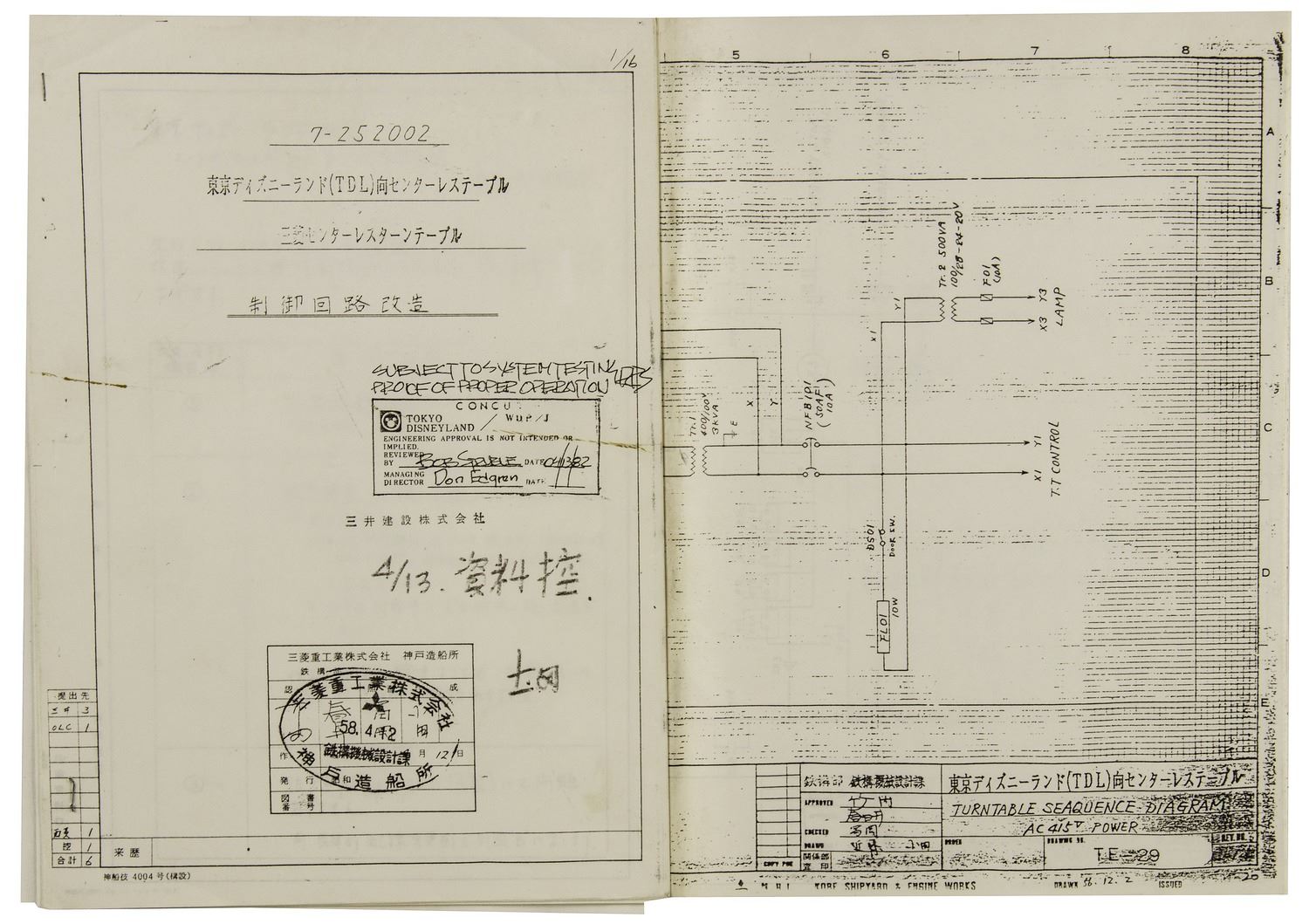 (Tokyo Disneyland, 1982-83) A set of WED Imagineering documents containing ride specifications for the "multi-use" controls at Tokyo Disneyland. This set includes (27) packets containing over 100 pages of diagrams and information used in the development of various multi-use control boxes and systems. Each sheet measures approximately 11"x8.5" and the set is in overall very good condition with minor wear from use. The title page for most of the packets is stamped in red ink with the WED "Reference Copy" stamp and date stamp.