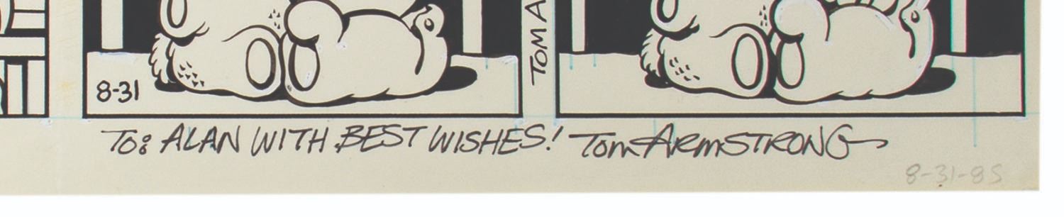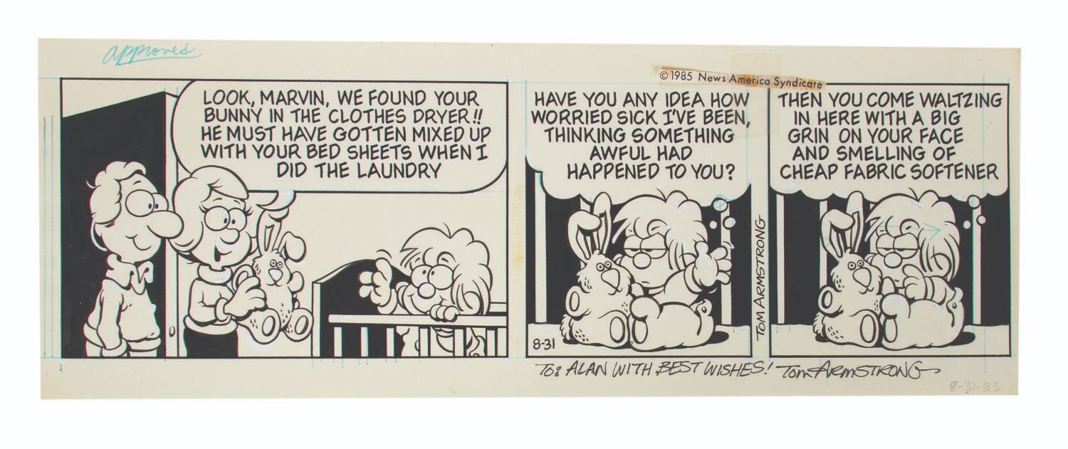 (News America Syndicate, 1985) An original comic strip for Marvin by Tom Armstrong. This hand-inked strip is likely the final draft, as it still features visible blue preliminary line work underneath the black ink and is marked "Approved" at the upper left and "8-31-85" at the lower right. The strip has been signed by Armstrong with the note, "To: Alan with best wishes!" Measuring 5.25"x14.5", the strip is in very good condition with minor handling wear. There is a crease down the center from prior folding, and slight glue residue along the crease where the copyright information was formerly glued.