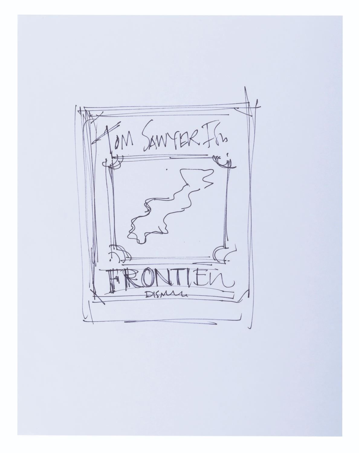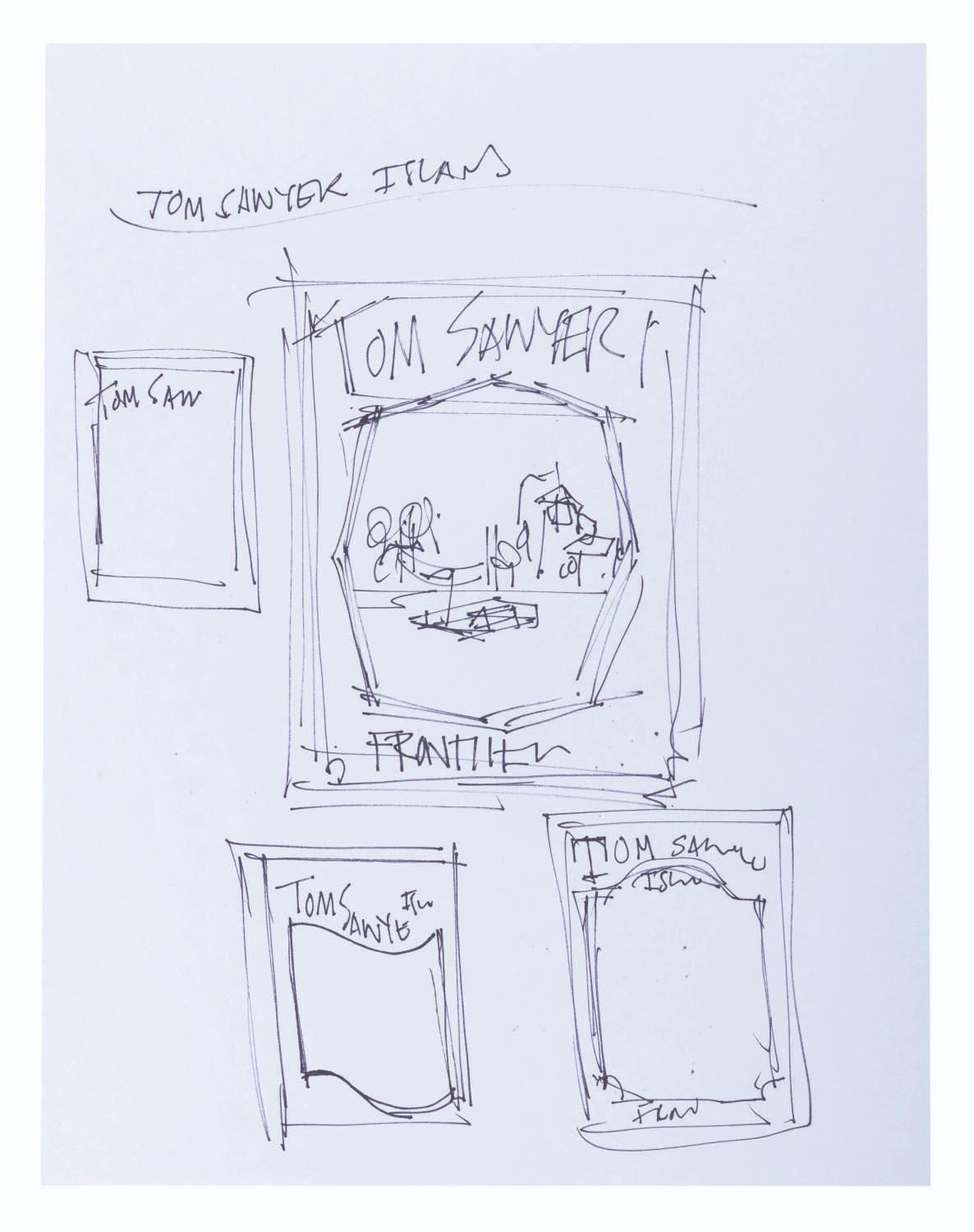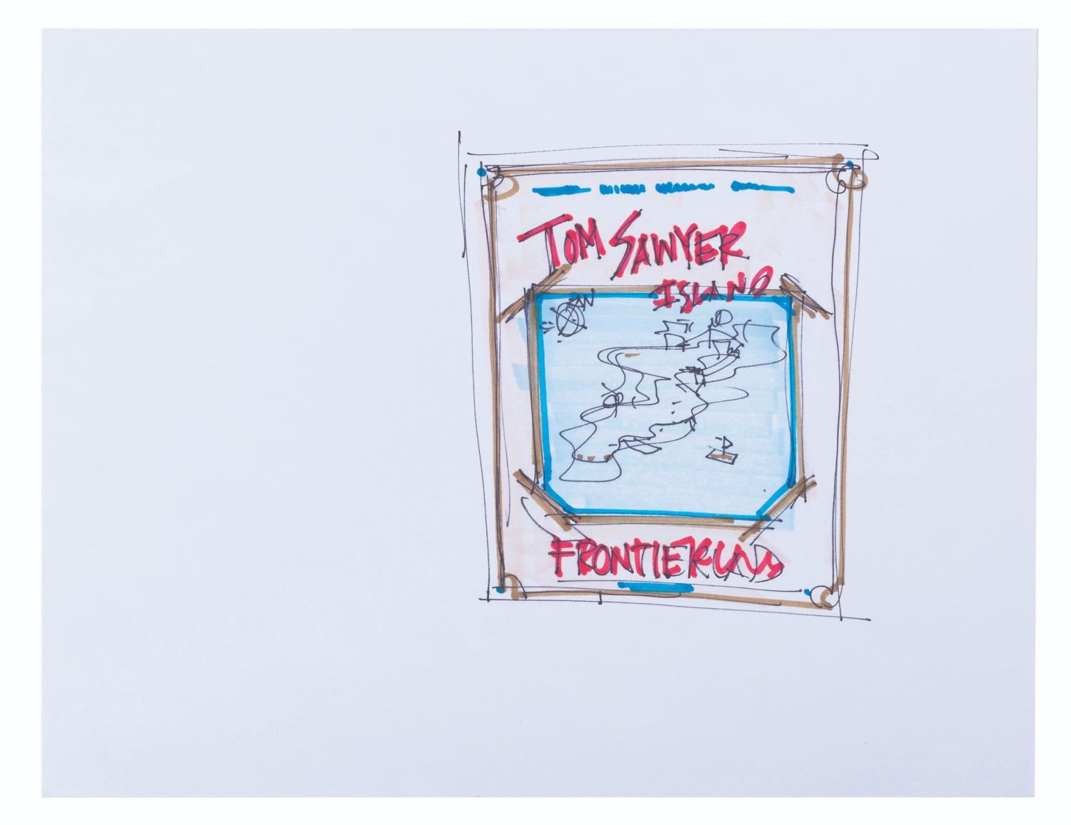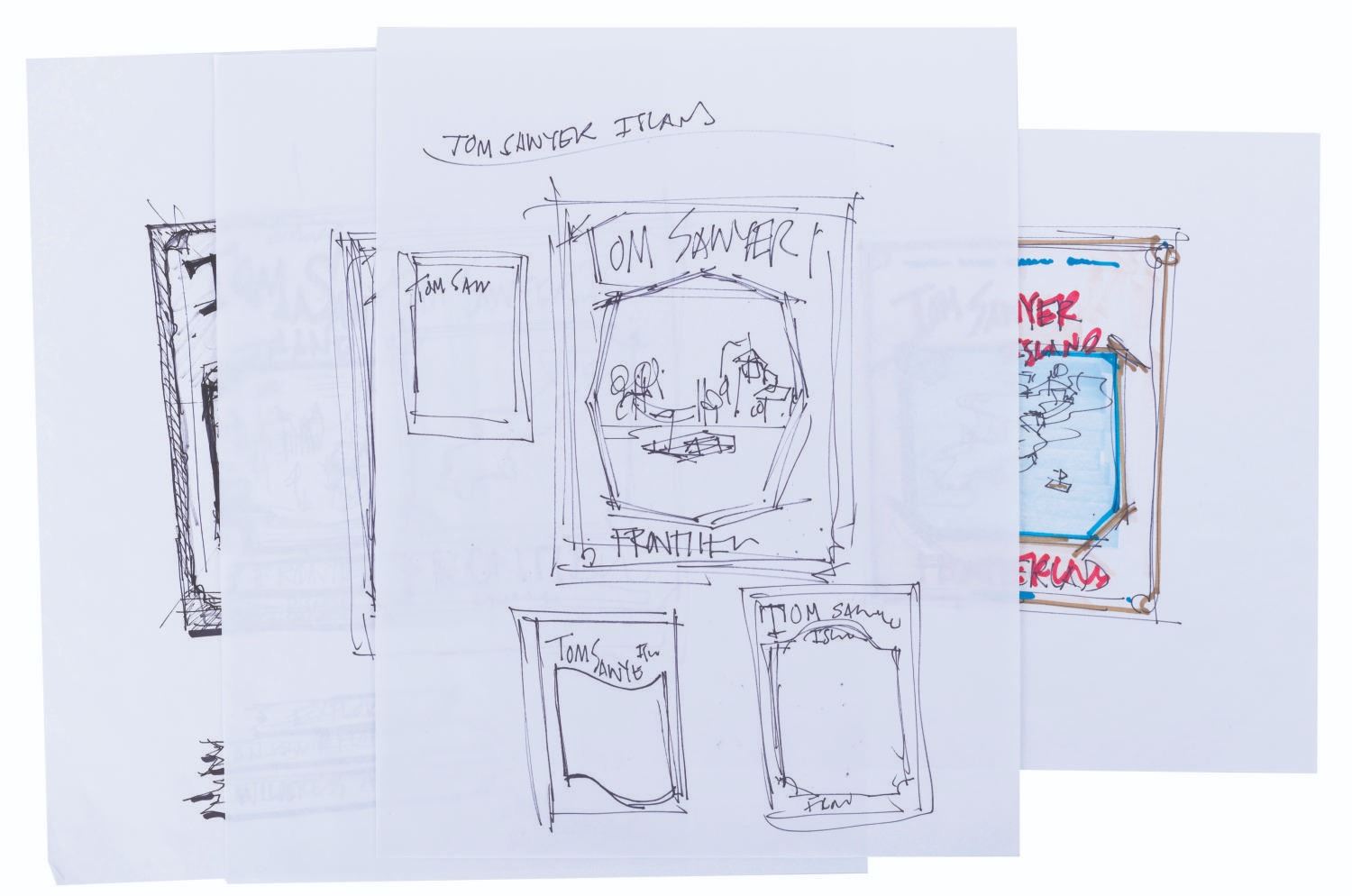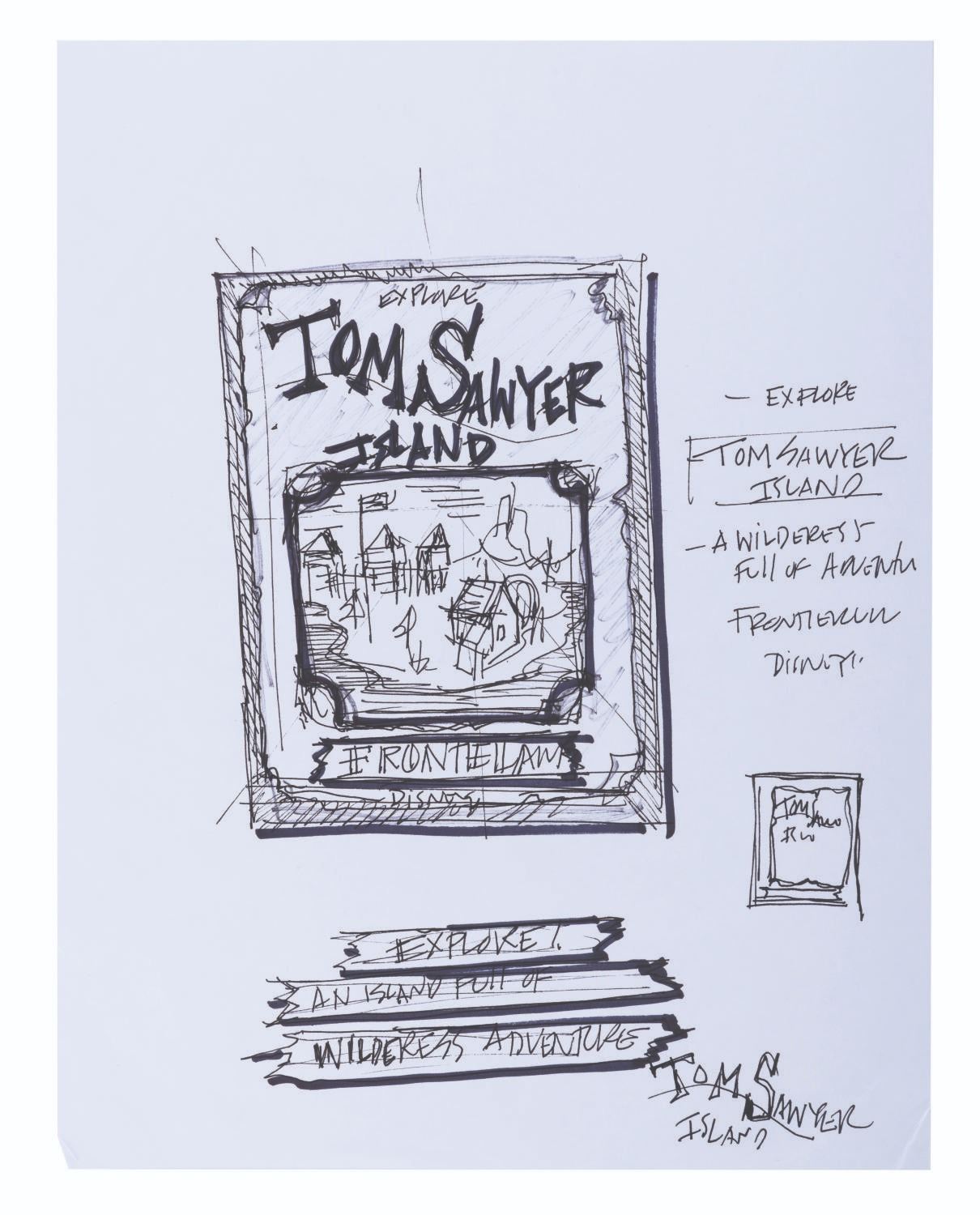 (Disneyland, 1980s-90s) A collection of four papers featuring rough concept drawings for new Tom Sawyer Island attraction posters. Measuring 8.5" x 11", each page of artwork is in very good condition with light wear from handling and age.